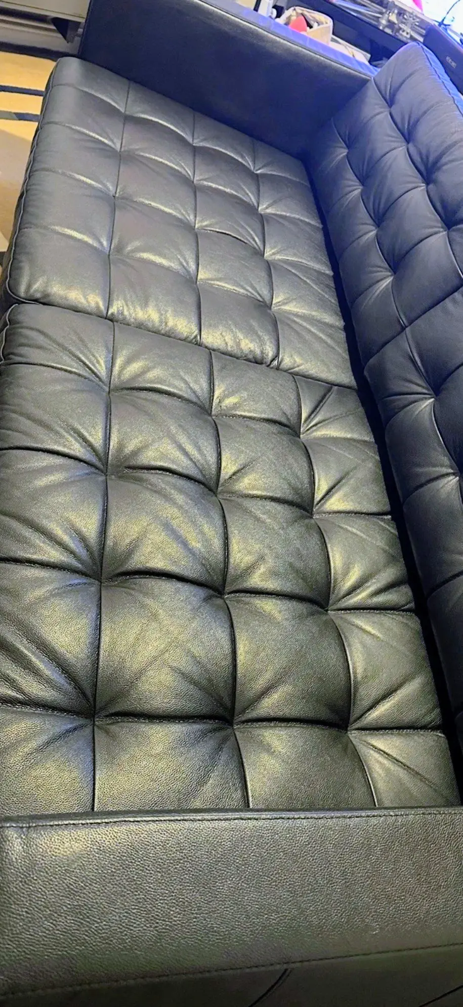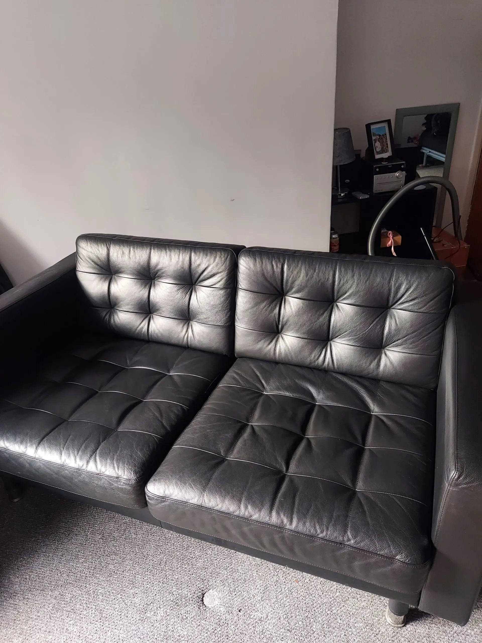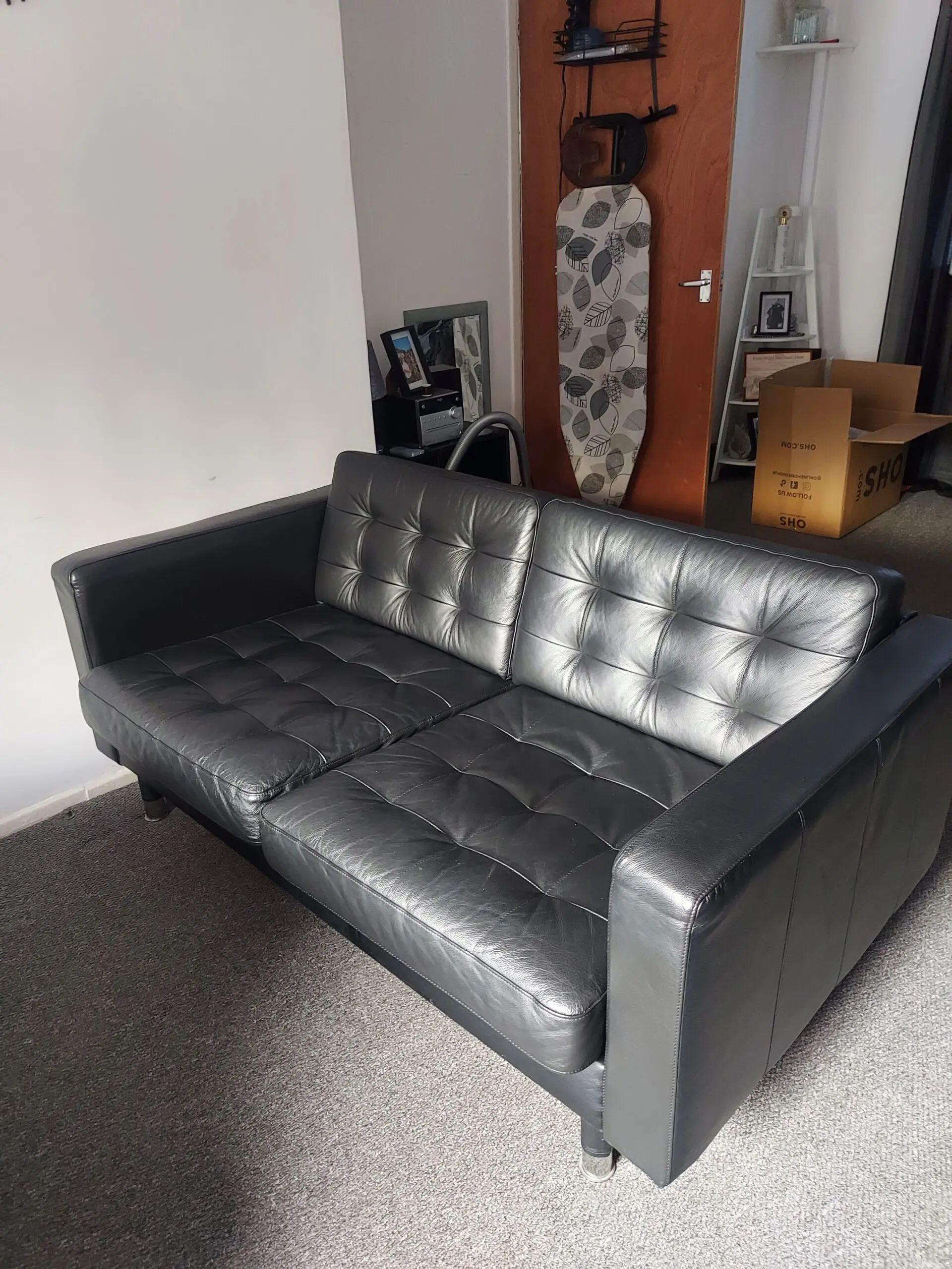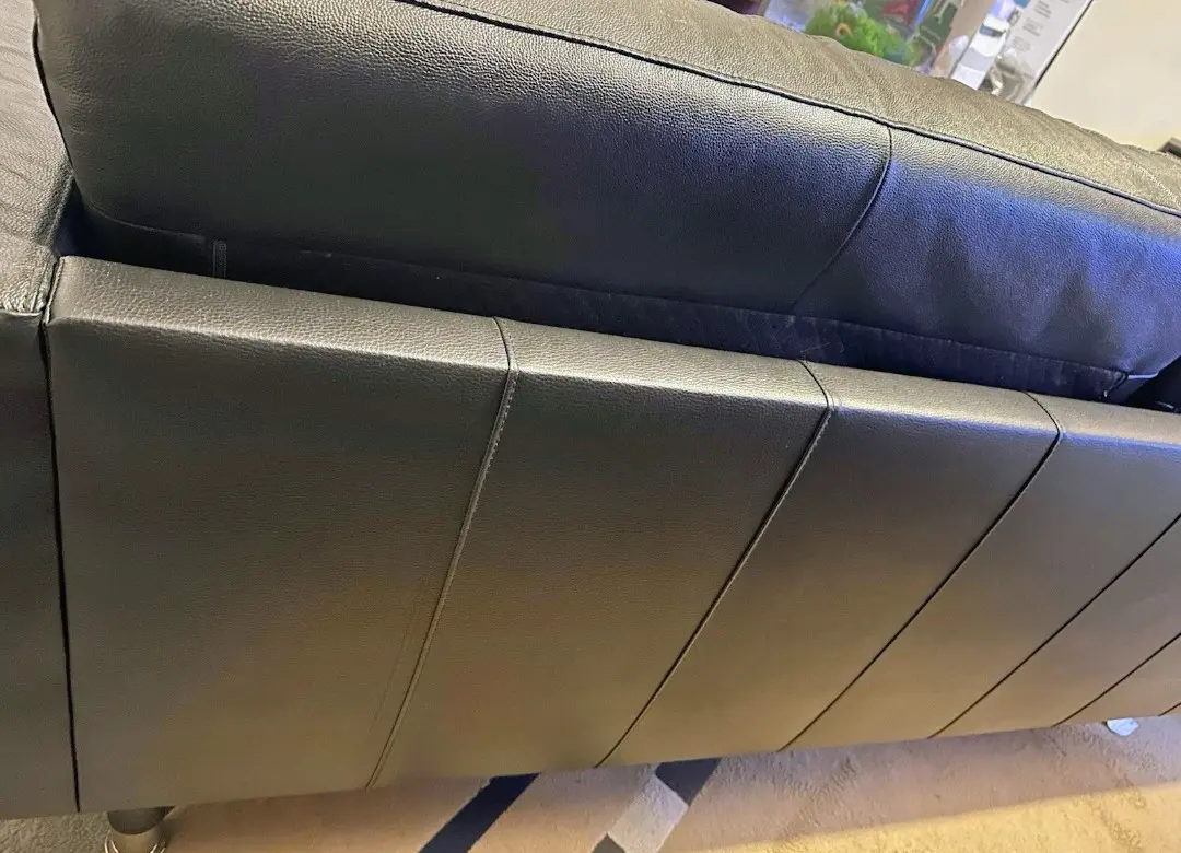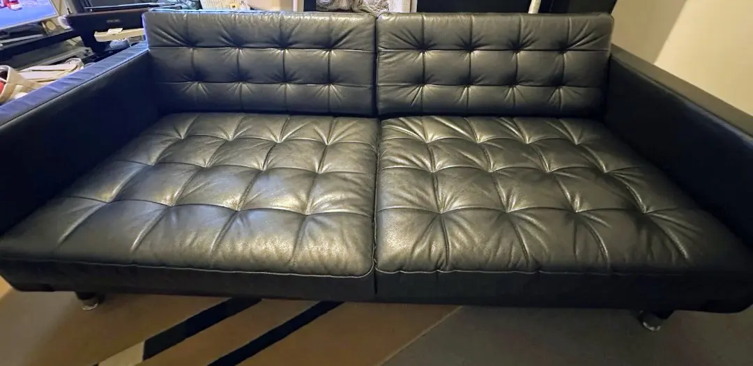 Excellent condition three-seater black leather sofa by IKEA is a stylish and modern piece of furniture perfect for the living room or home office. With a sleek design and mid-century modern back style, this sofa offers a comfortable seating experience with medium firmness. The polyurethane fill material and leather upholstery provide durability and a luxurious feel. Assembly is required, but no additional parts are needed. The black frame and armrests complement the overall modern style of the sofa, making it a versatile and practical addition to any space. It is fully assembled, it has polished chrome legs that can be removed so it’s easy transport .