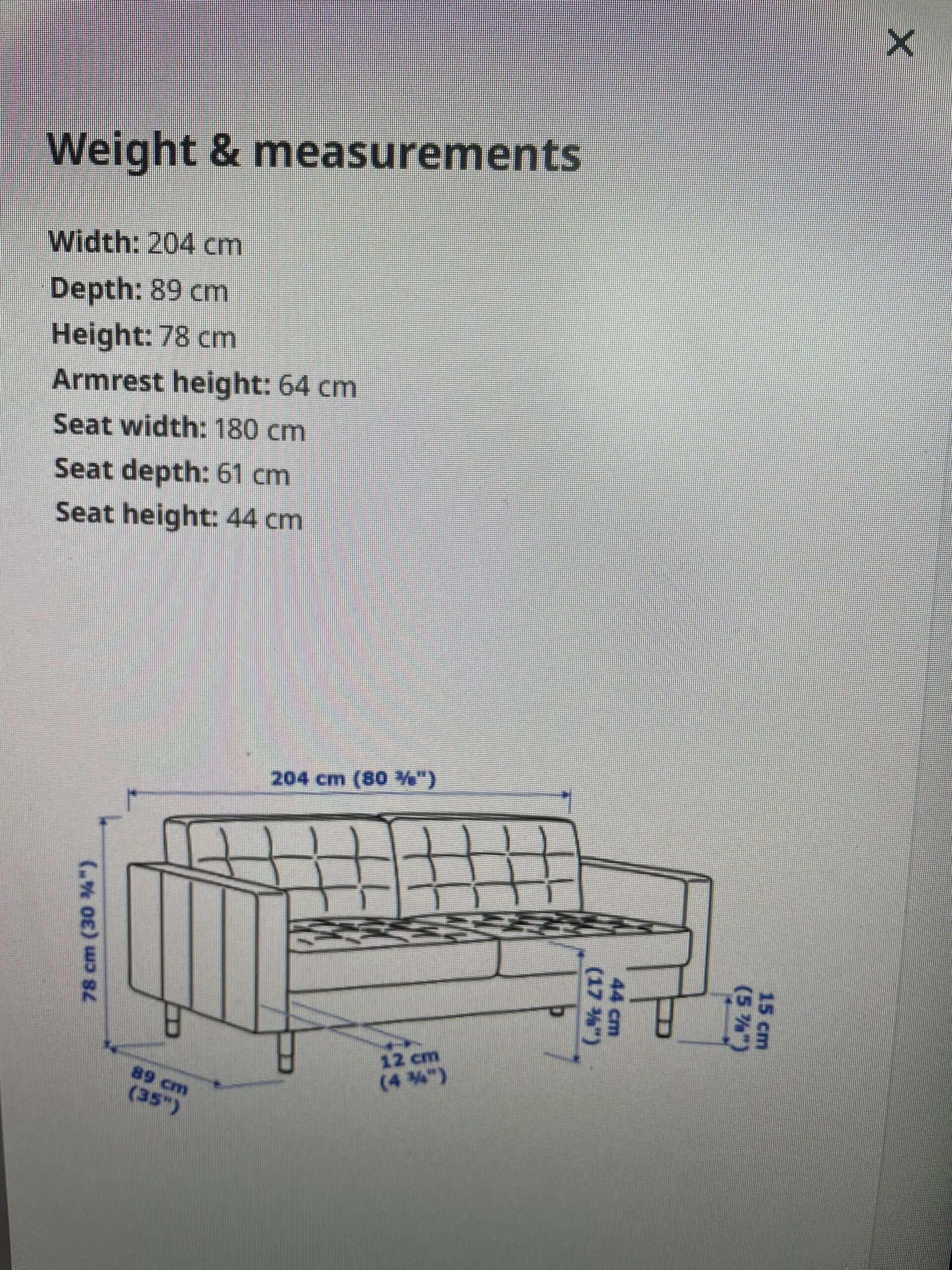 - 3-Seater: 204cm (W) × 89cm (D) × 78cm (H)