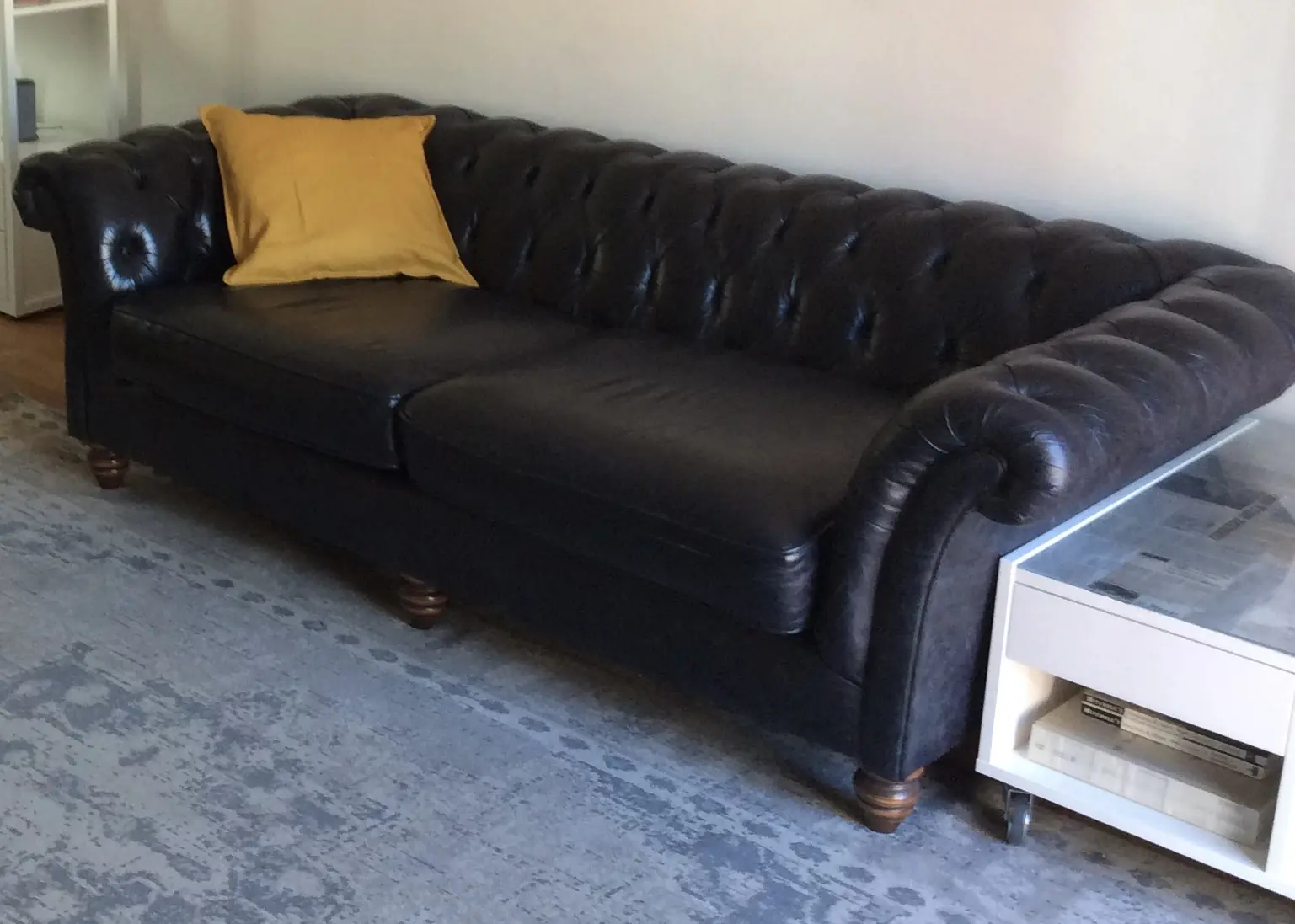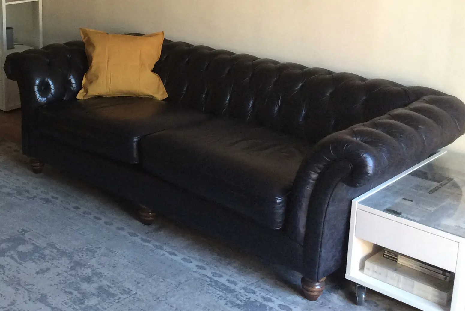 3-Seater inky-black coloured chesterfield. In good condition and selling it as I’ve changed the design scheme in my flat.