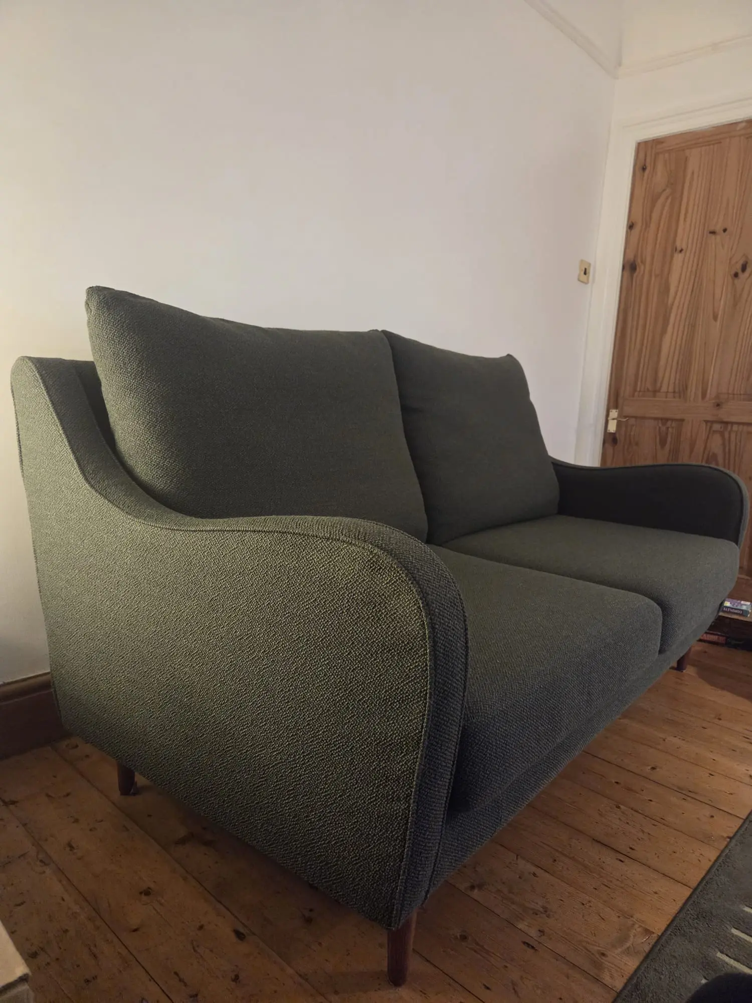 ‘Harp’ from John Lewis – This eye catching, classic nd timeless 3 seater sofa is upholstered in olive green twisted bouclé fabric. Purchased 2022 it is in excellent condition from a smoke & pet free home.