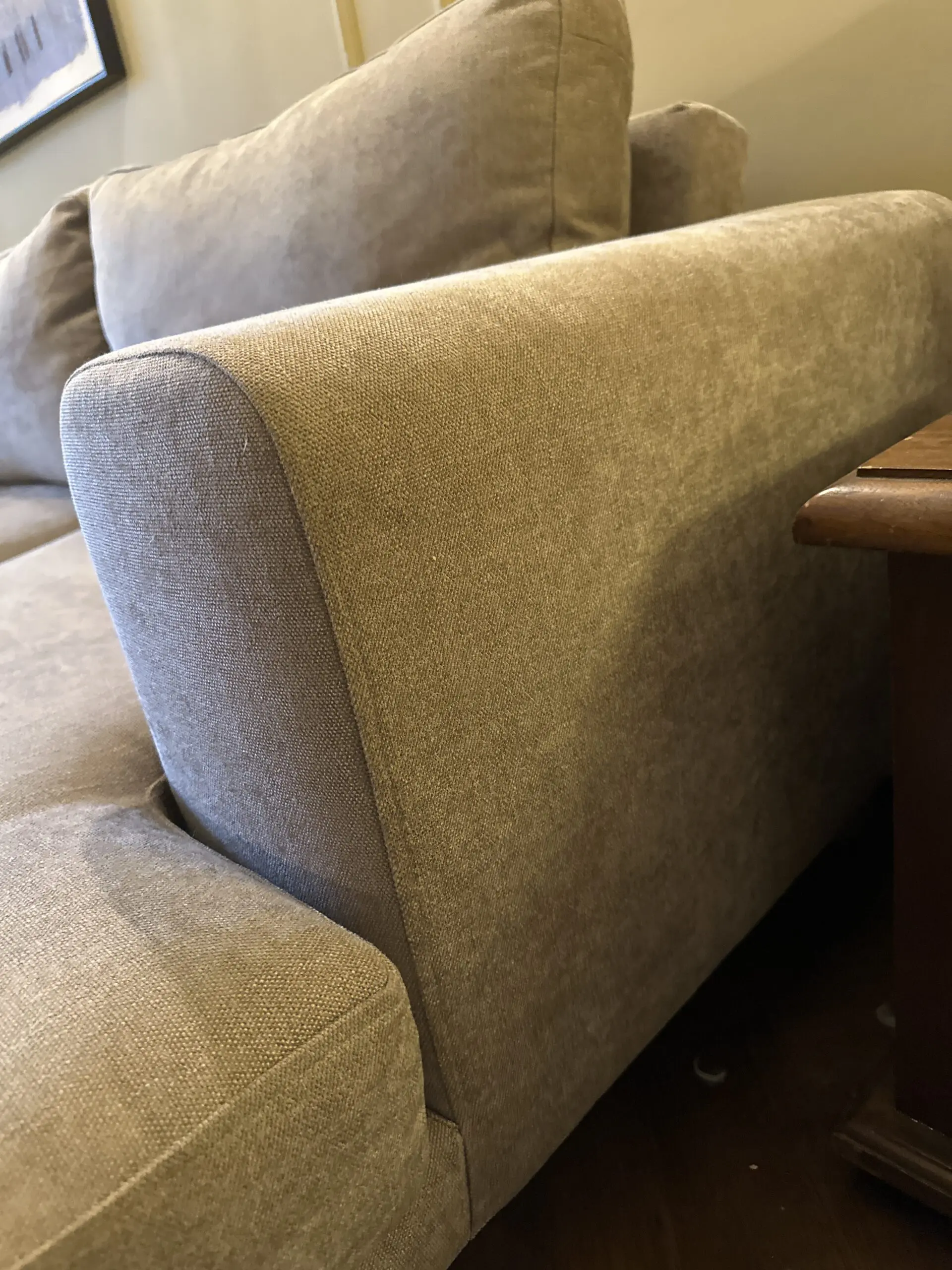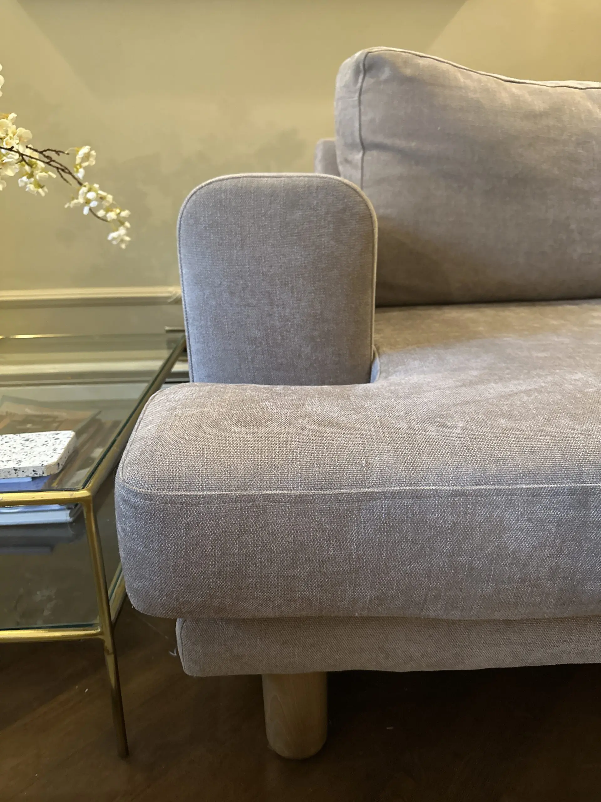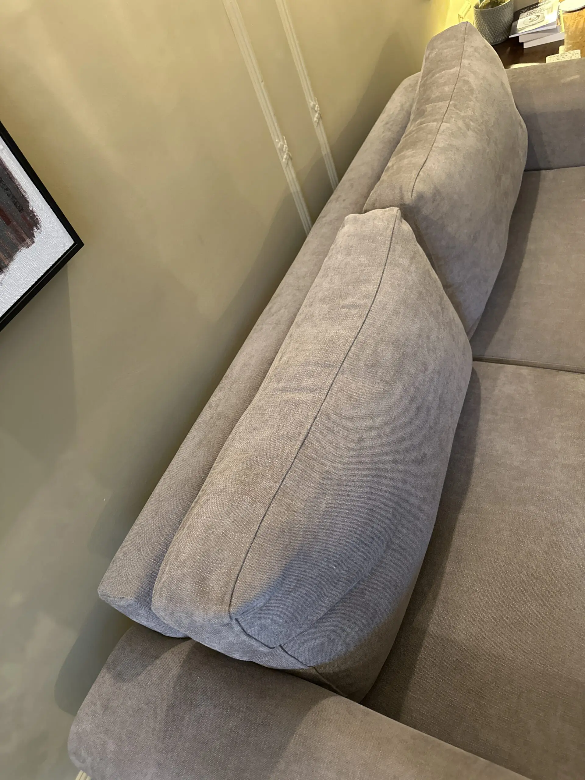 Neutral colour, chunky seat and back cushions with wide, modern arms