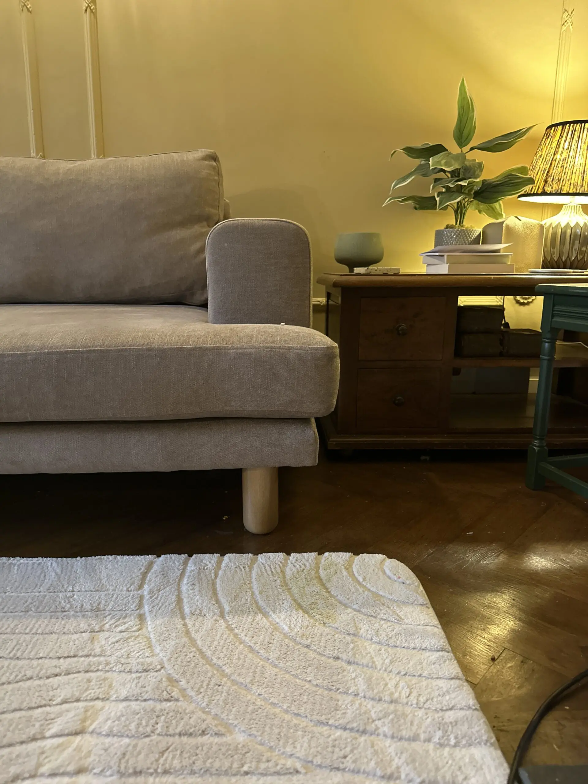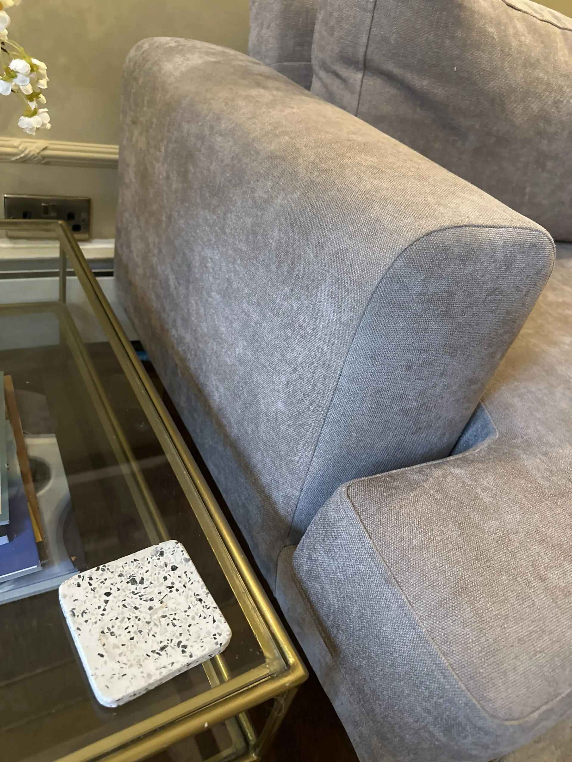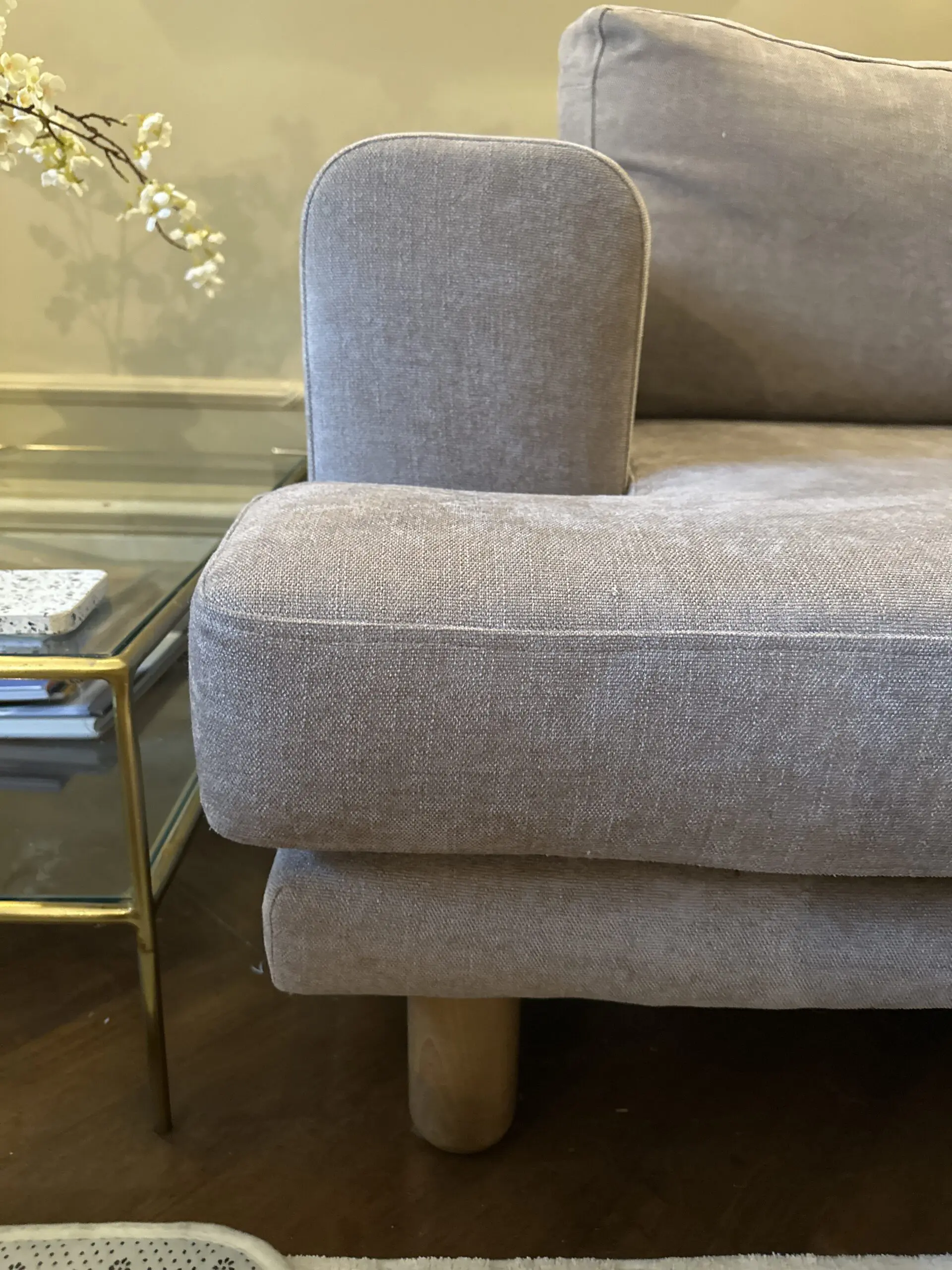 Neutral colour, chunky seat and back cushions with wide, modern arms