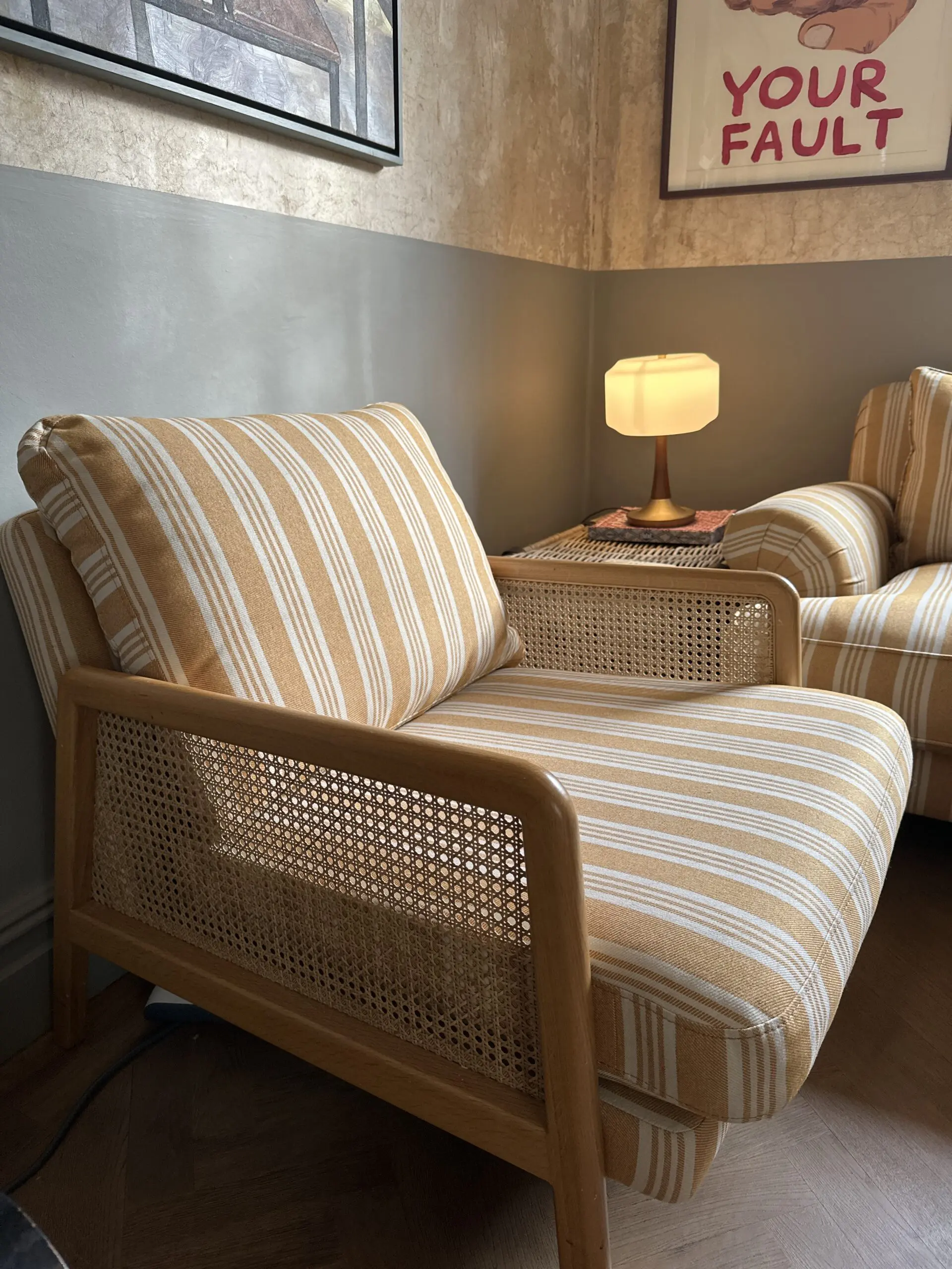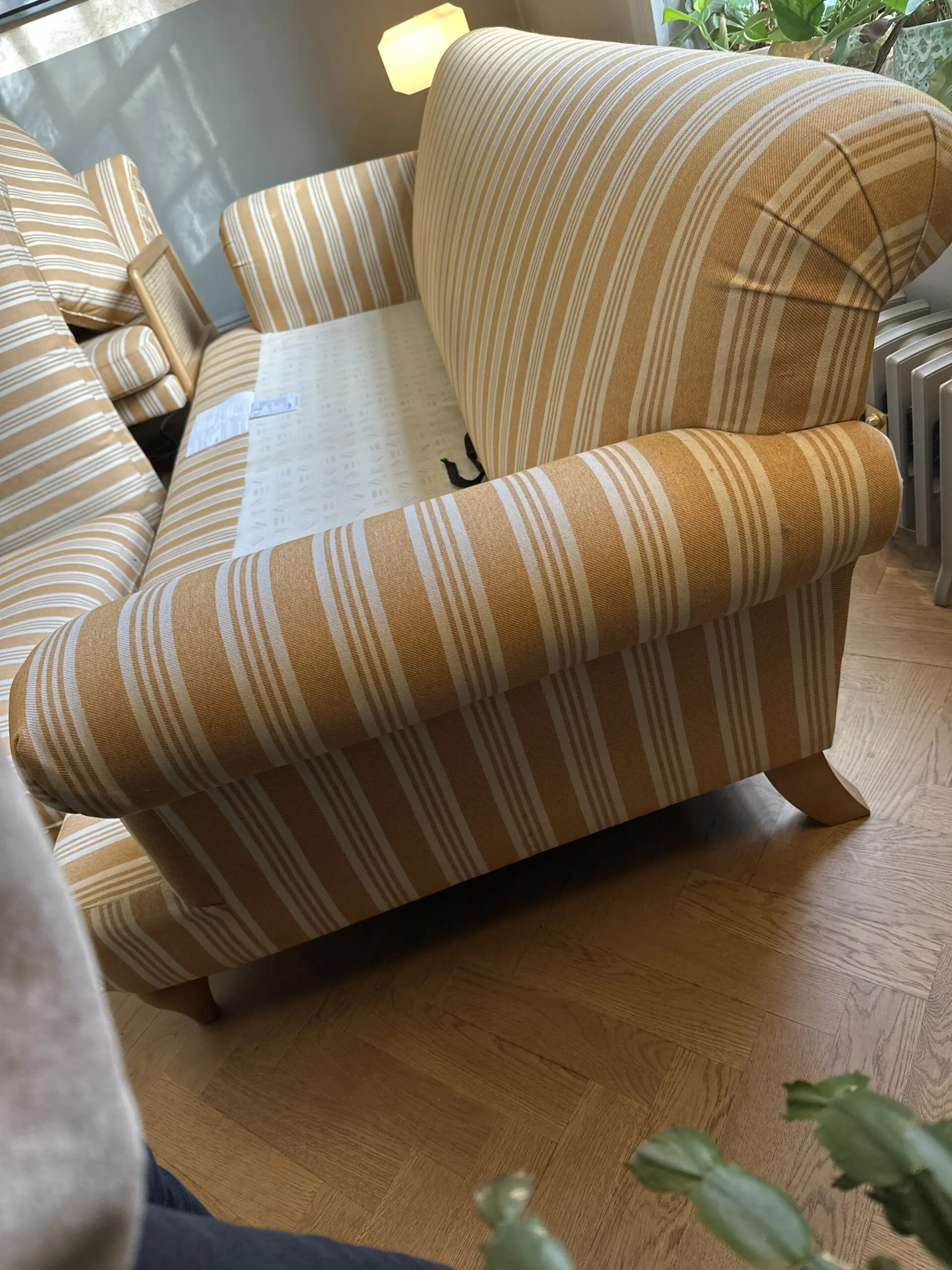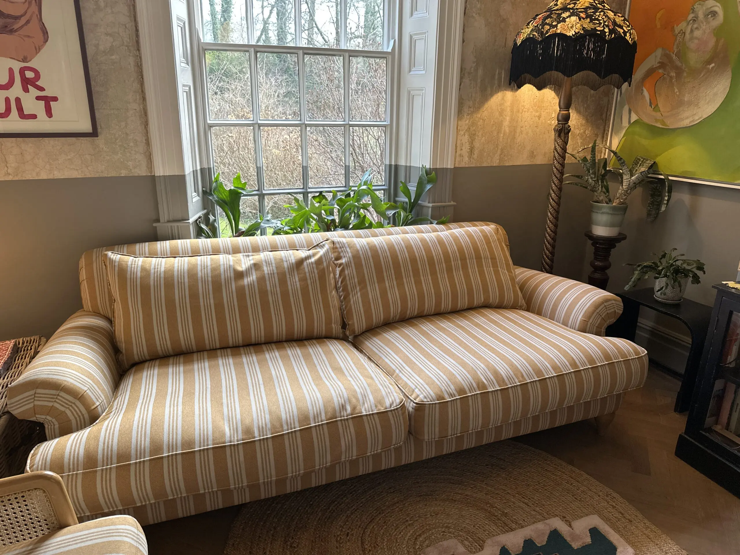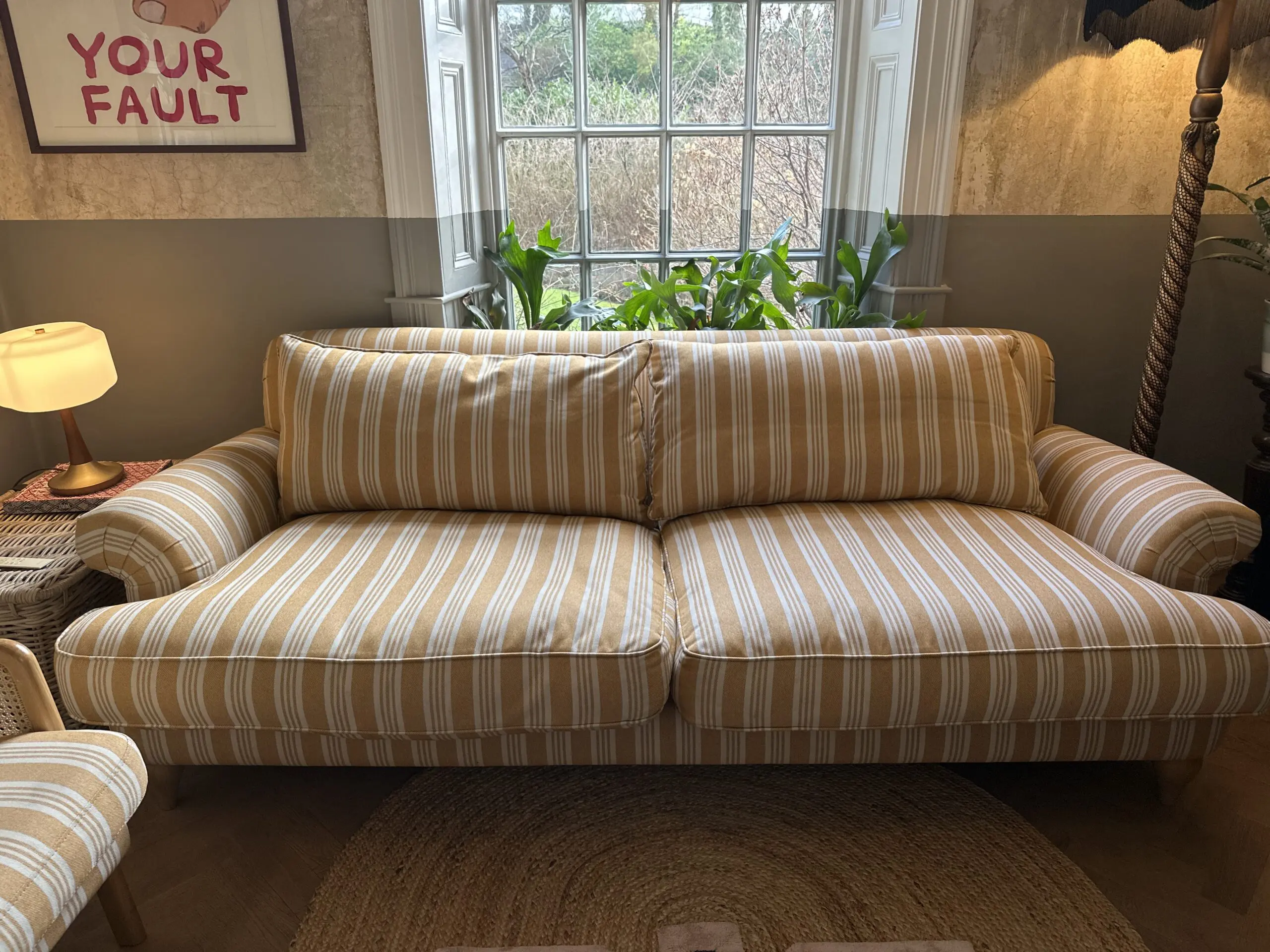 Deep and comfortable sofa and chair set in a cheery ochre and off white colour palette.