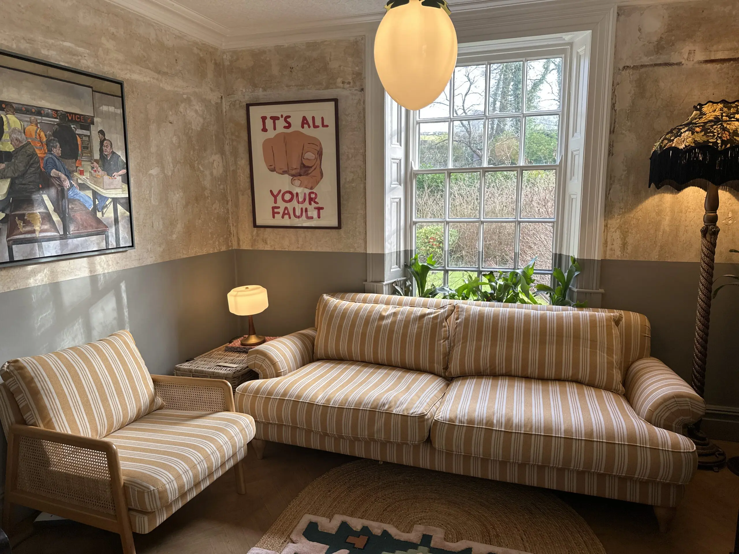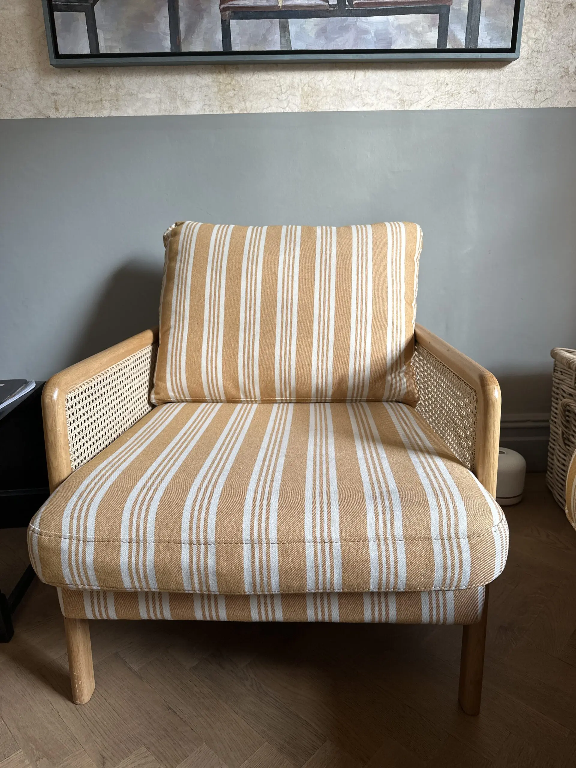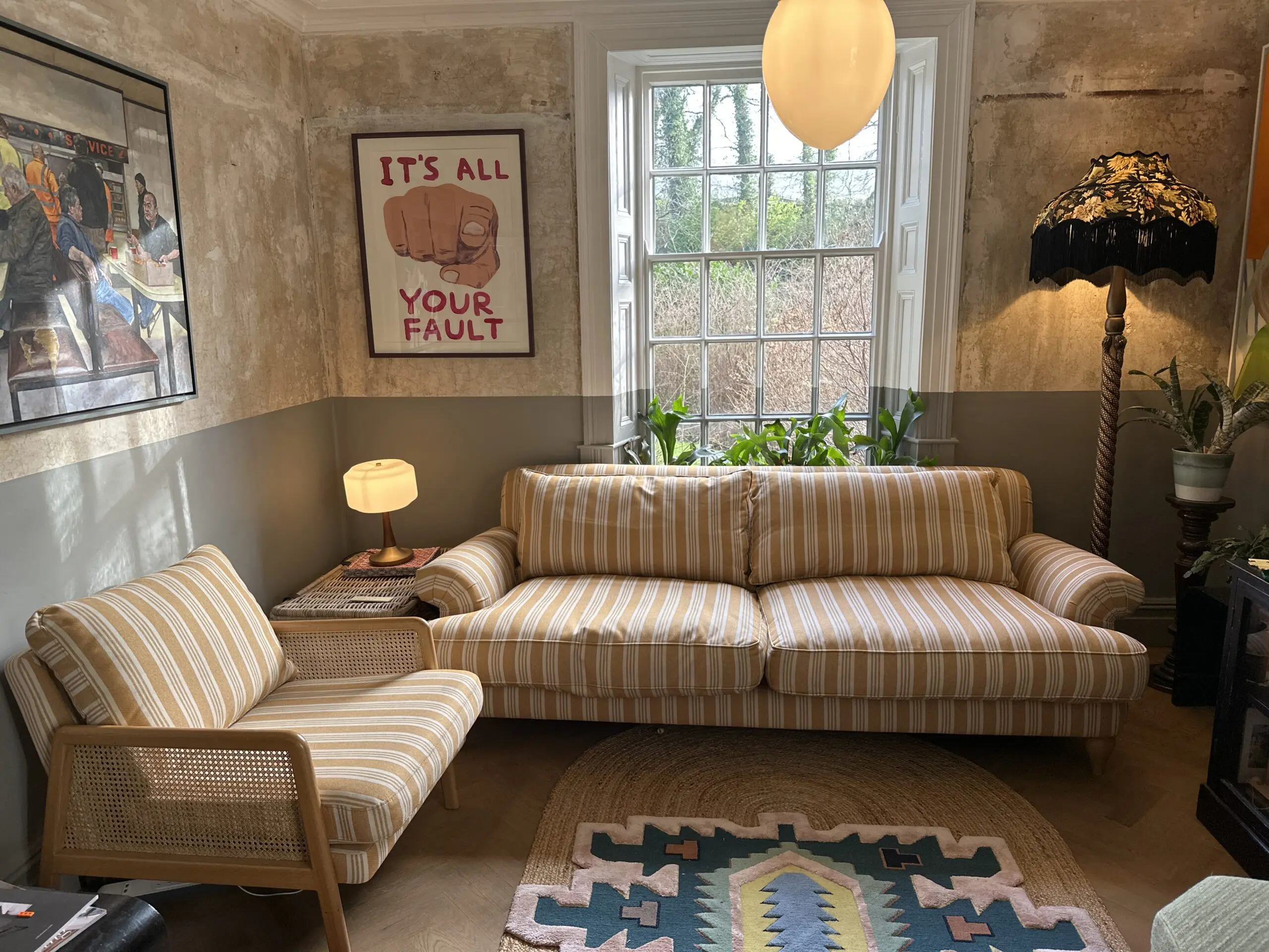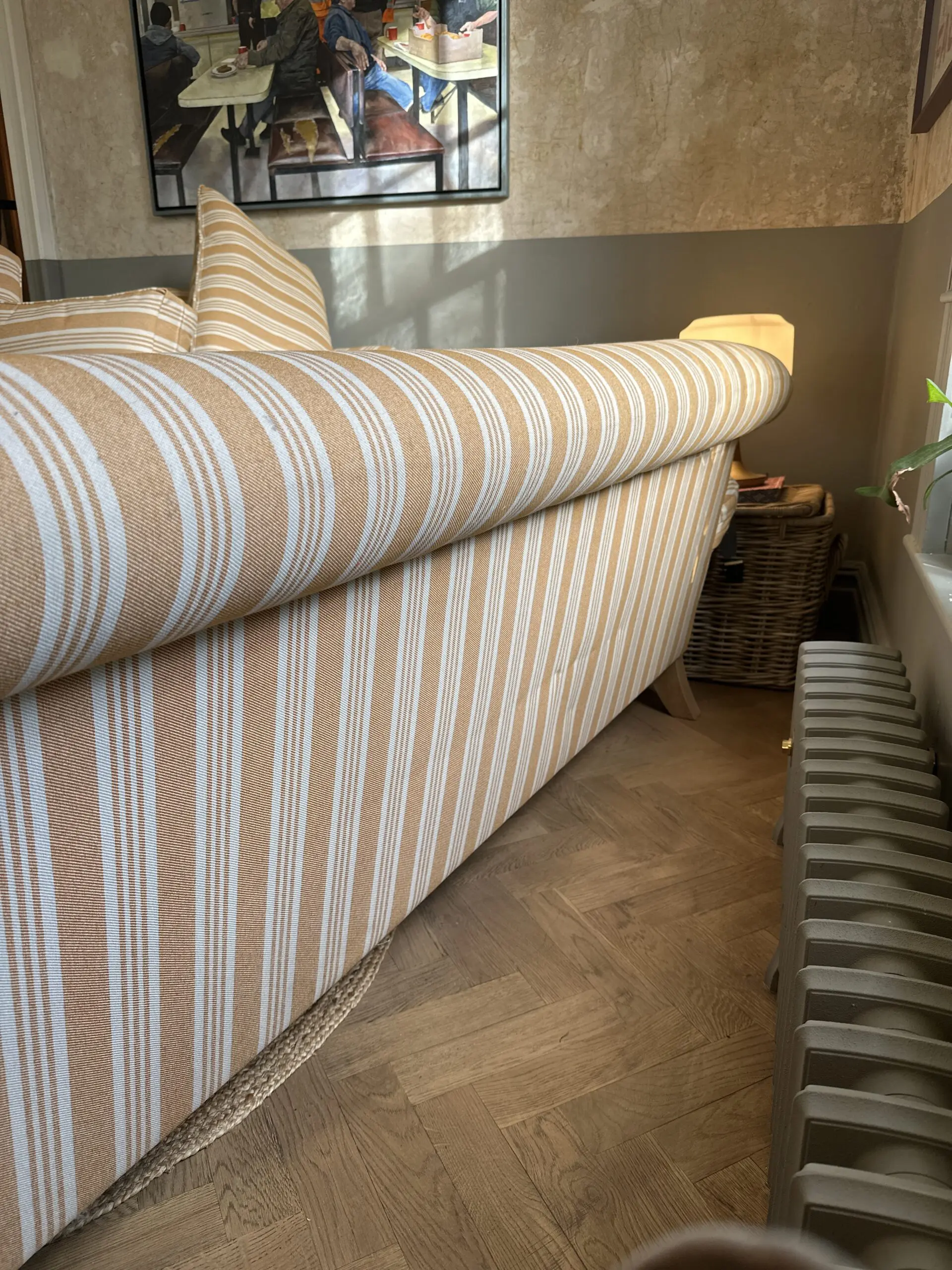 Deep and comfortable sofa and chair set in a cheery ochre and off white colour palette.
