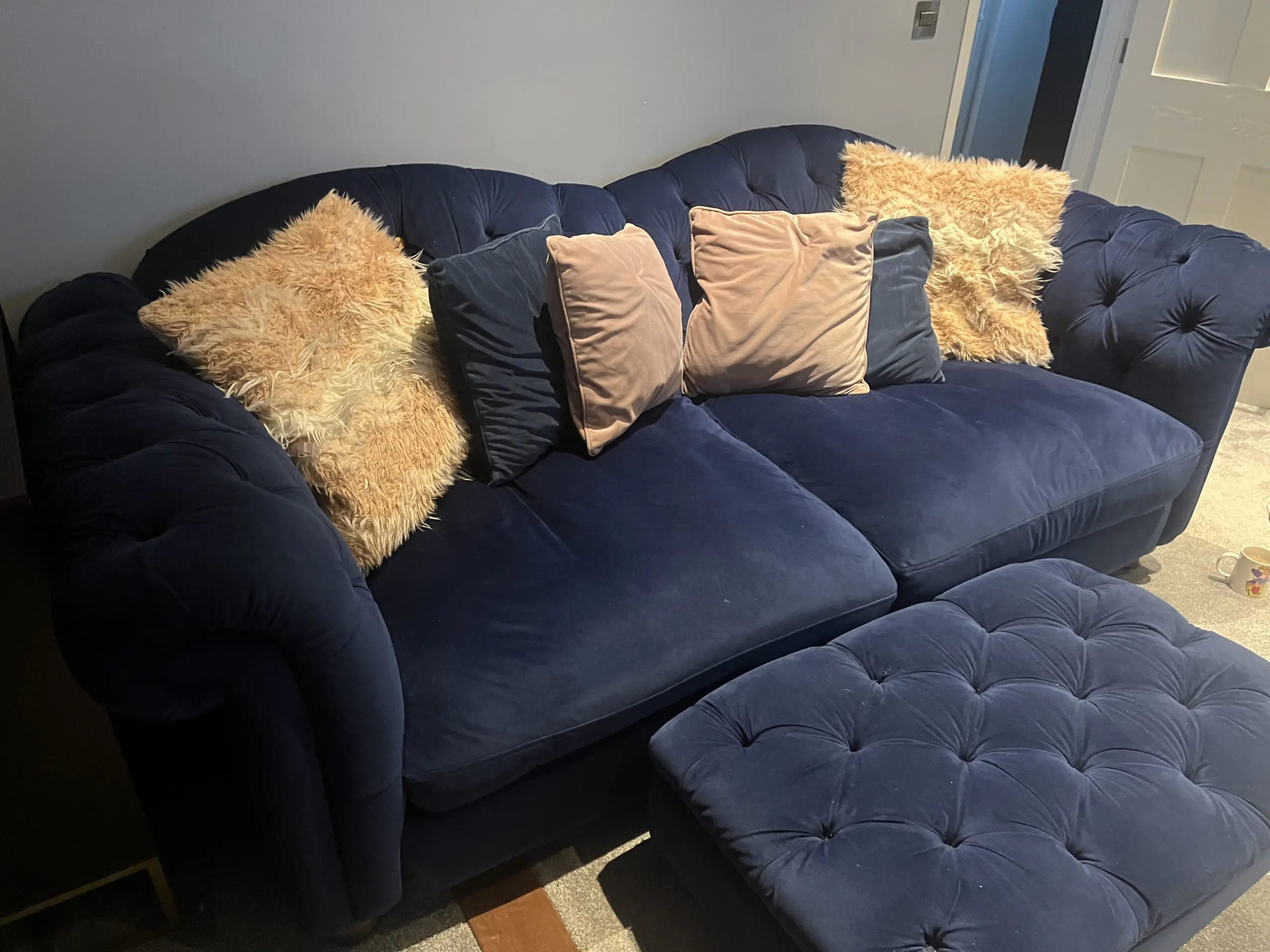 Blue velvet sofa and footstool
