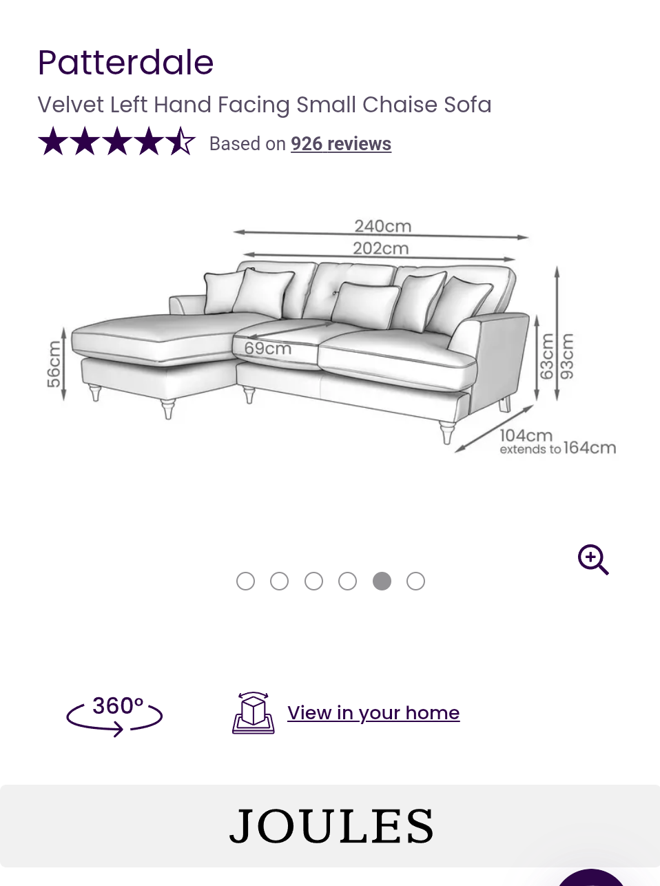 Joules Patterdale Right Hand Facing Chaise Sofa – DFS – 3 Seater Velvet Lounger Sofa
