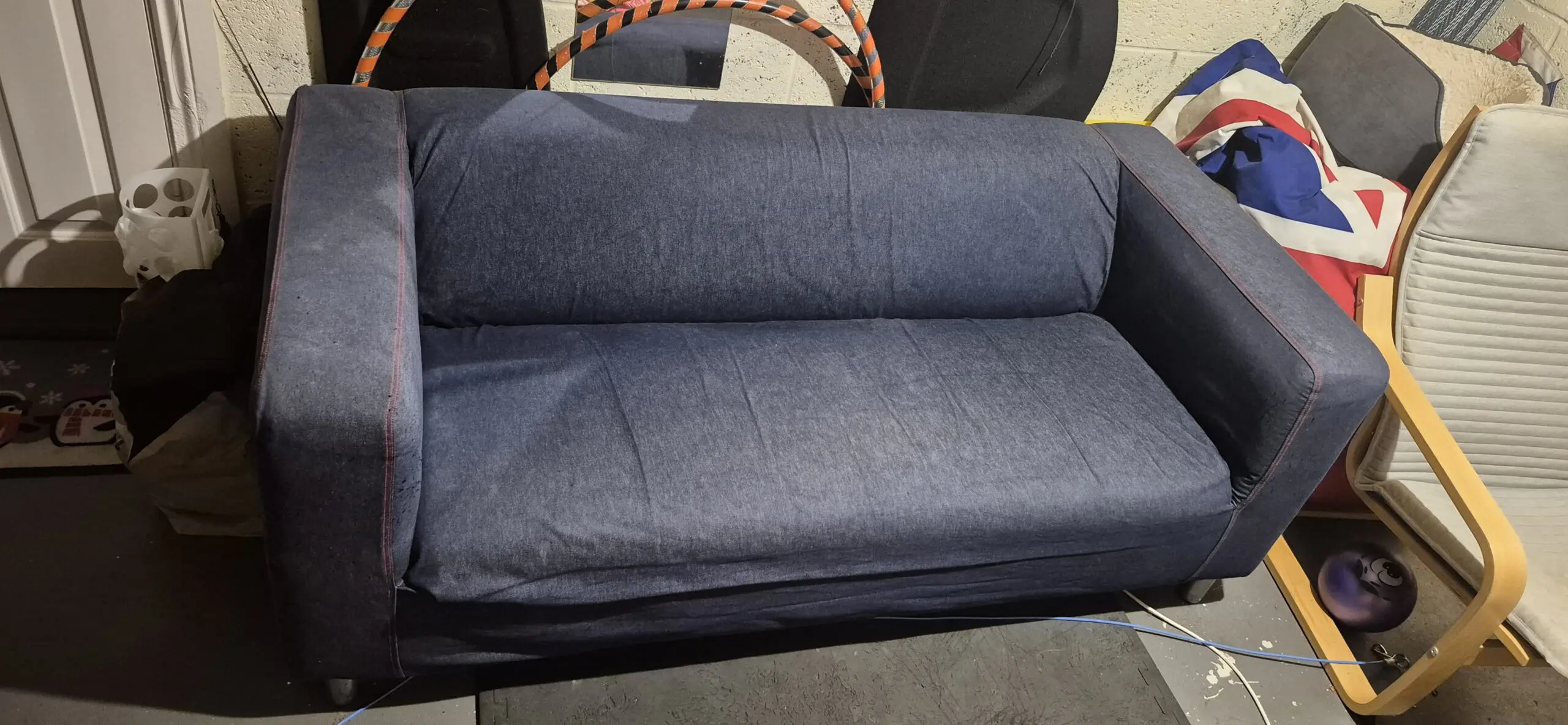 Klippan sofa with removeable denim cover, with extra one unused. Barely used, kept in play room as spare but we need the space now