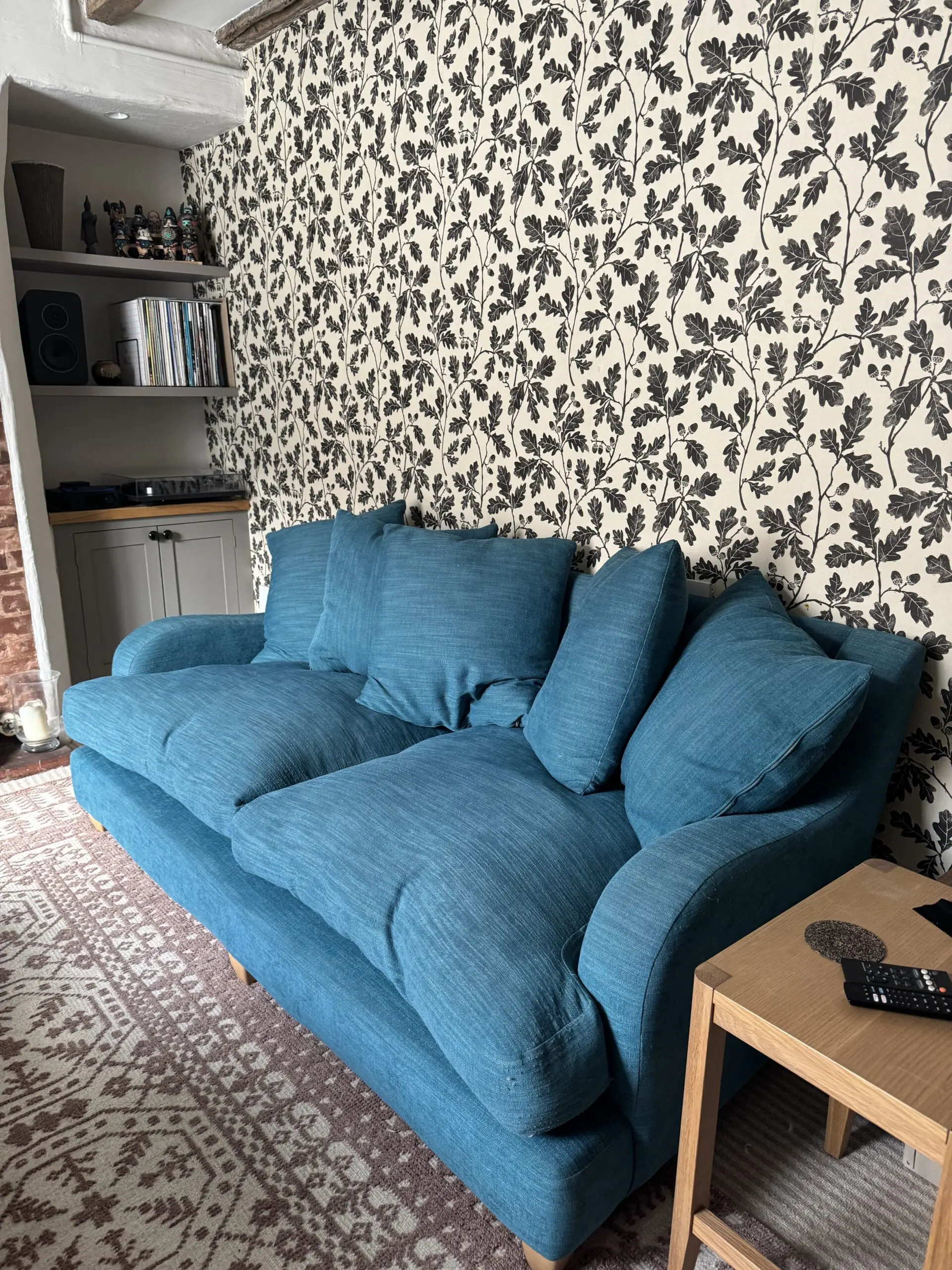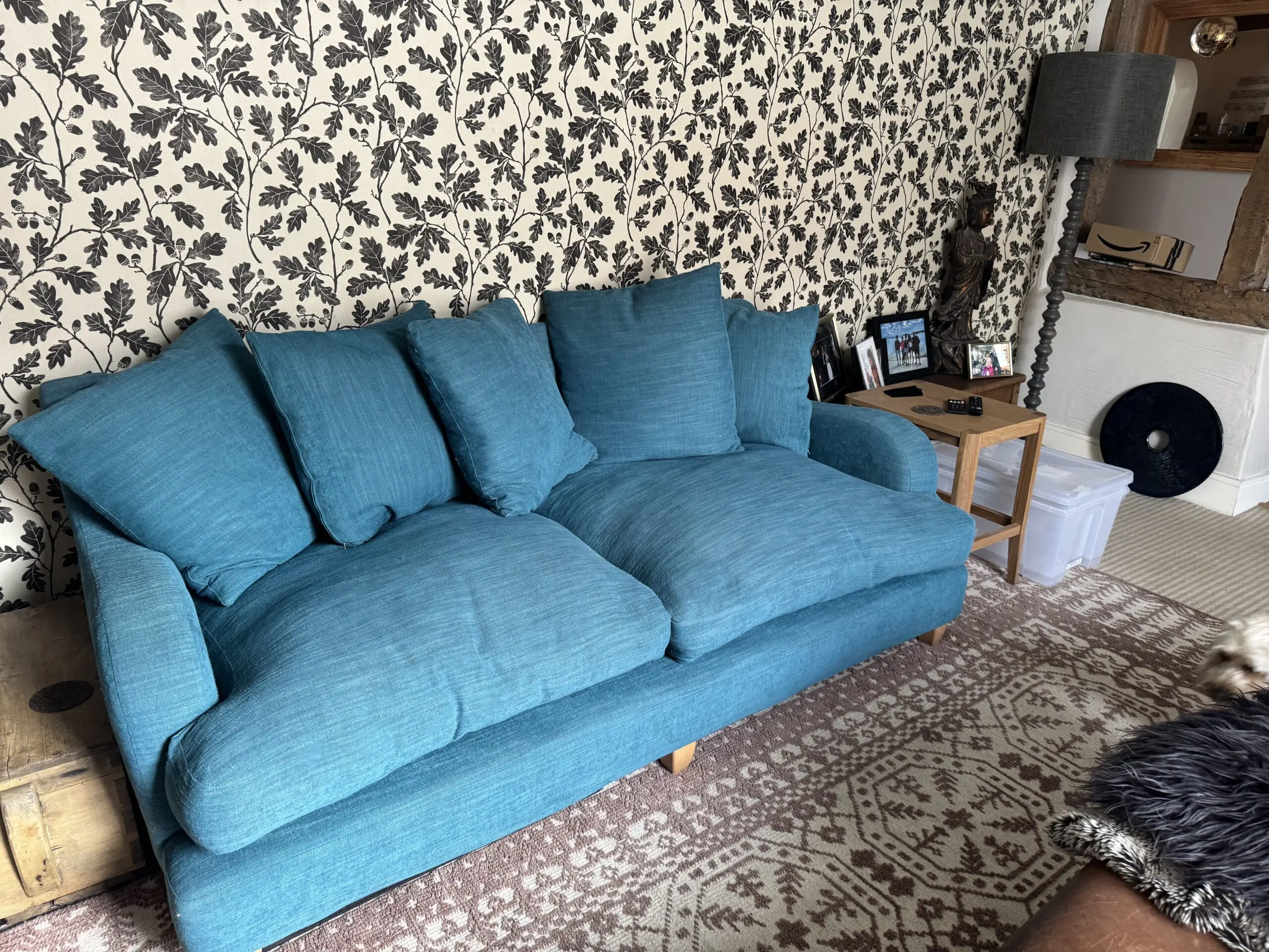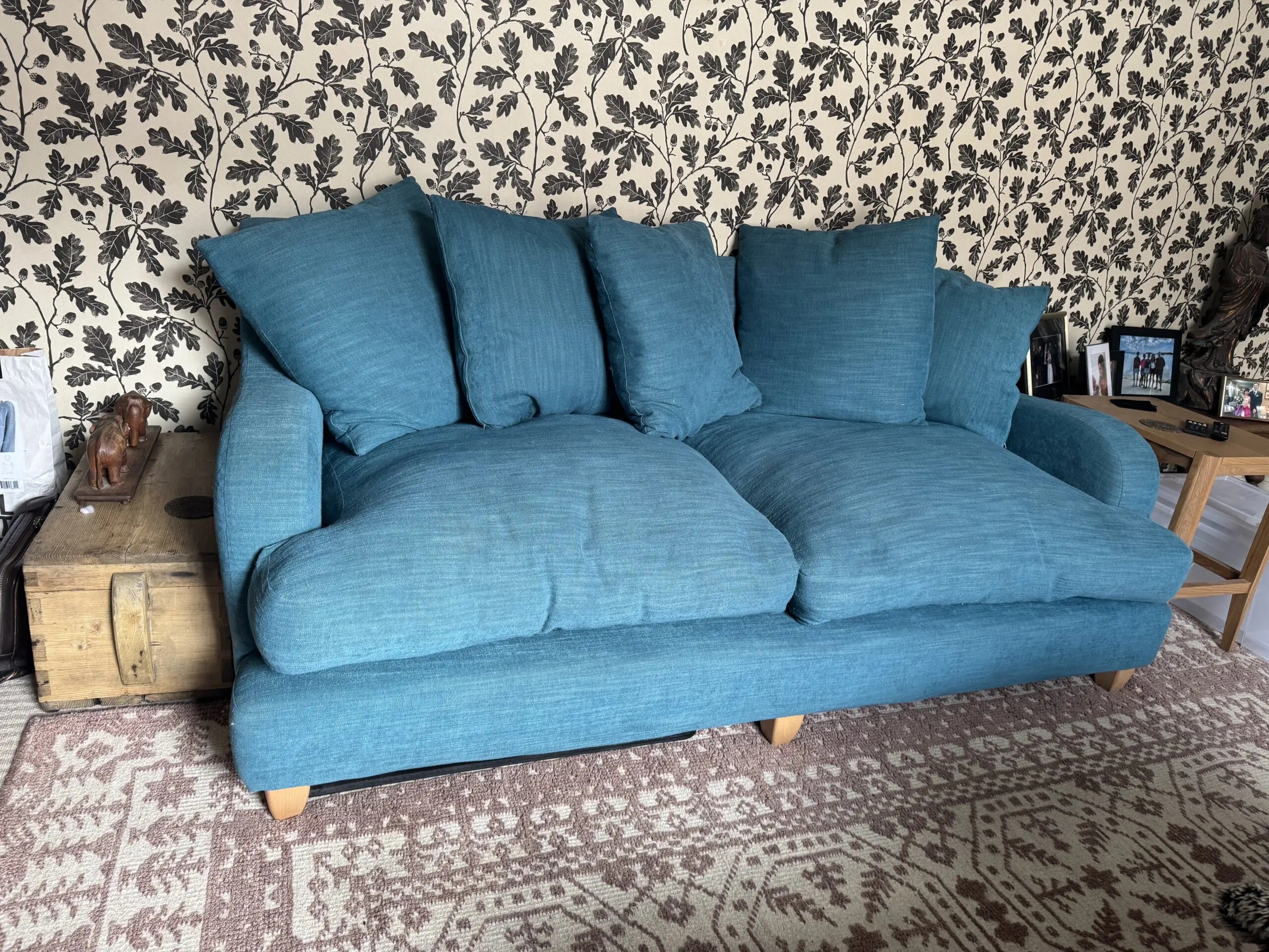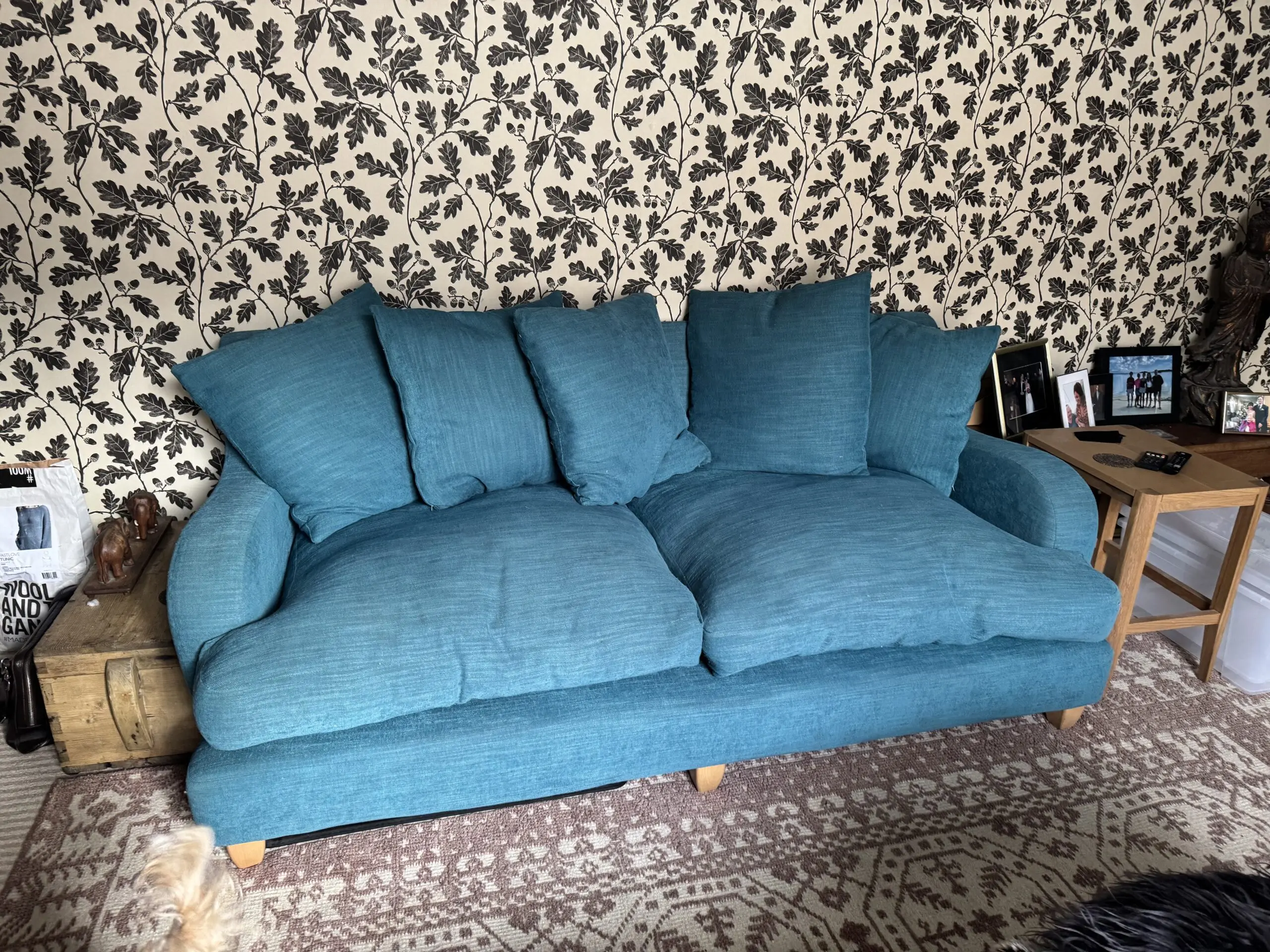 Large teal sofa. Soft feather filled cushions and feather filled back scatter cushions