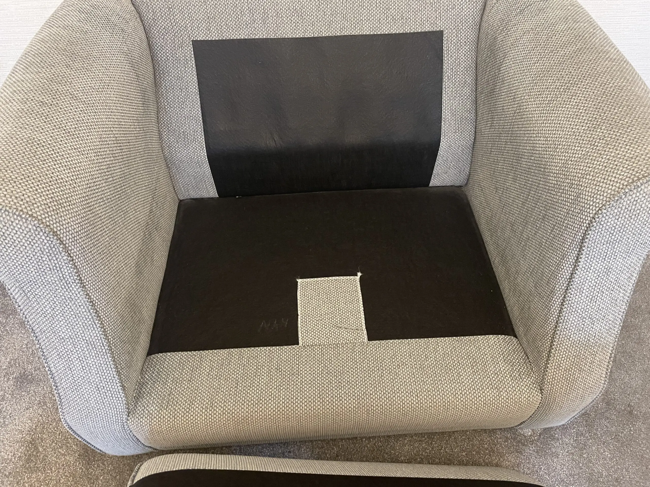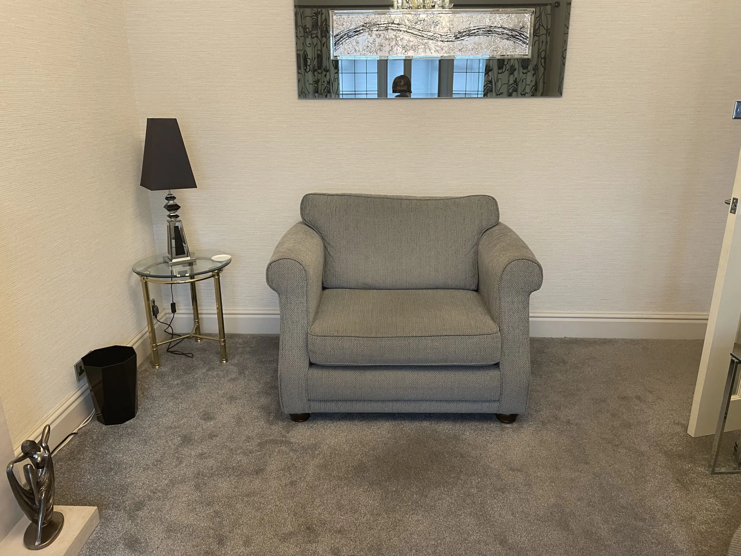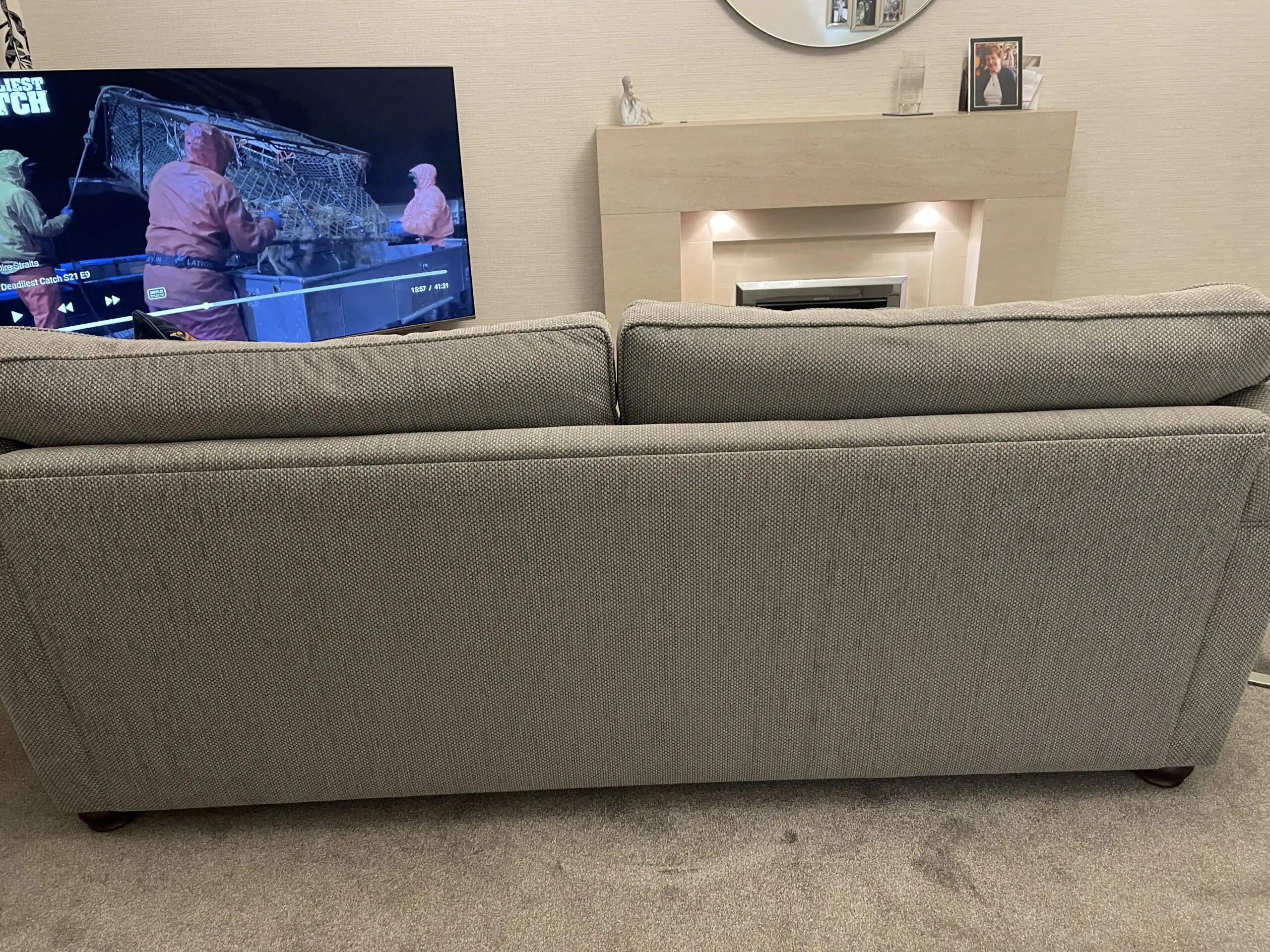 Laura Ashley 3 seater sofa with matching Snuggle chair. The furniture sits on round wood bun feet. Very well made with no rips or damage. Has been well looked after.