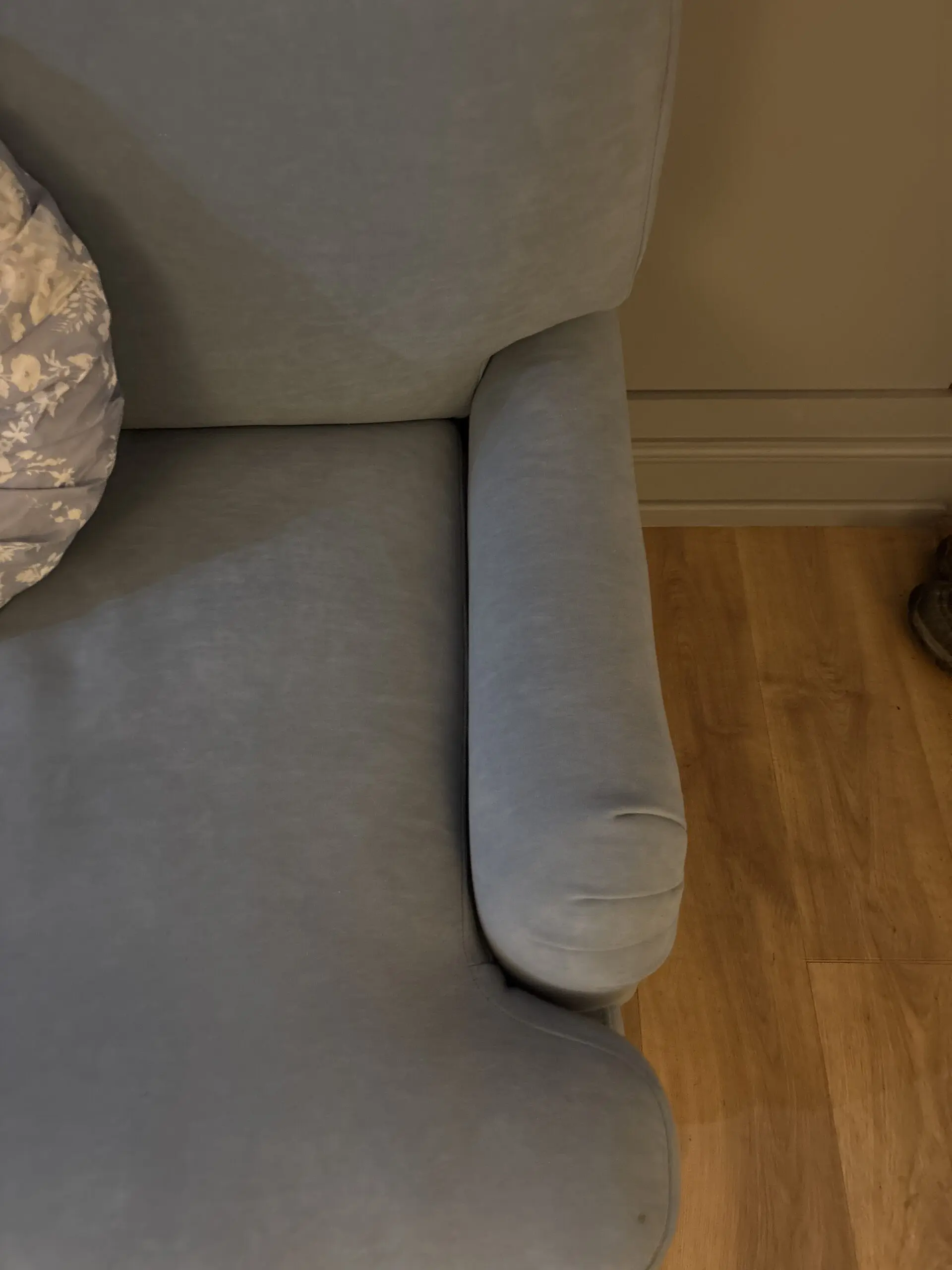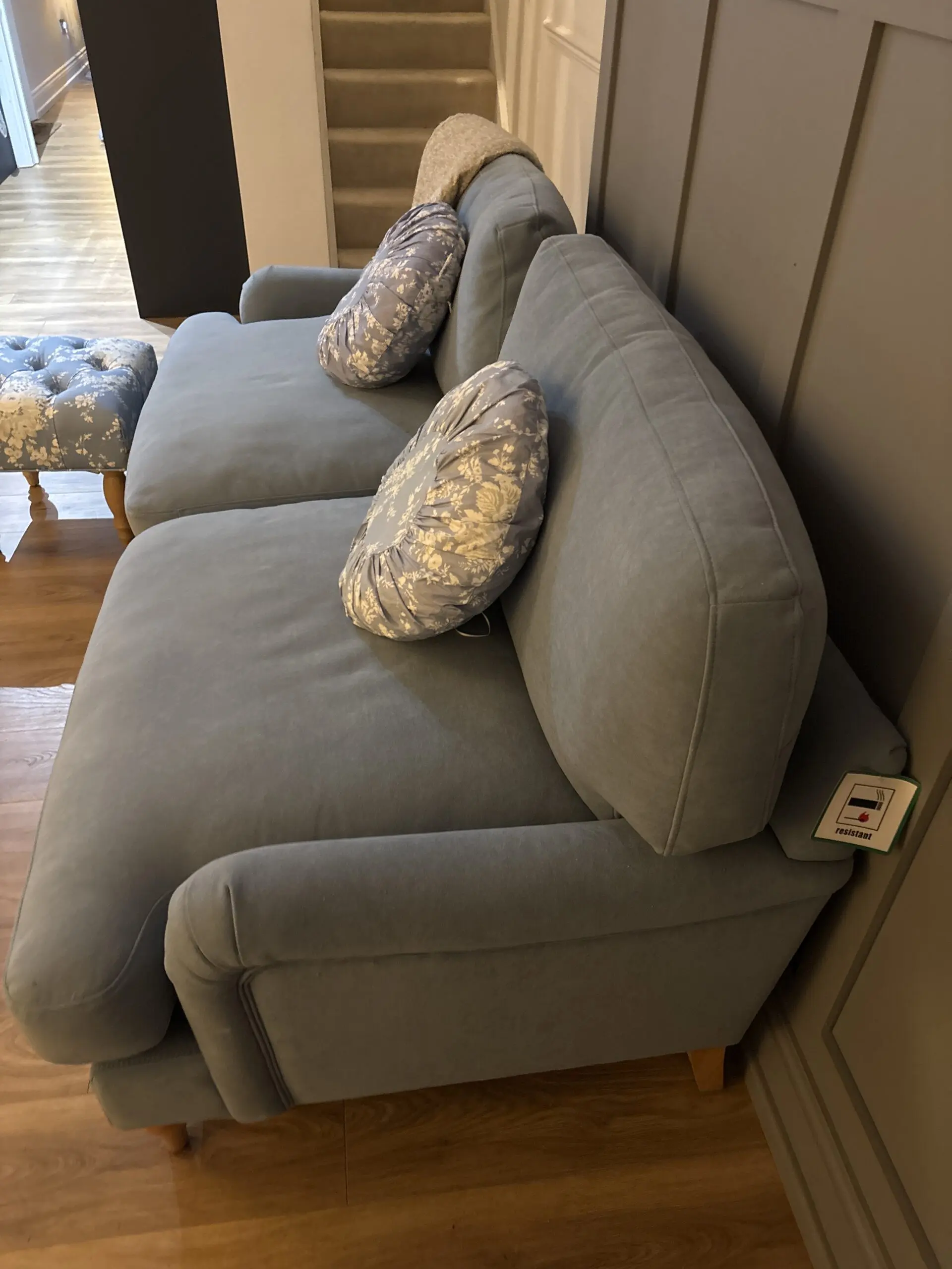 A very good well kept pale blue Laura Jane sofa for sale. H with cushions 90cm x W210cm x D95cm. Ready for collection