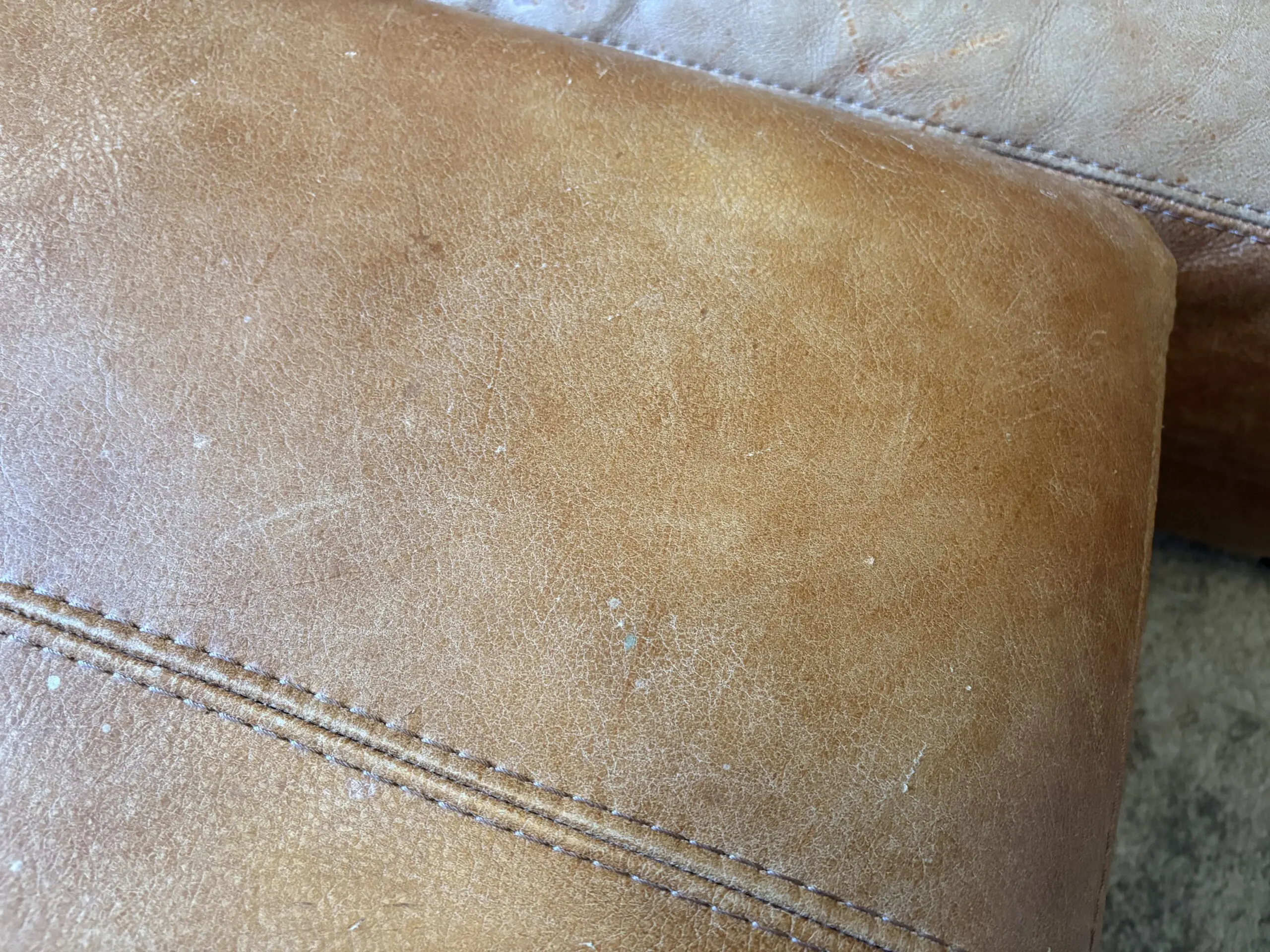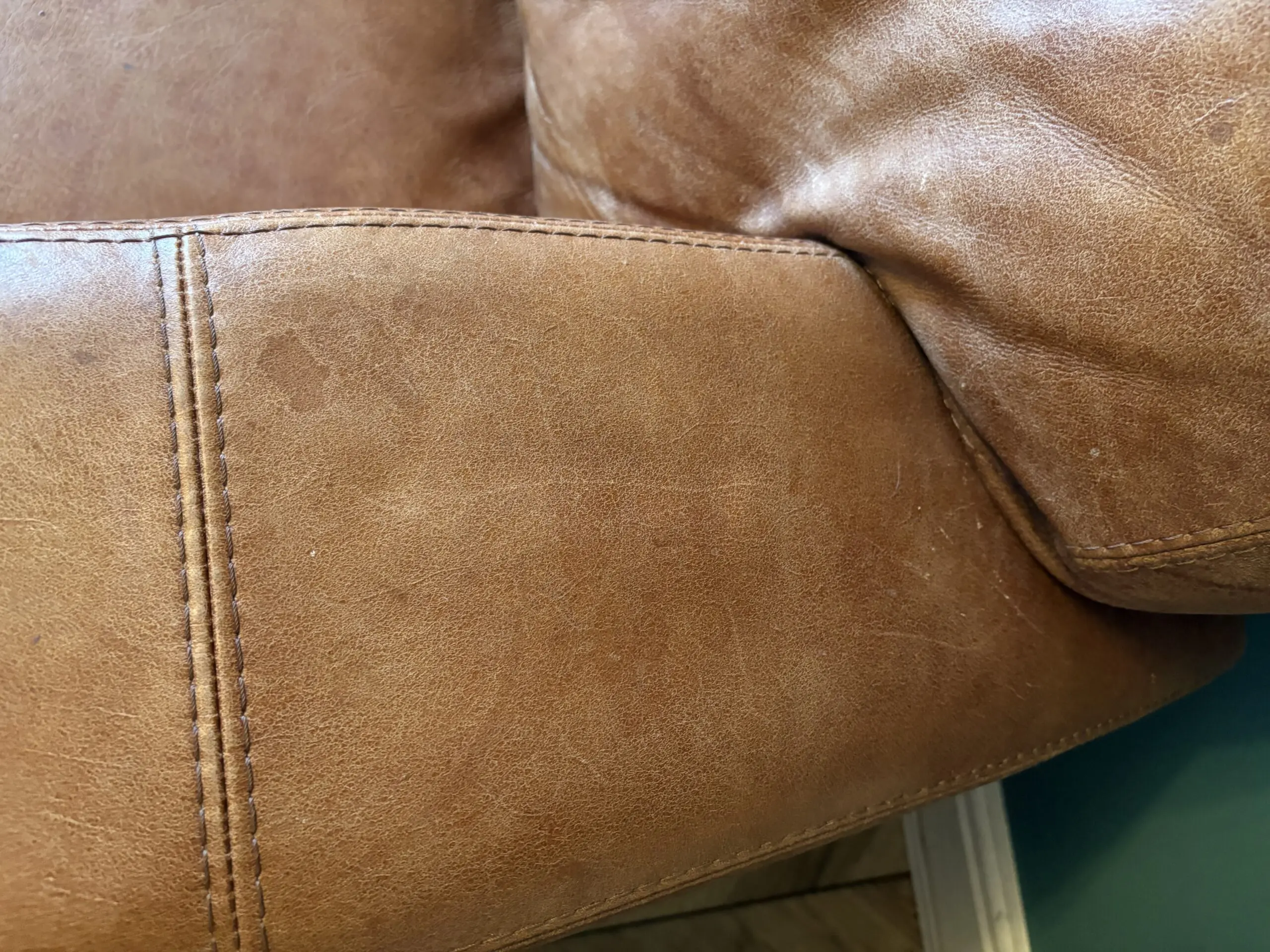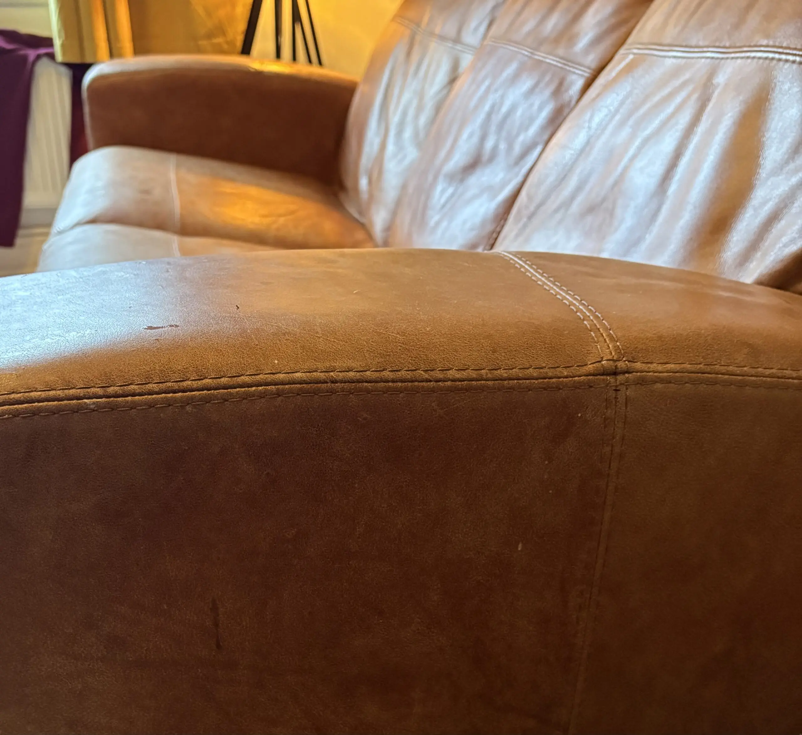 A few scratches on the arm where the car has slipped off the sofa not purposely scratched it. Tried to show on photos (4) and small plate stain on arm. Not very noticeable.