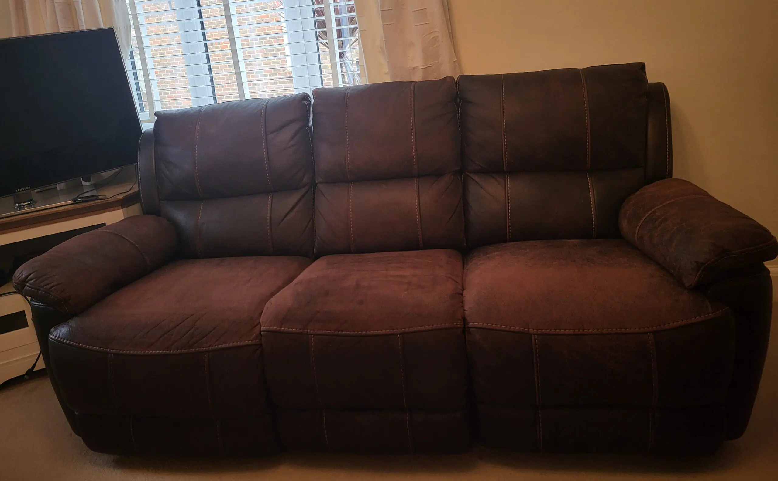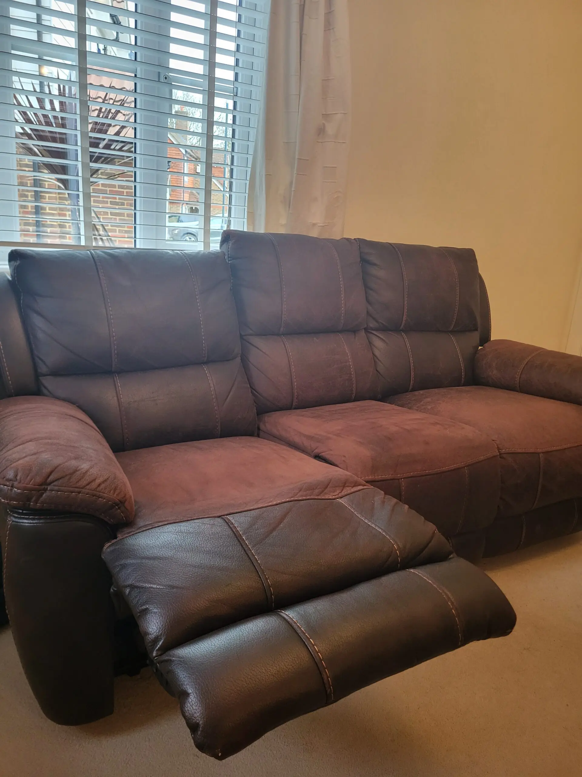 Deep brown reclining leather sofa. Seats are detachable so can make a 2 seater with one free-standing!