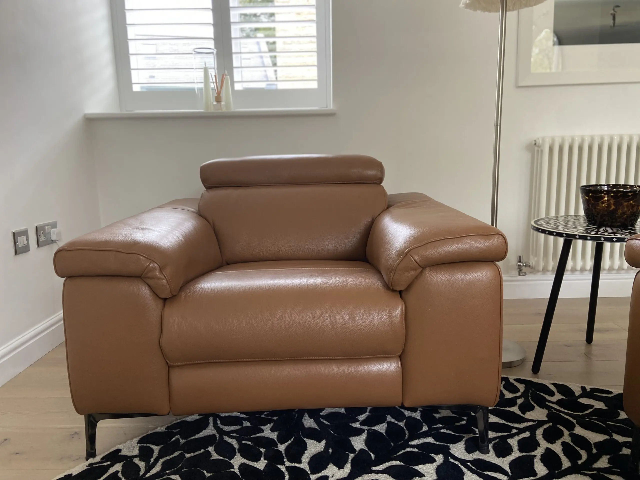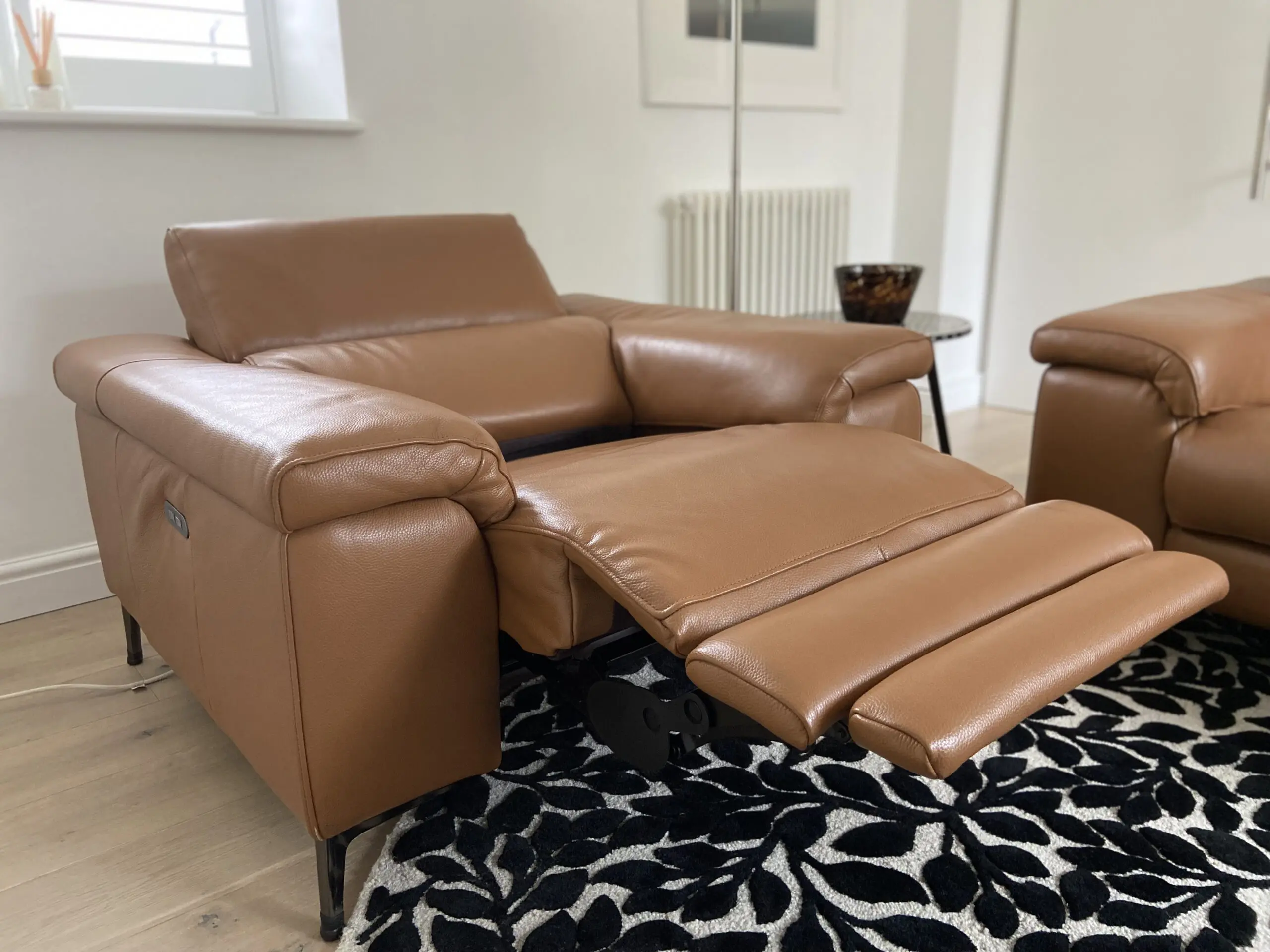 A contemporary 3 seater sofa in gorgeous tan (very natural coloured) leather with 2 electric reclining seats and headrests. Plus a matching armchair also reclining.