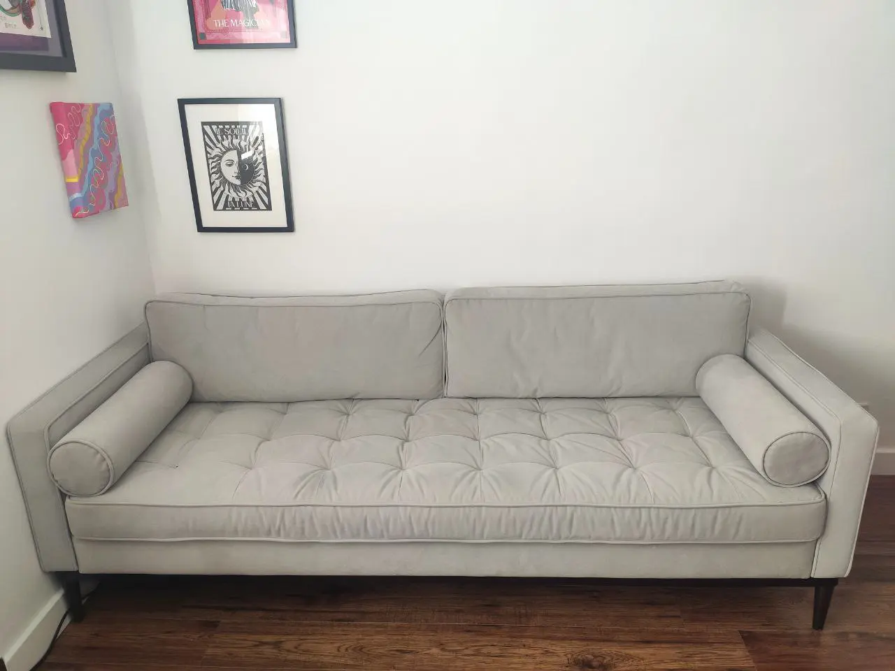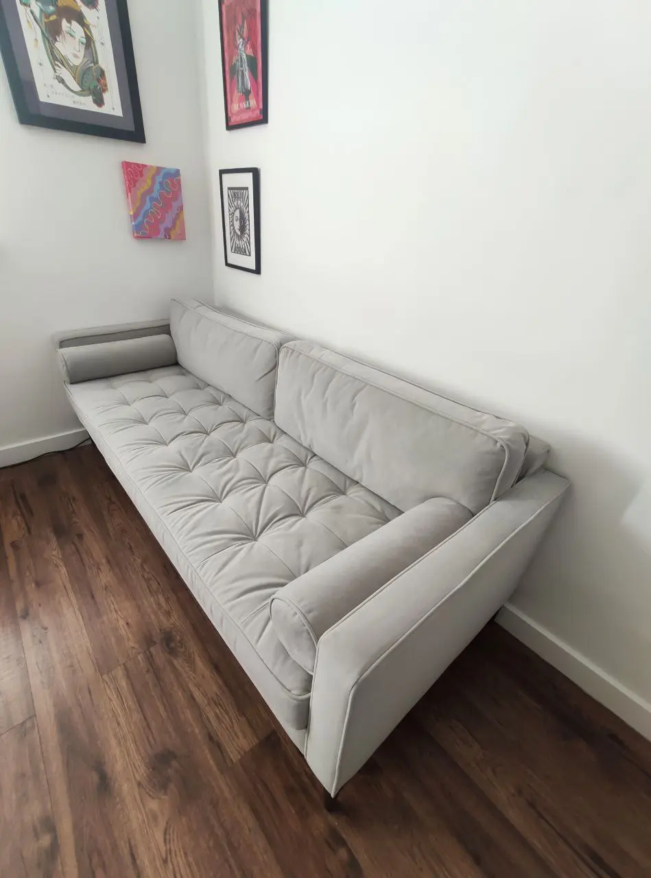 Light Grey 3-seater sofa, 2 years old and was barely used, already available for collection. There’s no tears, stains or scratches. It’s easy to assemble and quite comfortable. The reason for selling is that it doesn’t fit in a new apartment and takes some space. The sofa was purchased for £995 from Swyft.