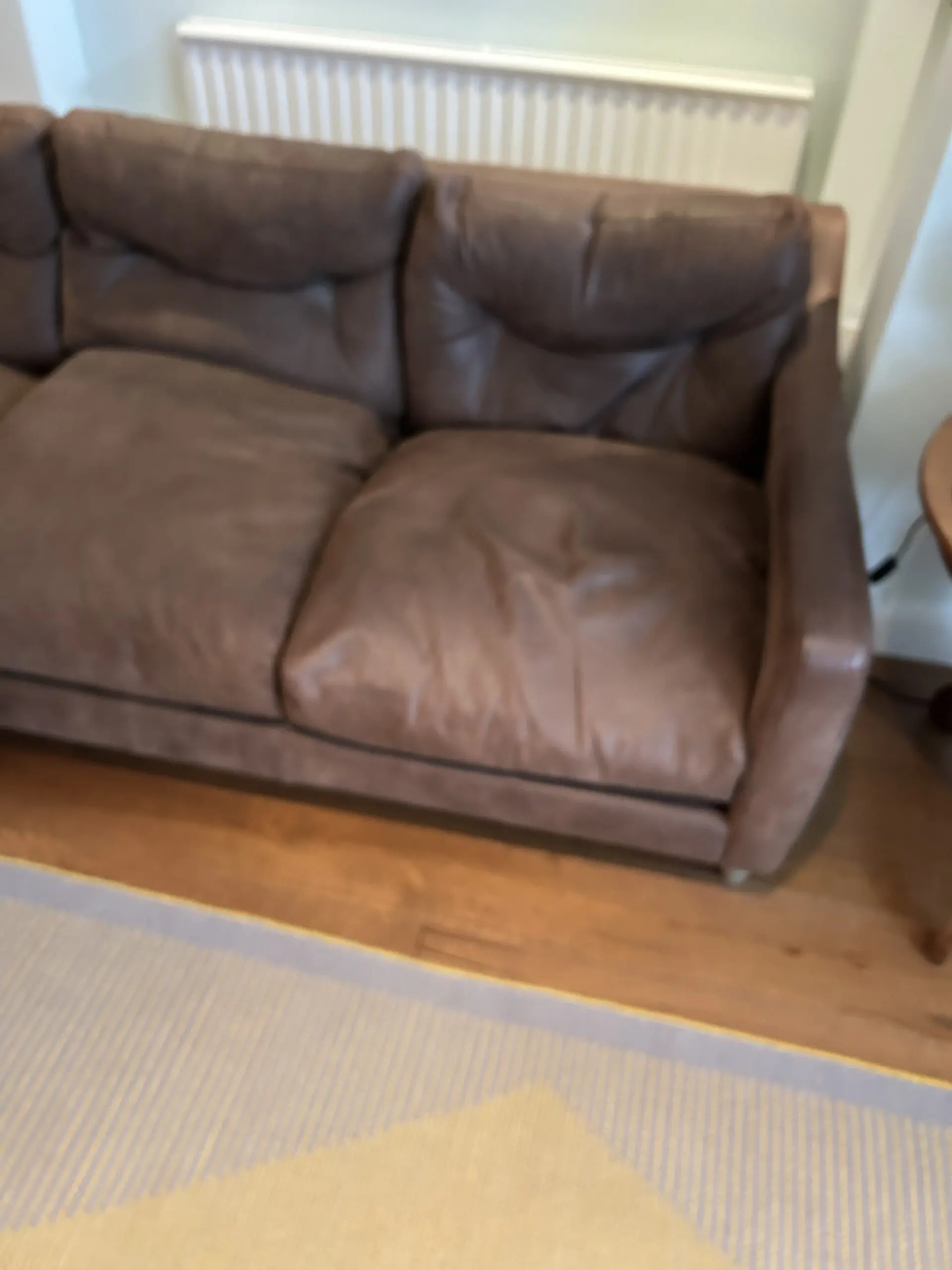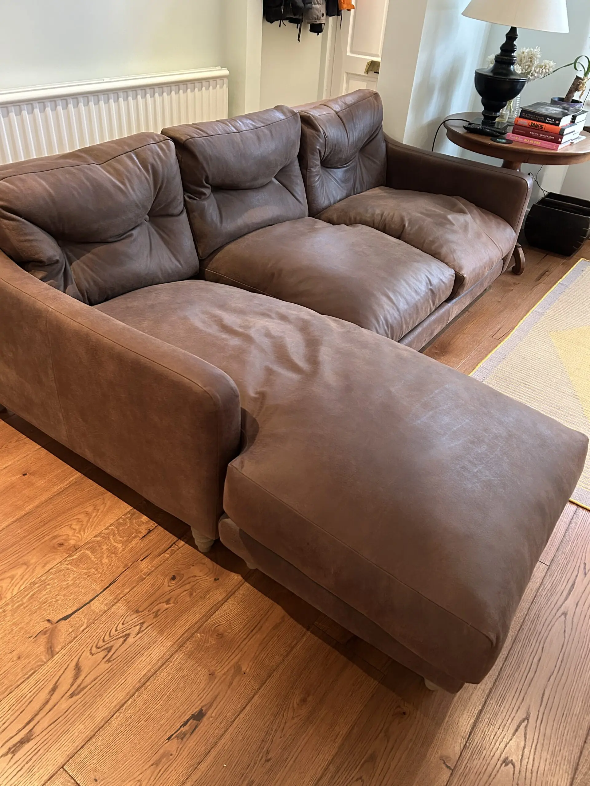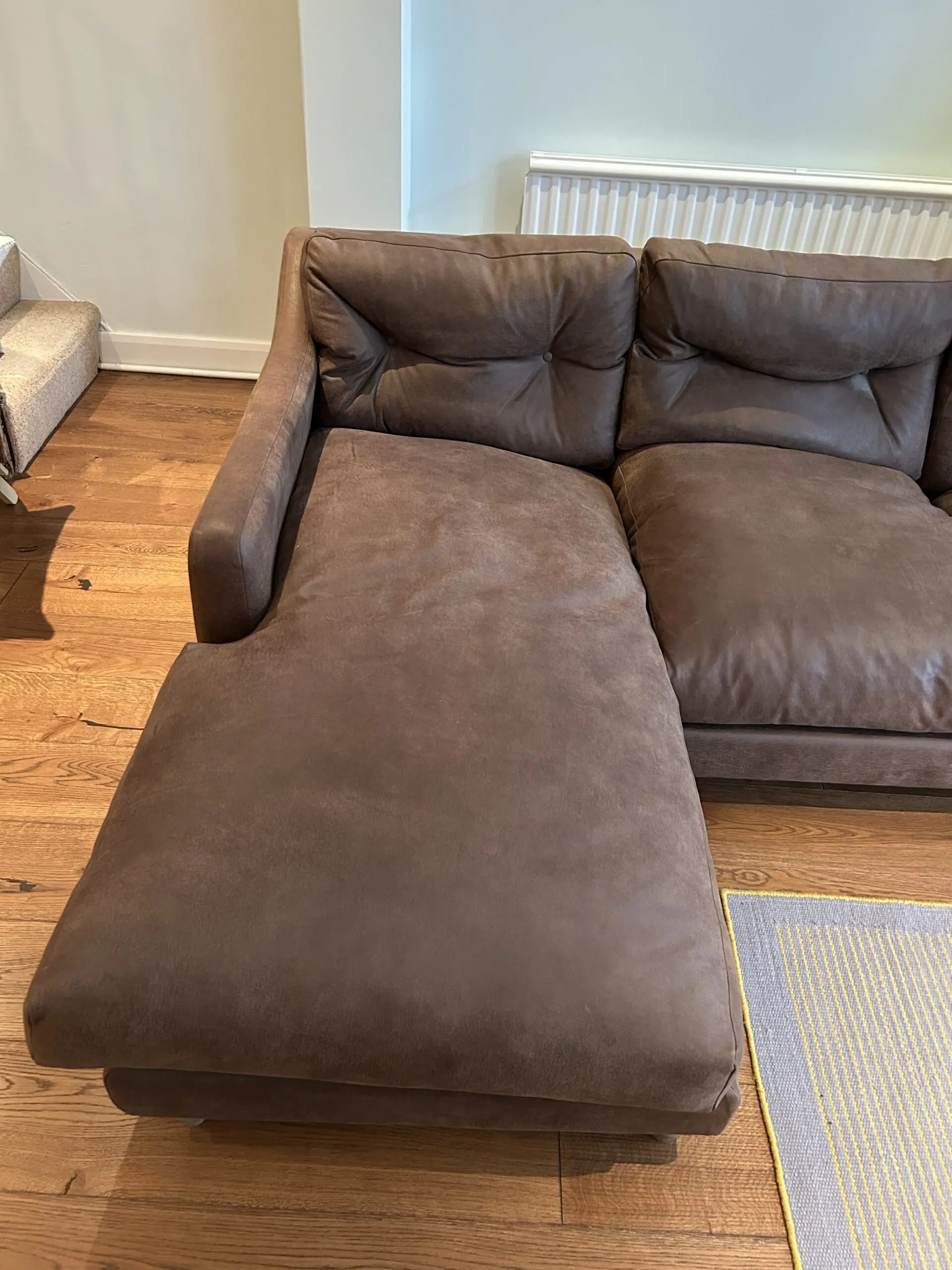 Loaf sofa with chaise longue. Brown leather in good condition. Some small markings on one seat. Very comfortable!