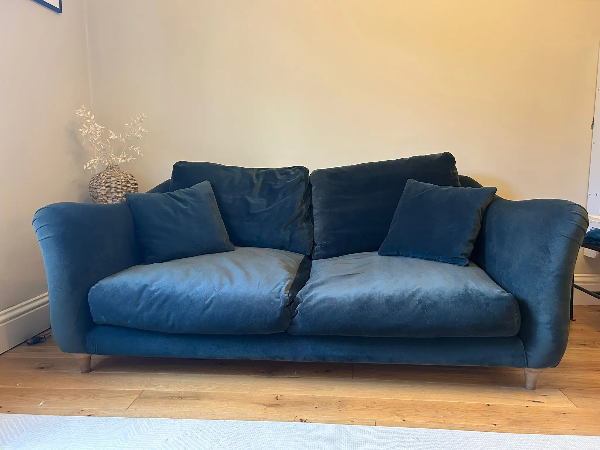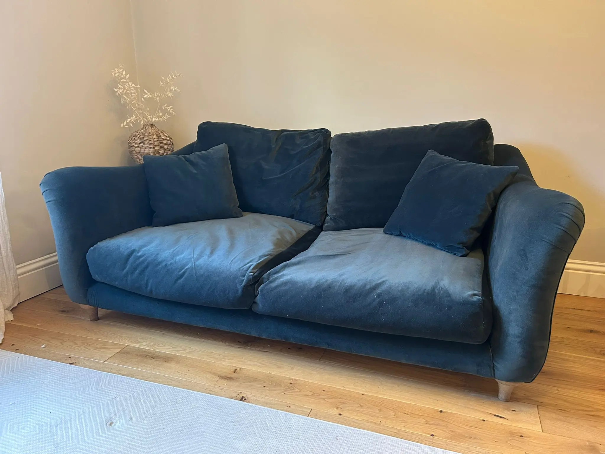 Loaf medium size bumpster sofa in bluey grey clever deep velvet with two matching scatter cushions. Has been protected with castelan fabric protection and is in excellent condition. Originally purchased in 2021 and we have always used a throw blanket on the bottom cushions so no marks or stains visible.