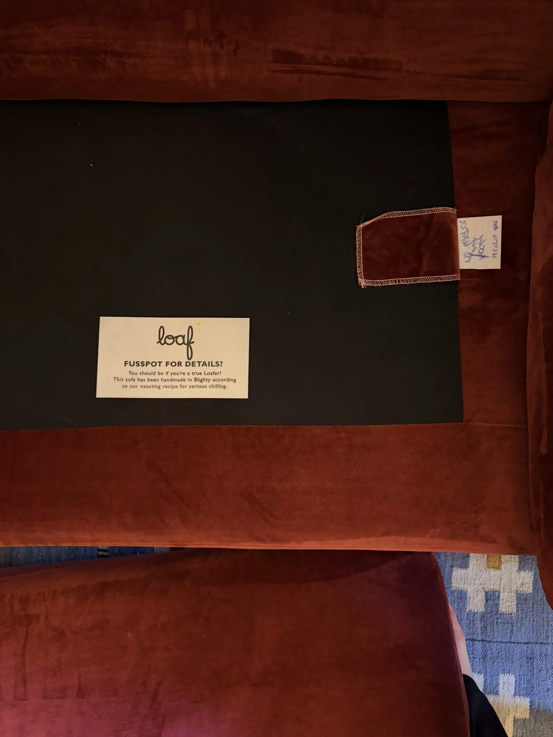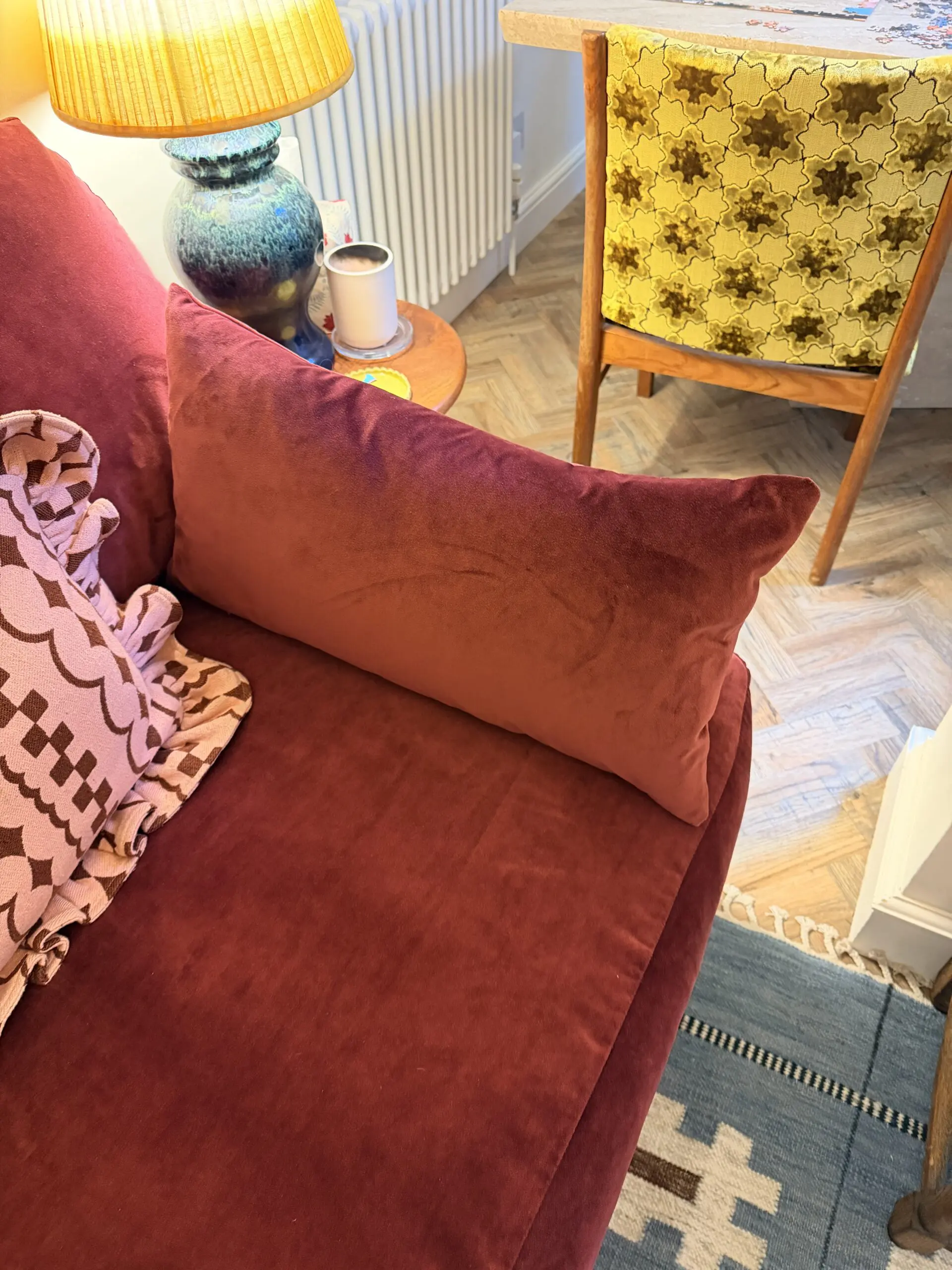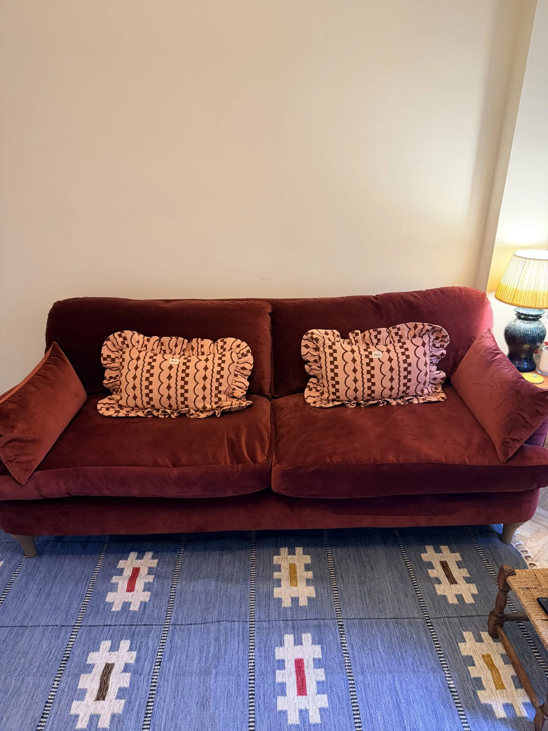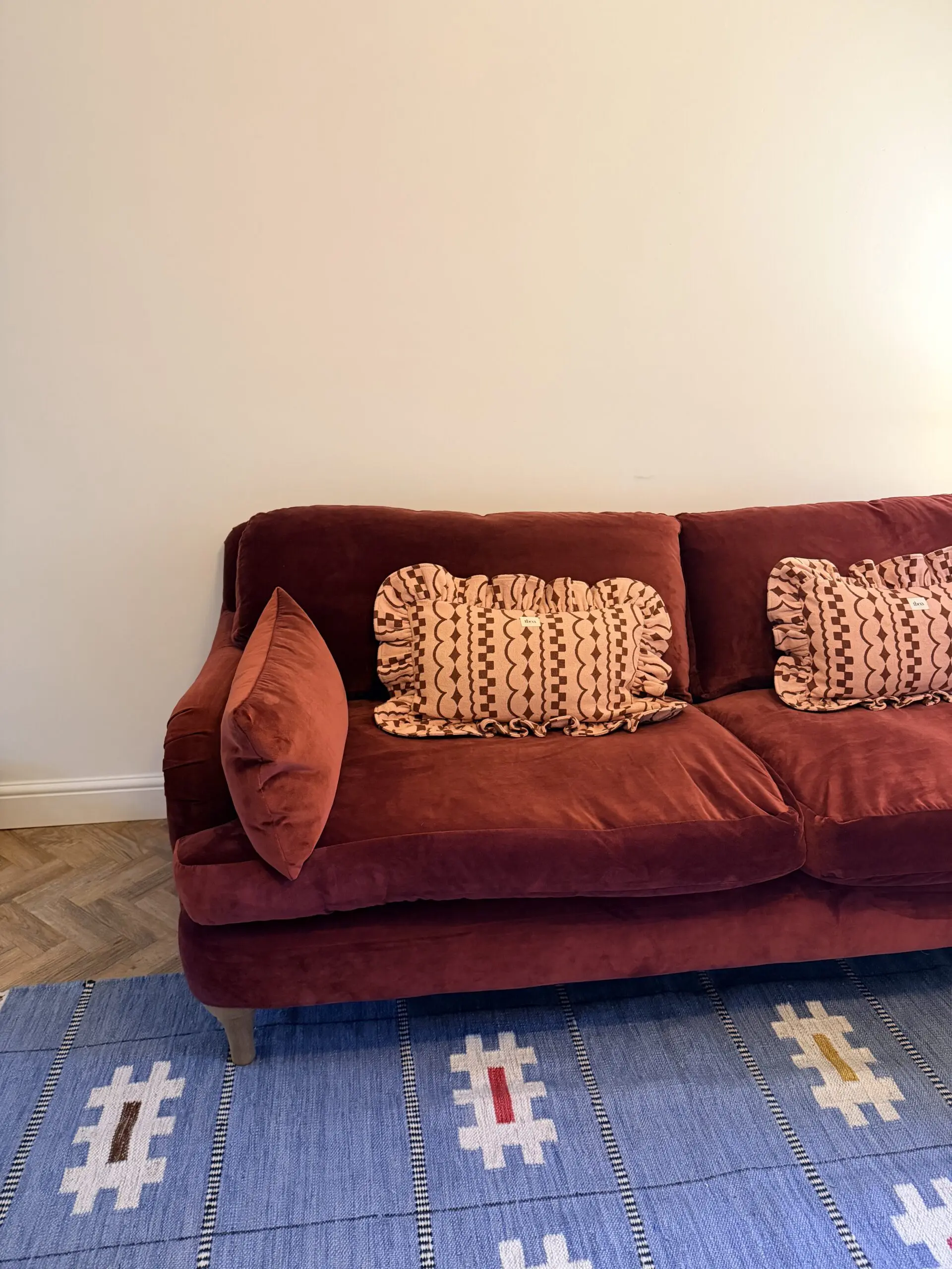 This fabric has been discontinued, so a very rare find! The colour is a gorgeous red burgundy colour. Can also include matching cushions that we bought in addition.