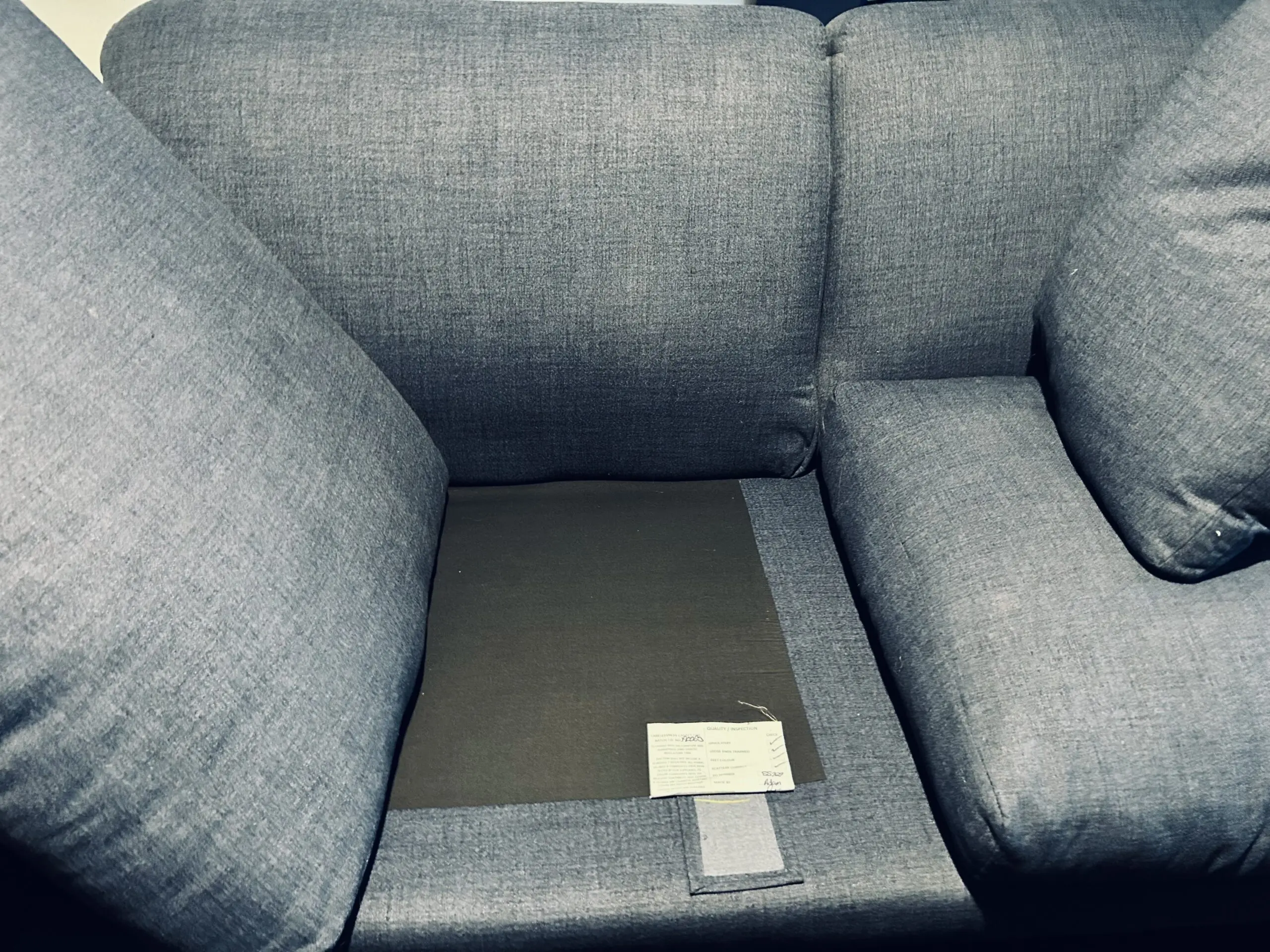 A beautiful and exceptionally comfortable Bear Hug Large Sofa in Cookbook Blue clever linen – generously sized, effortlessly stylish, and from a smoke-free, pet-free home.