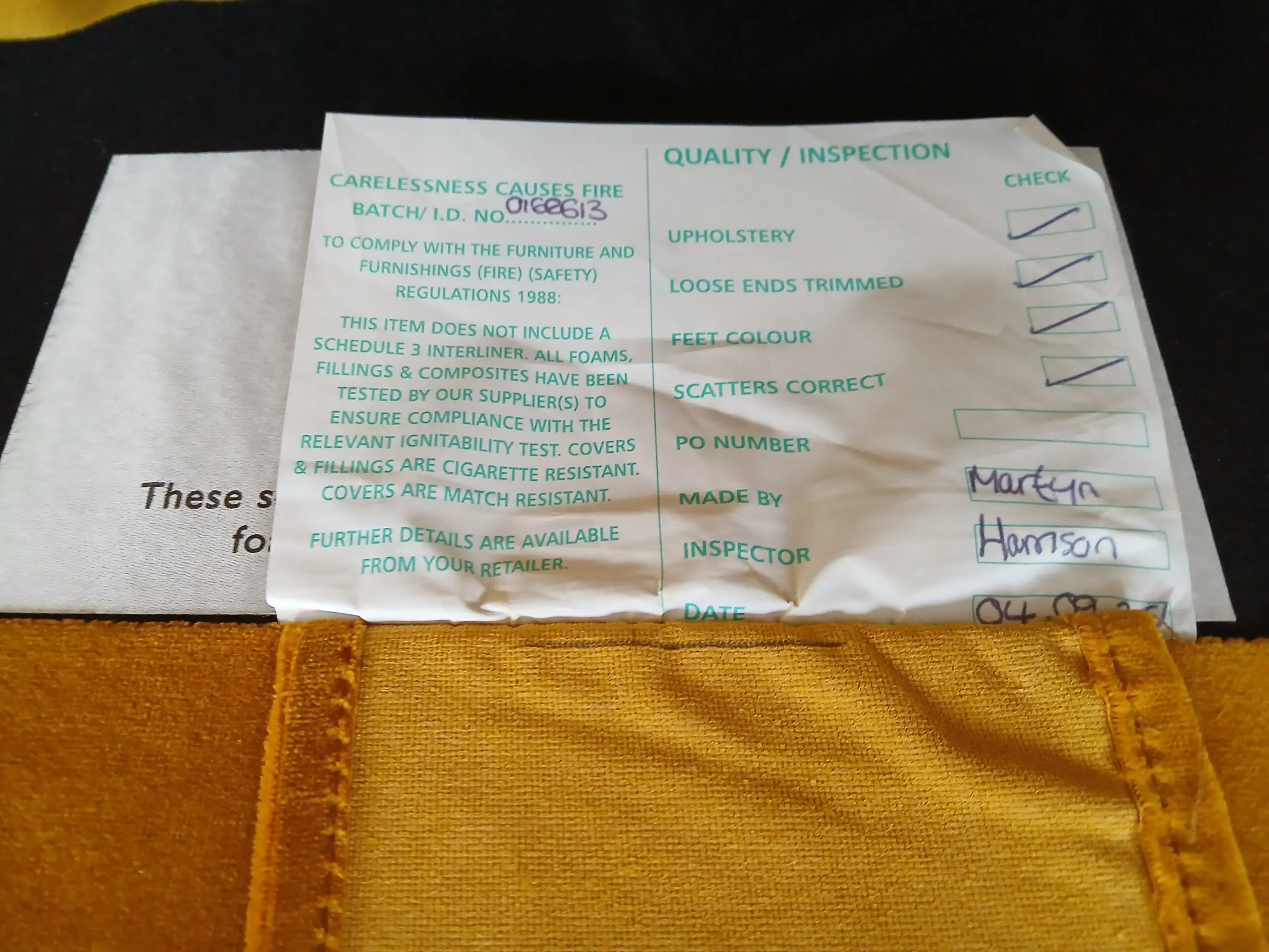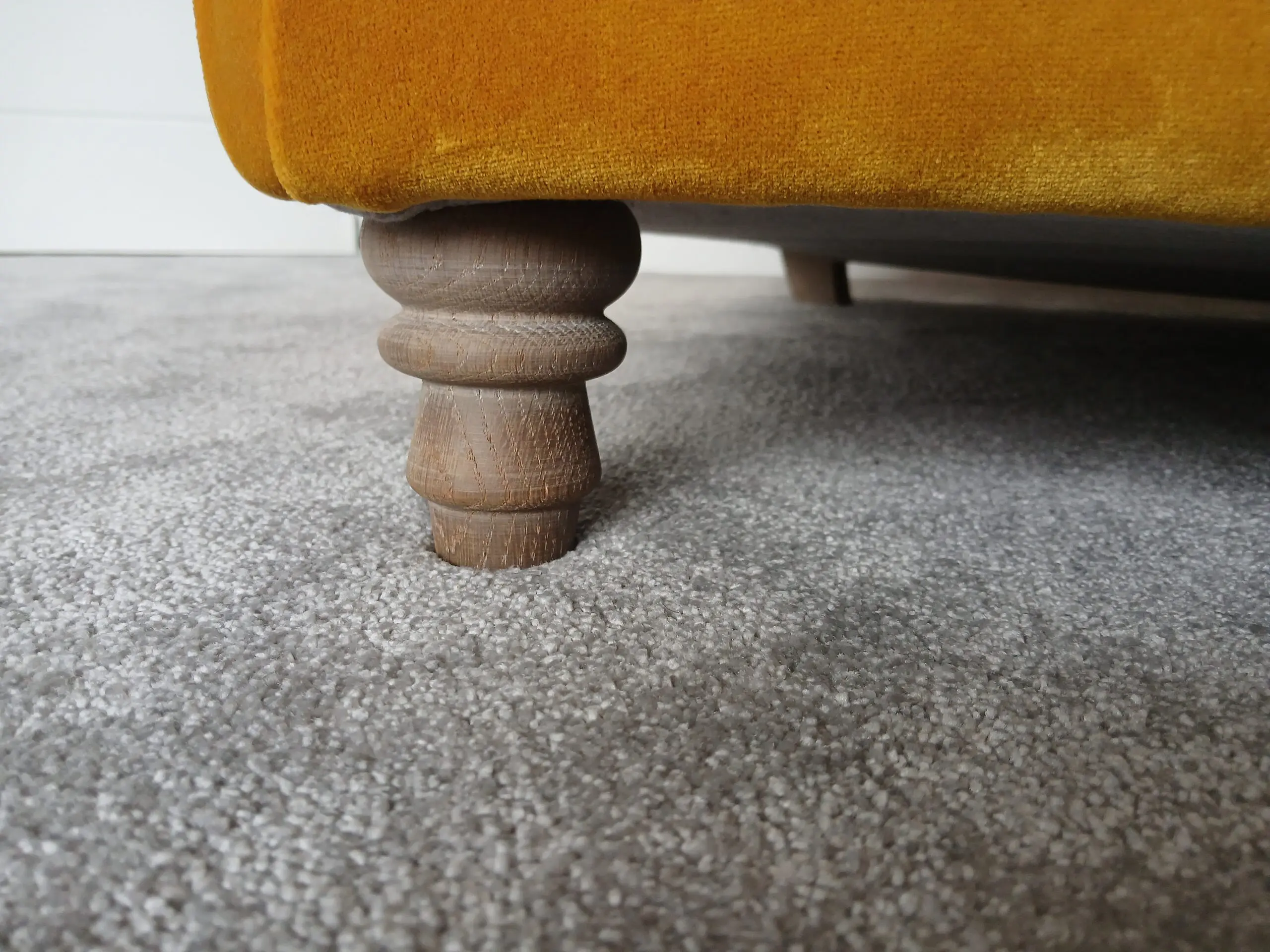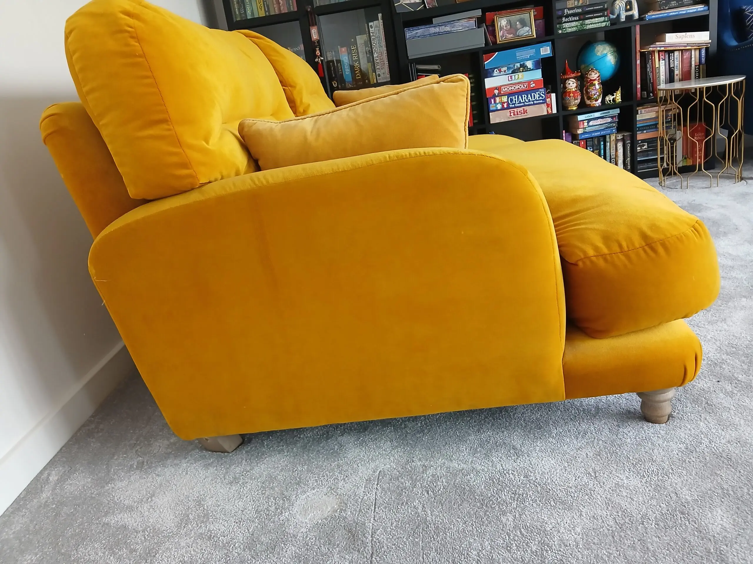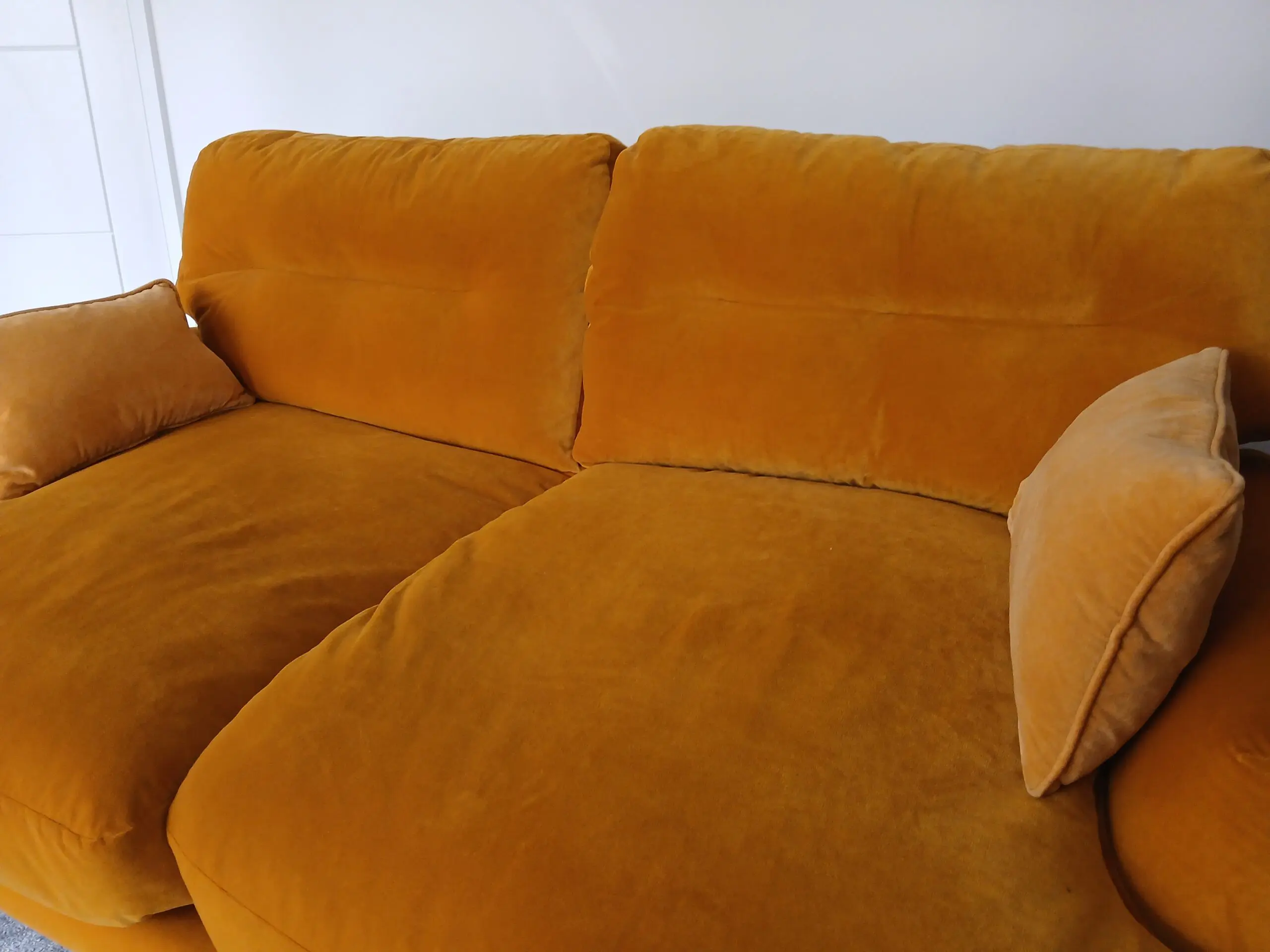 Elegant comfortable velvet Loaf Sugar Bum yellow/mustard 3-seater sofa in good condition with additional 2 side matching cushions, standing on beautifully wooden crafted feet.
