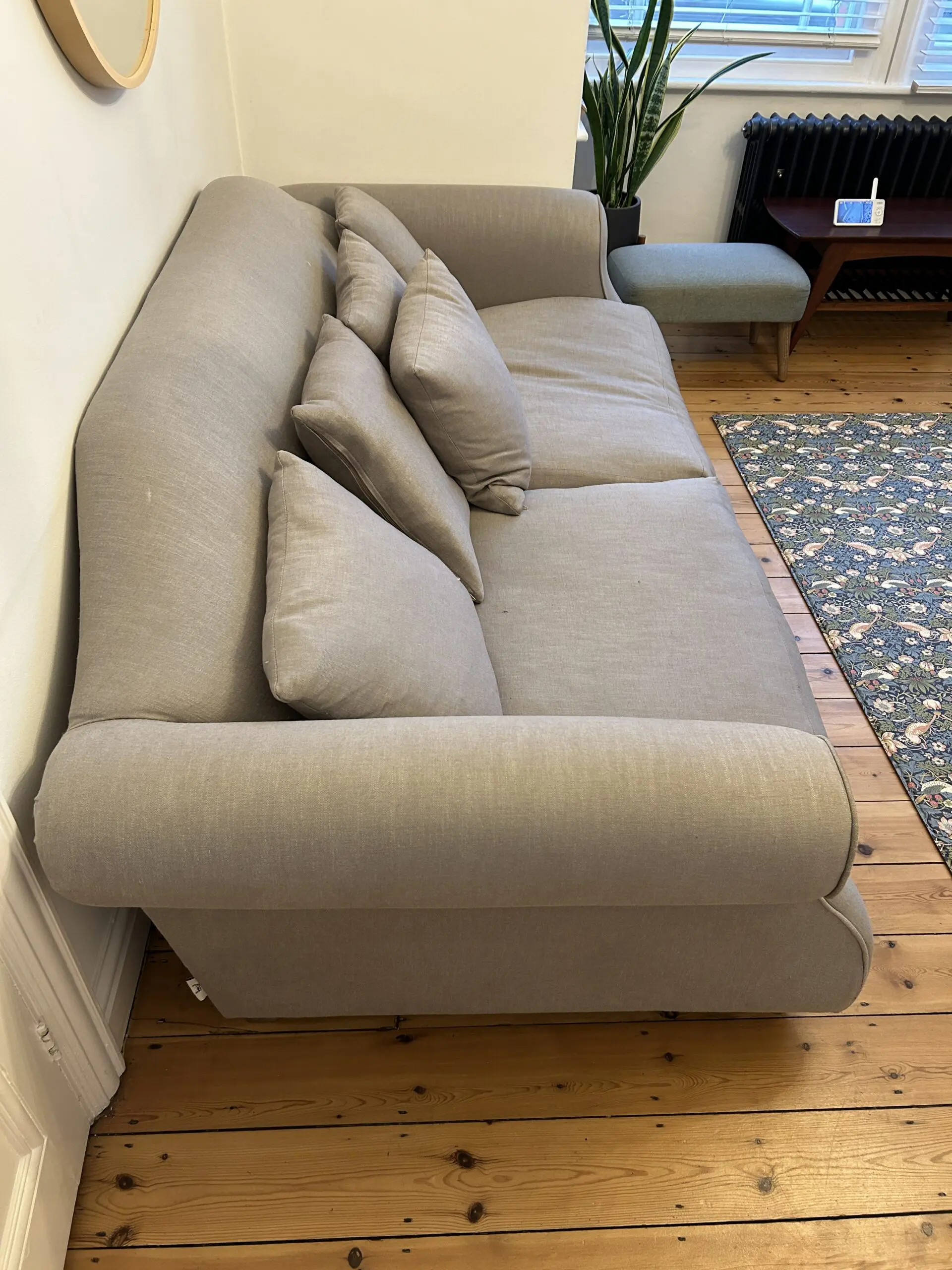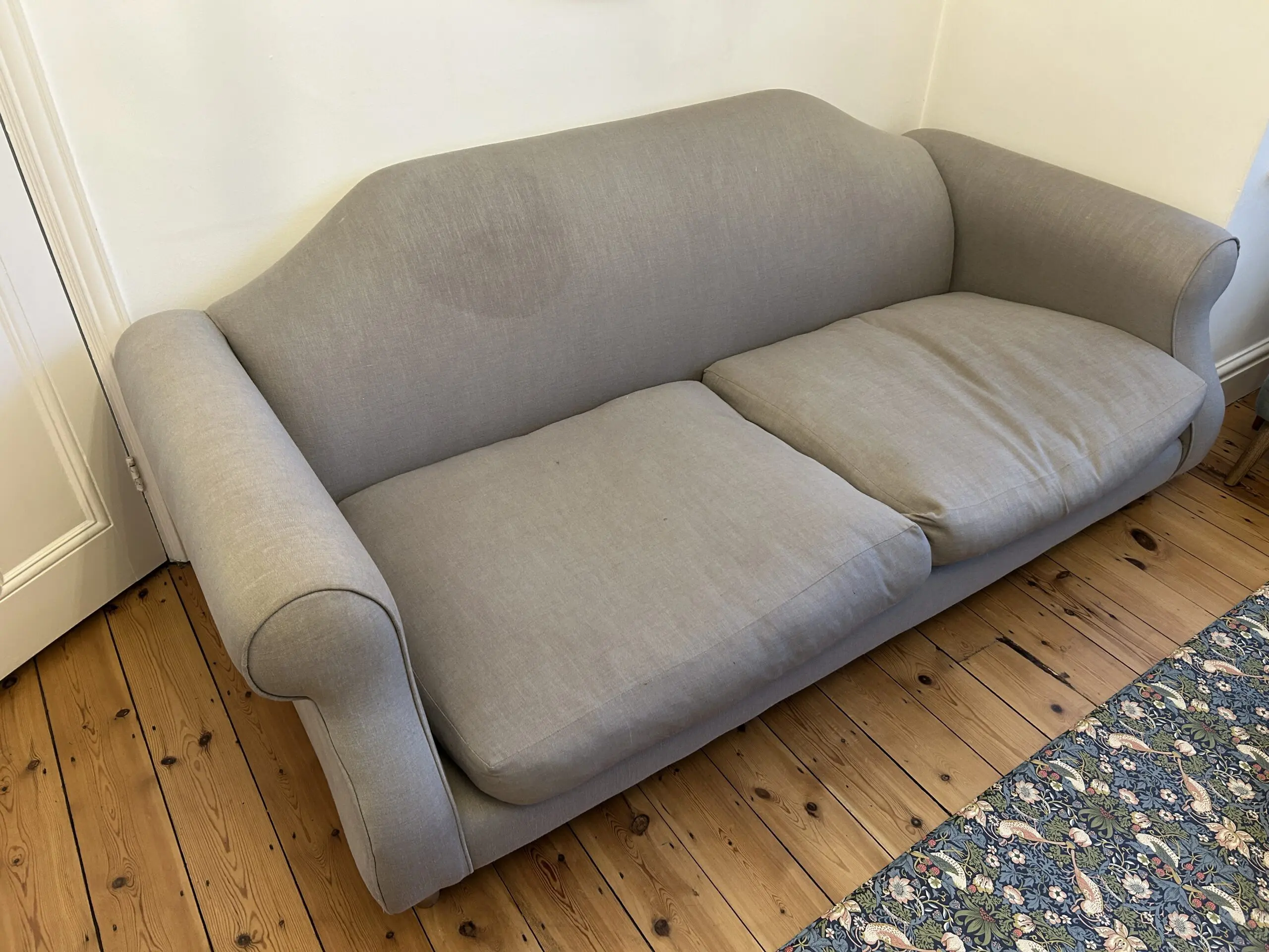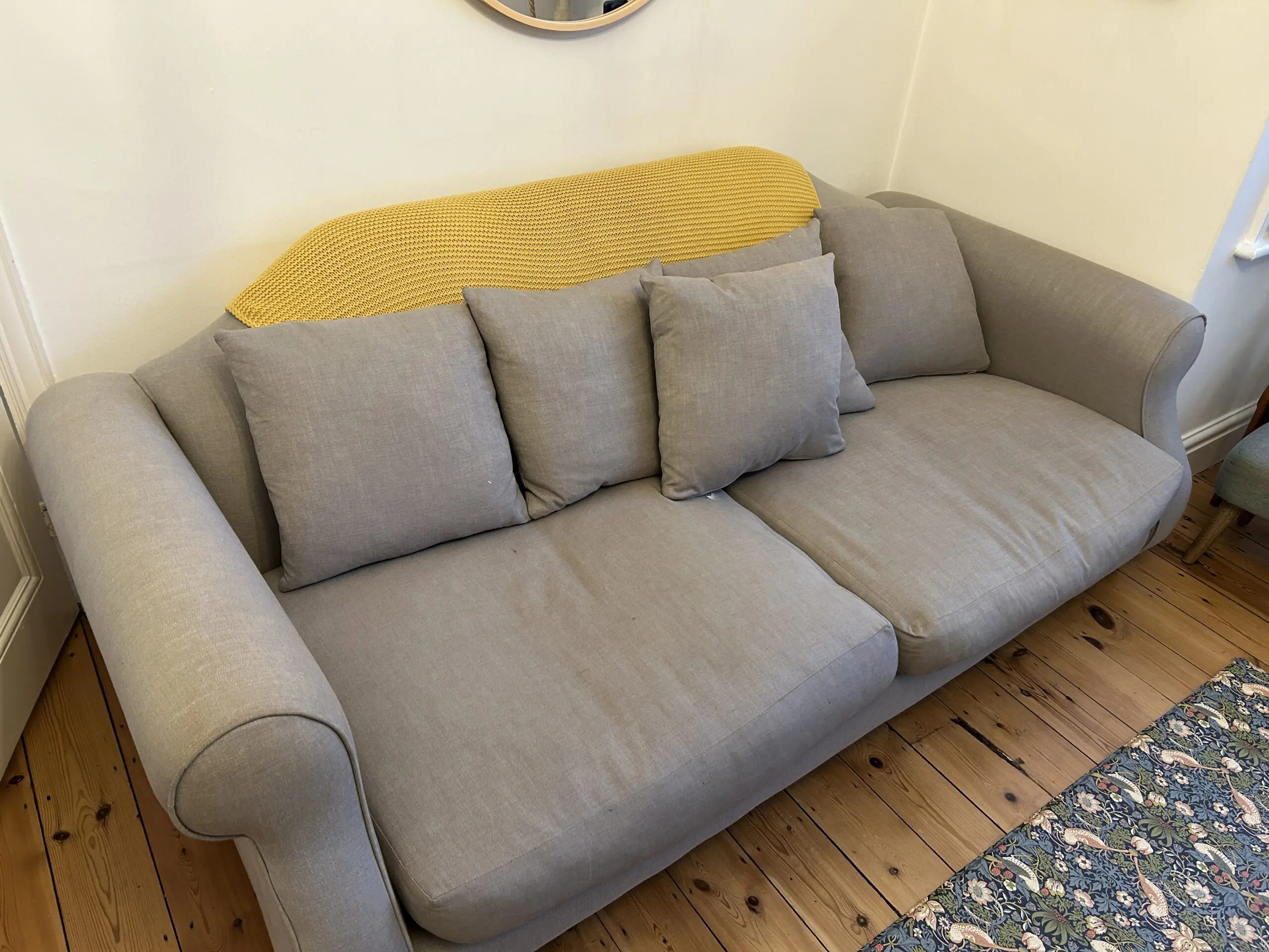 A generously sized Loaf Sloucher sofa in the large size — known for its deep seats, solid build and serious comfort. This one was made in 2017 and has plenty of life left in it, especially for someone looking for a well-made base to refresh or use in a high-traffic family space.