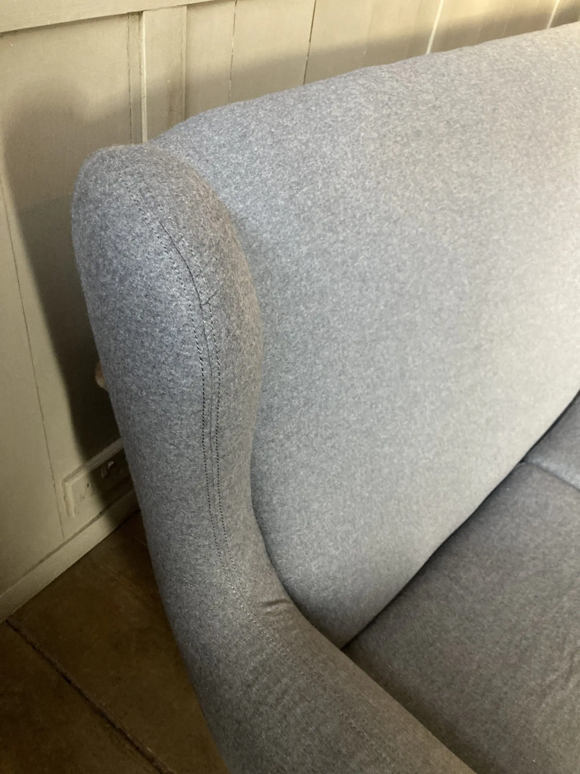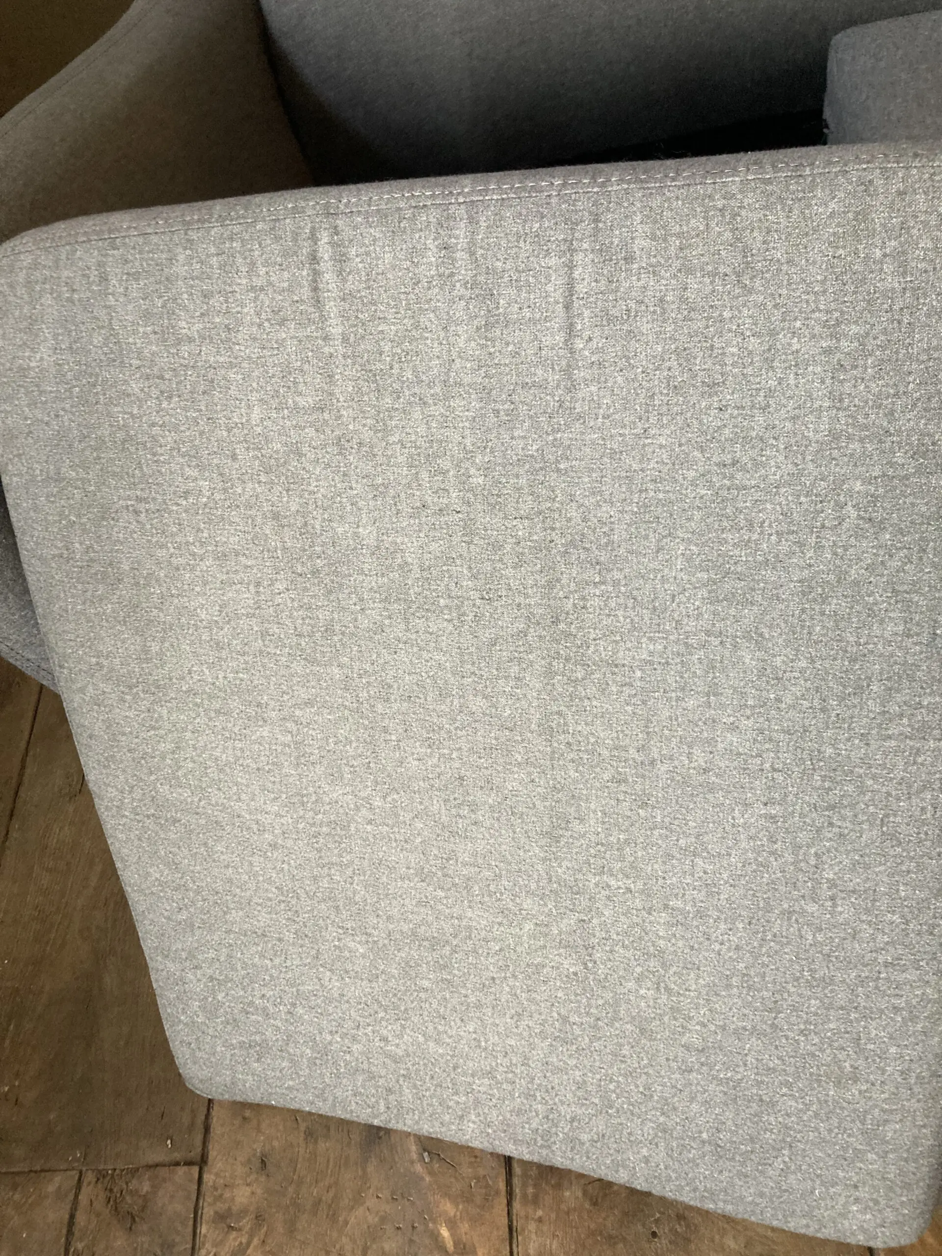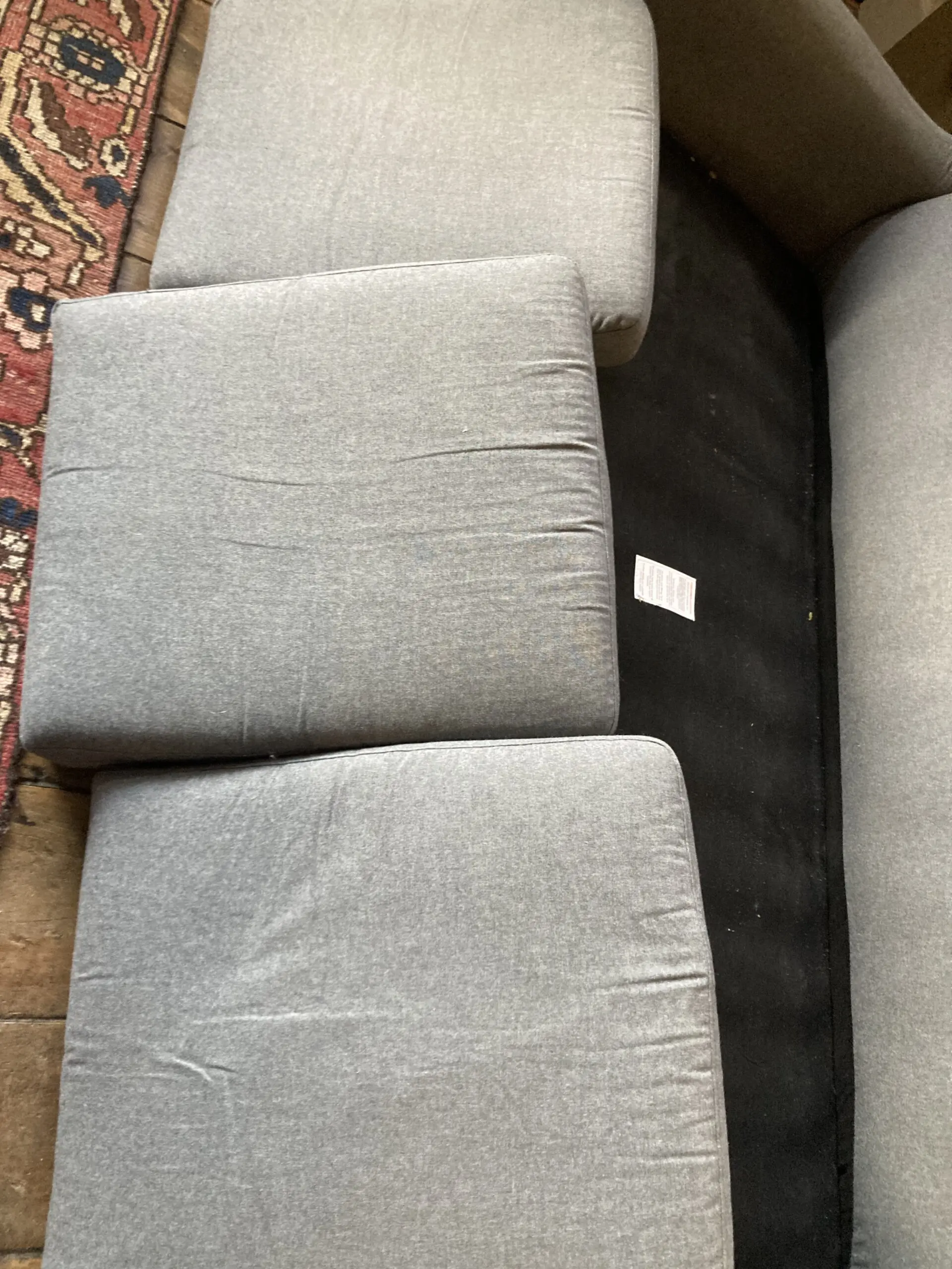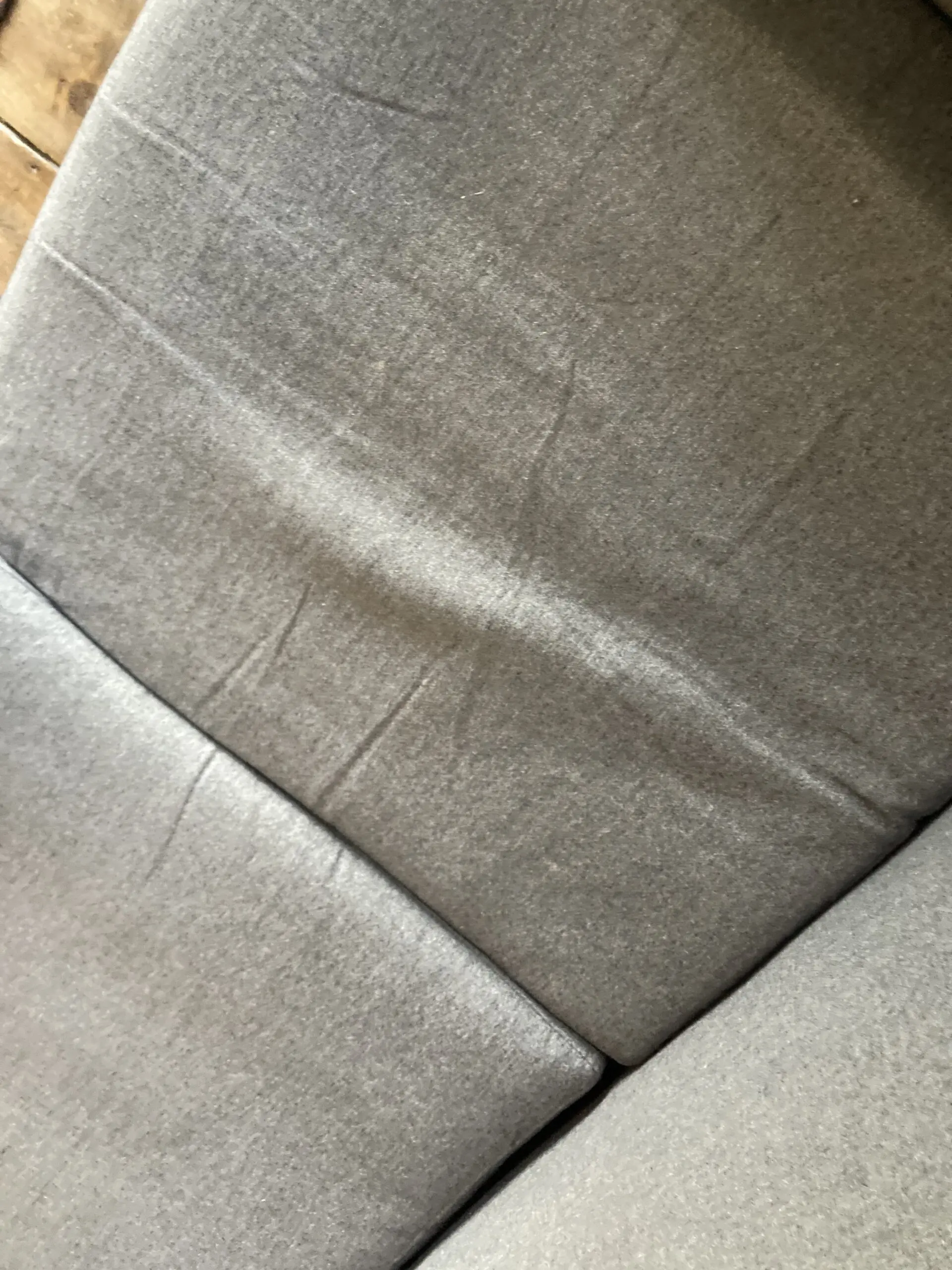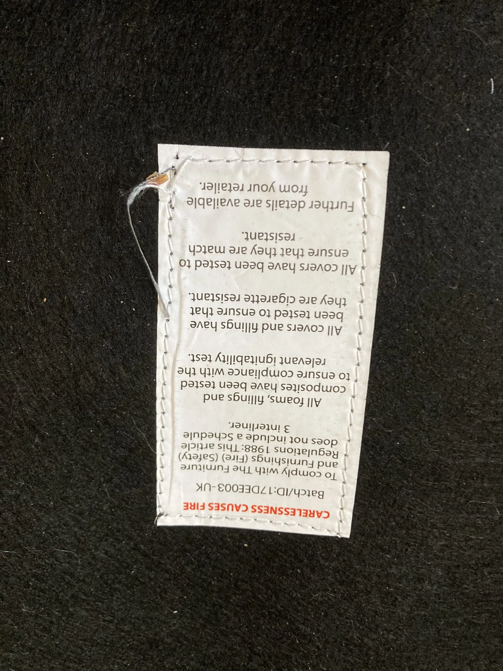 Bought around 8 years ago, smoke, young child and pet free home. Some marks and stains but not that noticeable due to dark colour. Never had it cleaned but could be. Very comfy and stylish just doesn’t fit our new front room. Some stitches coming loose could be repaired but doesn’t appear to be getting worse.