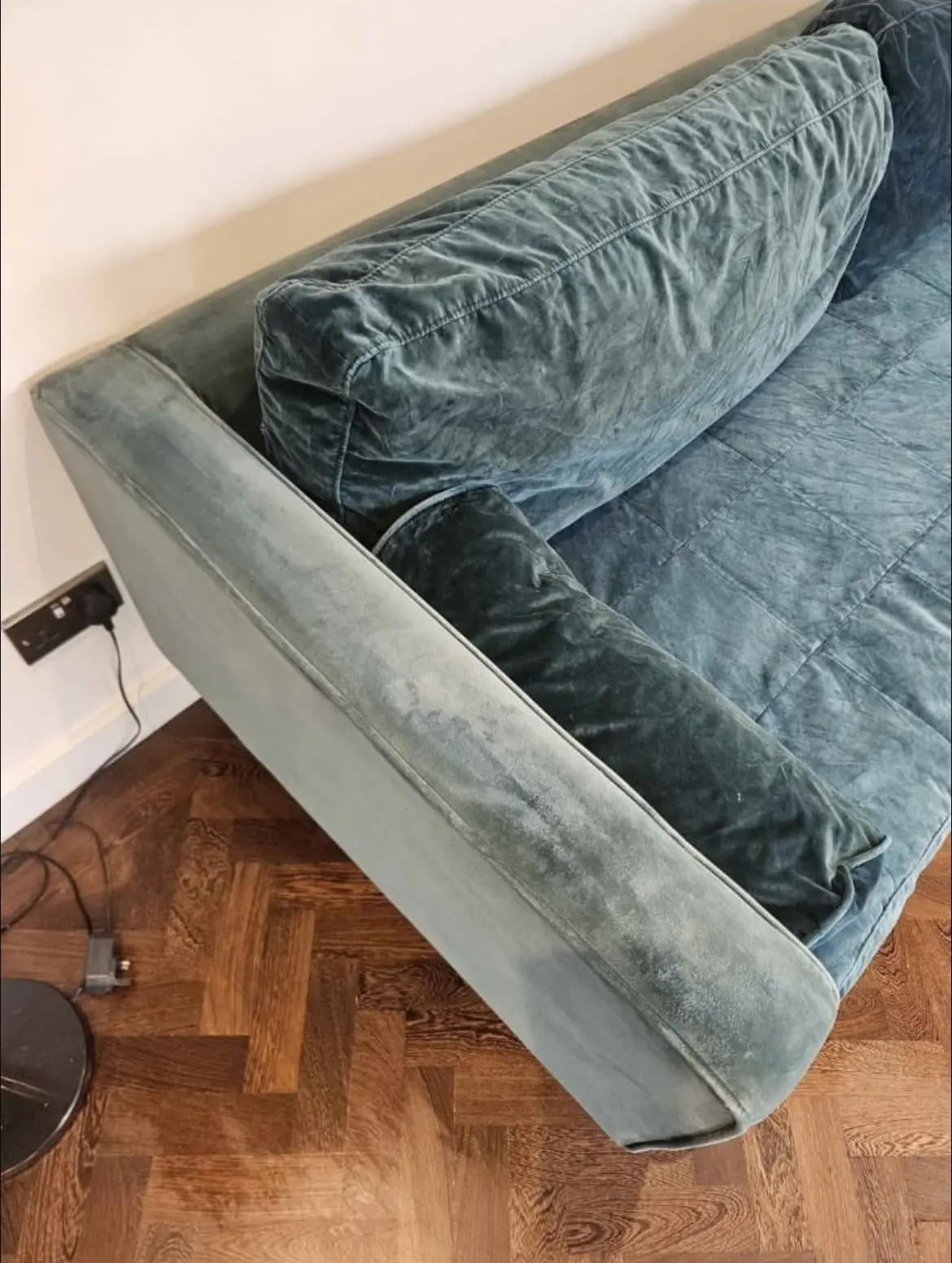 seater Scott sofa. We’ve had it for years and it’s still super comfy, but we’ve outgrown it and need something bigger. Some marks and fading as shown in pictures. Throw cushions not included.