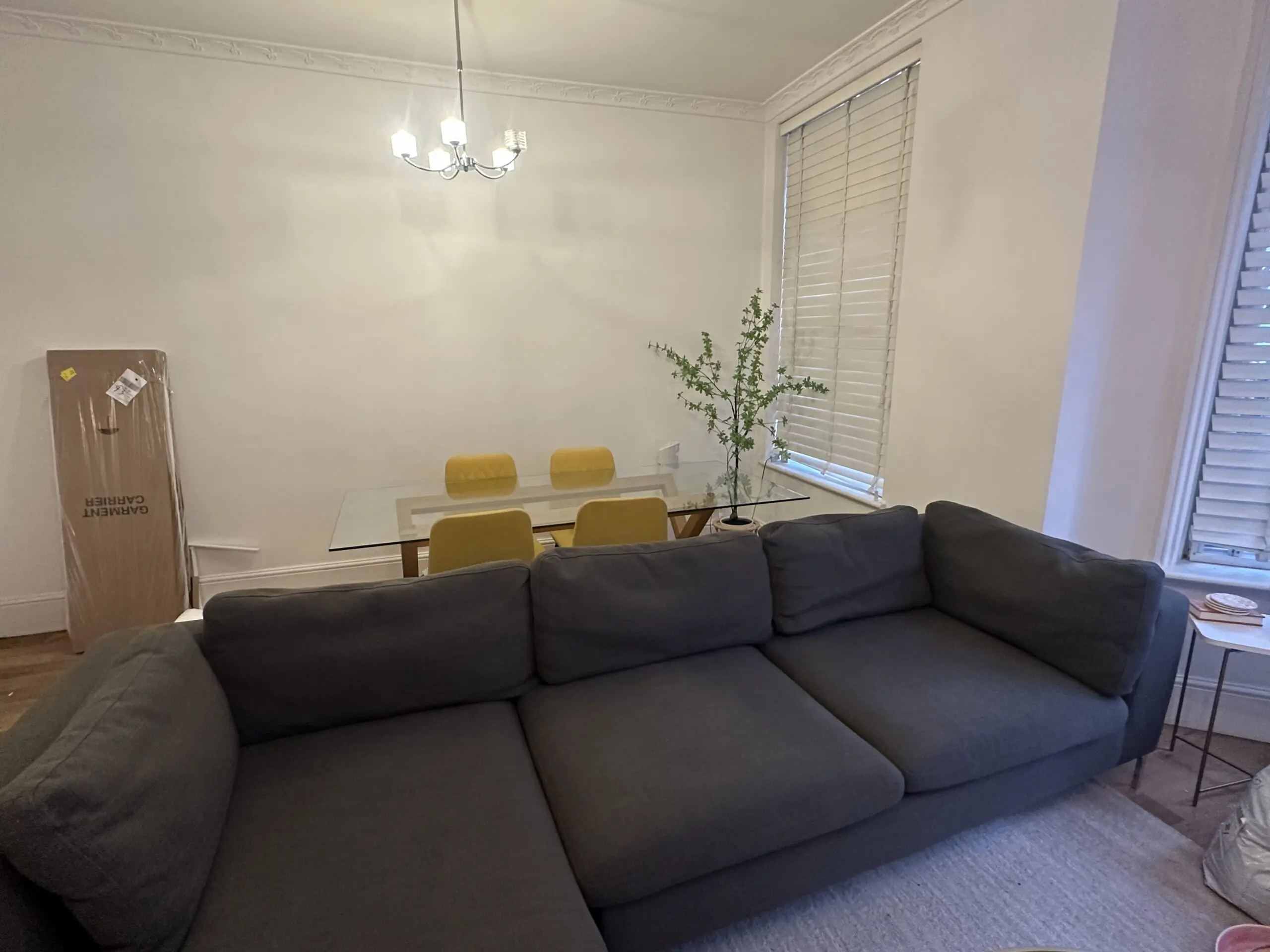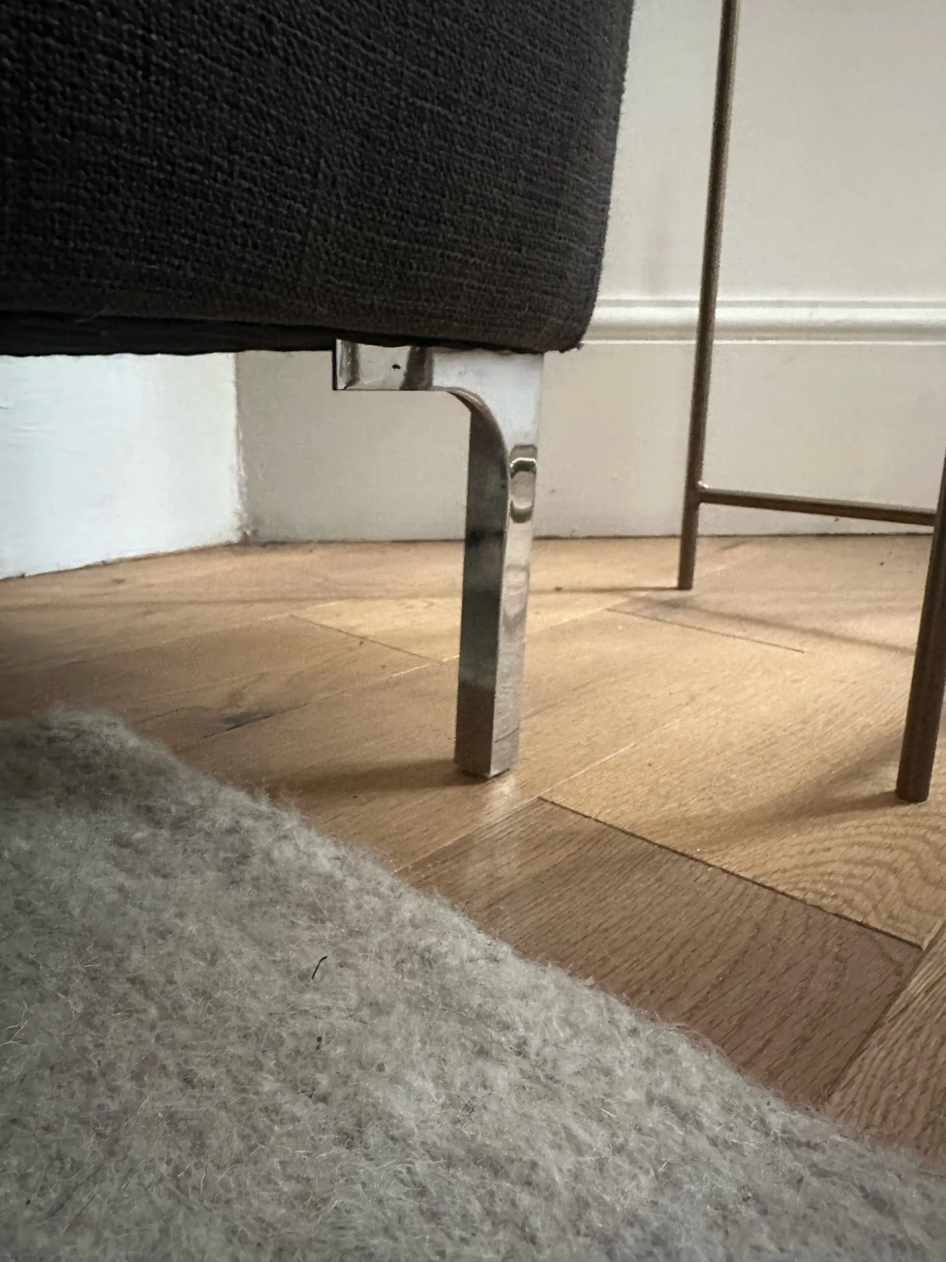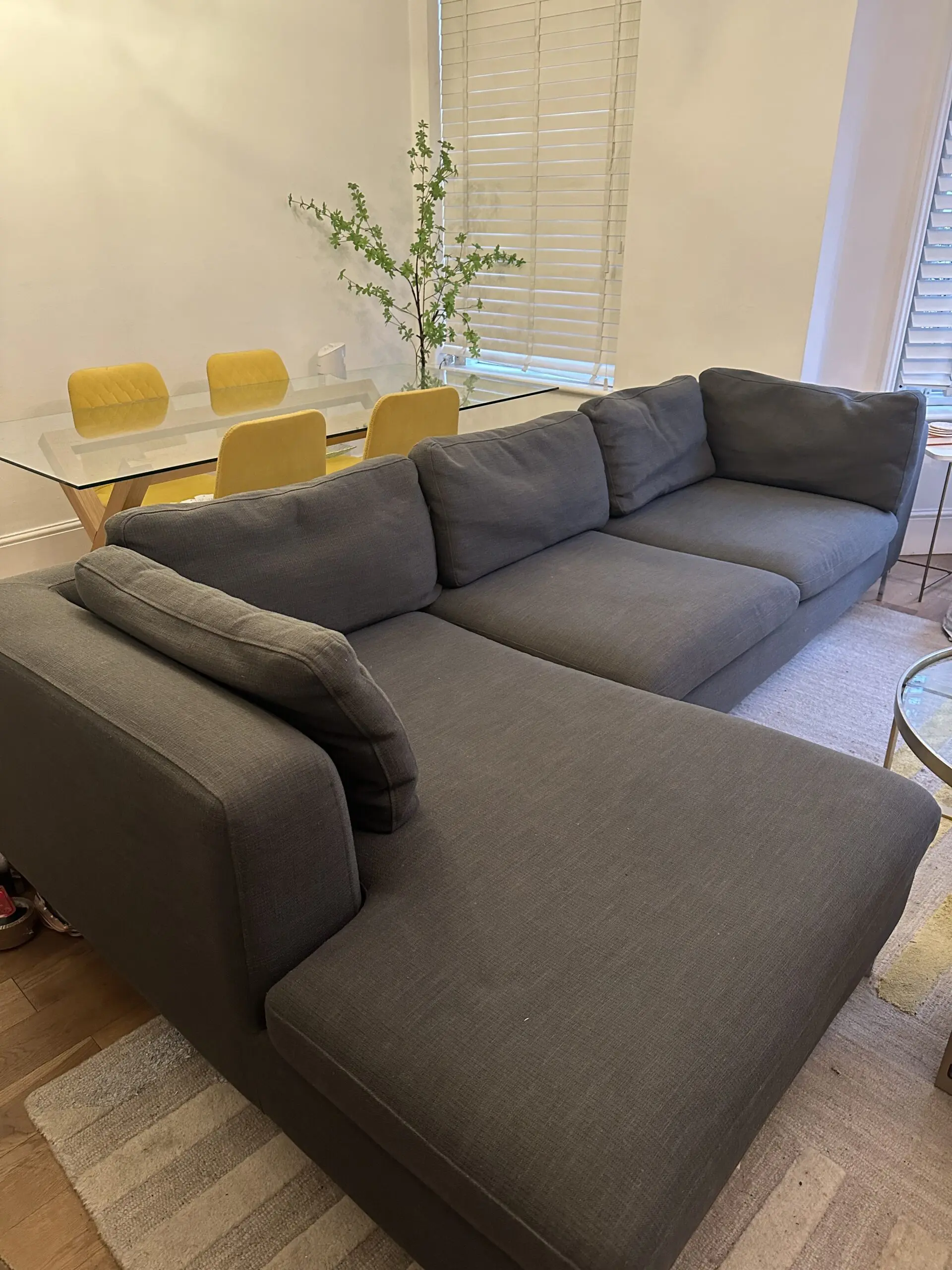 Selling a Made.com Monterosso L-shaped corner sofa in “Oyster Grey.” It features a slim-profile Scandi design with chrome “pencil” legs.