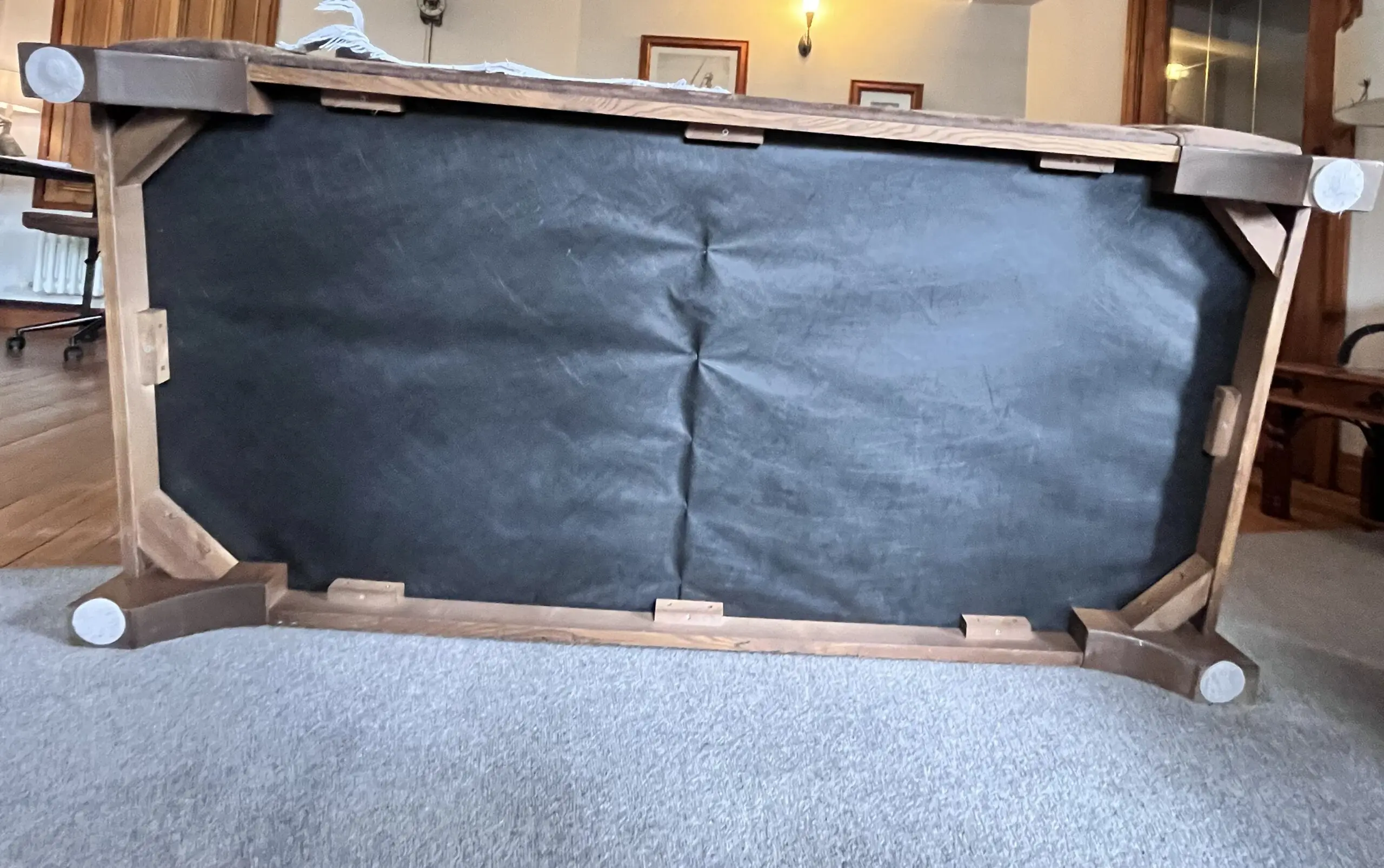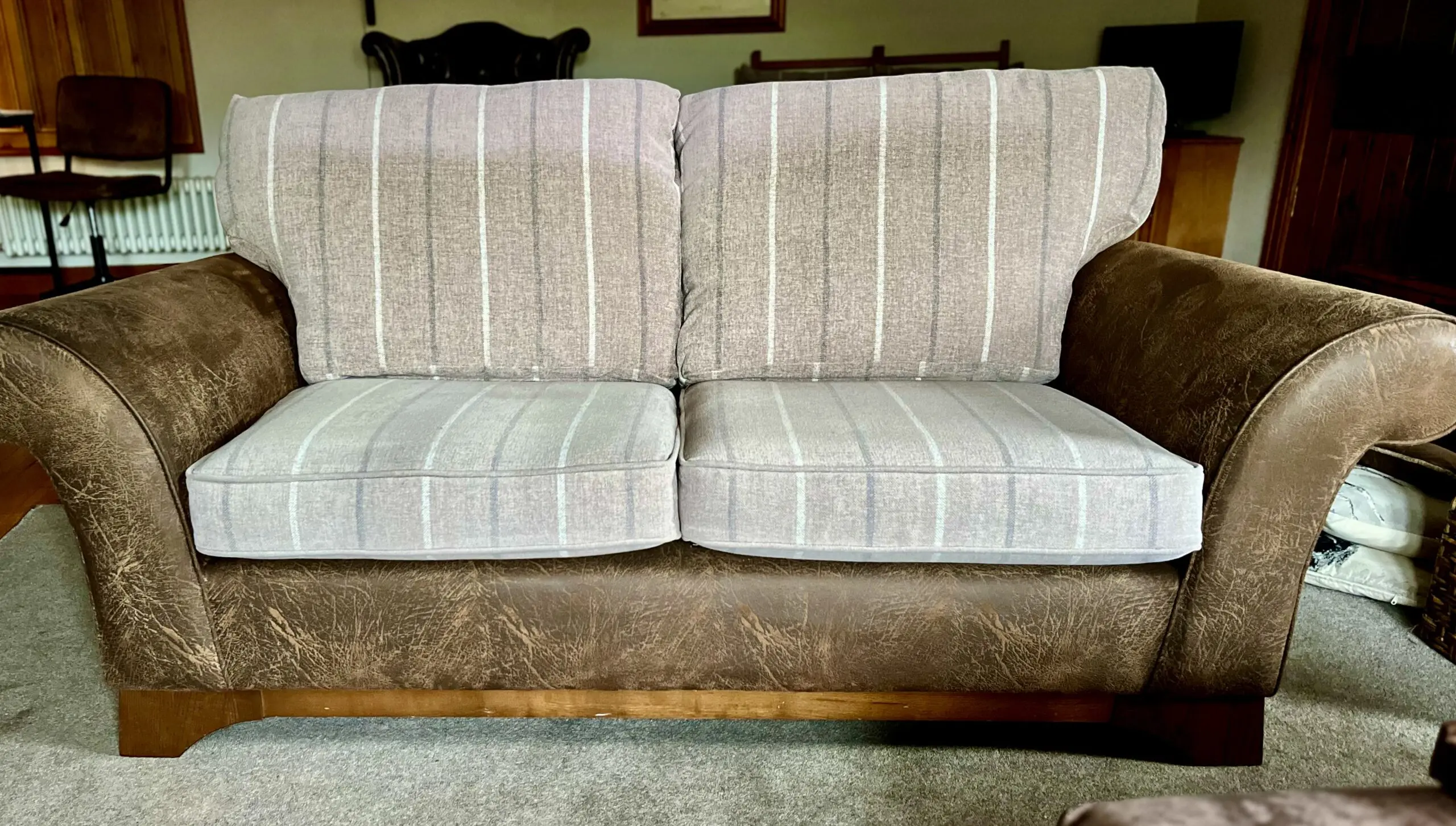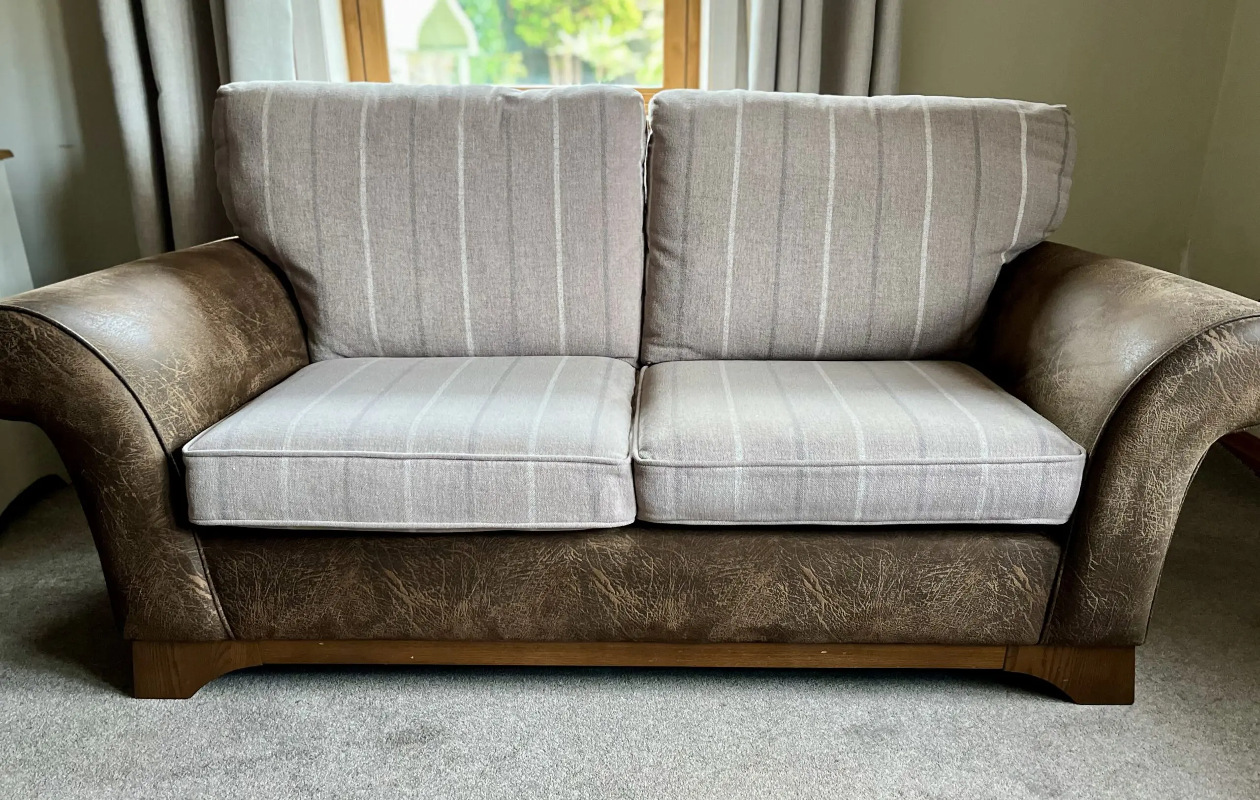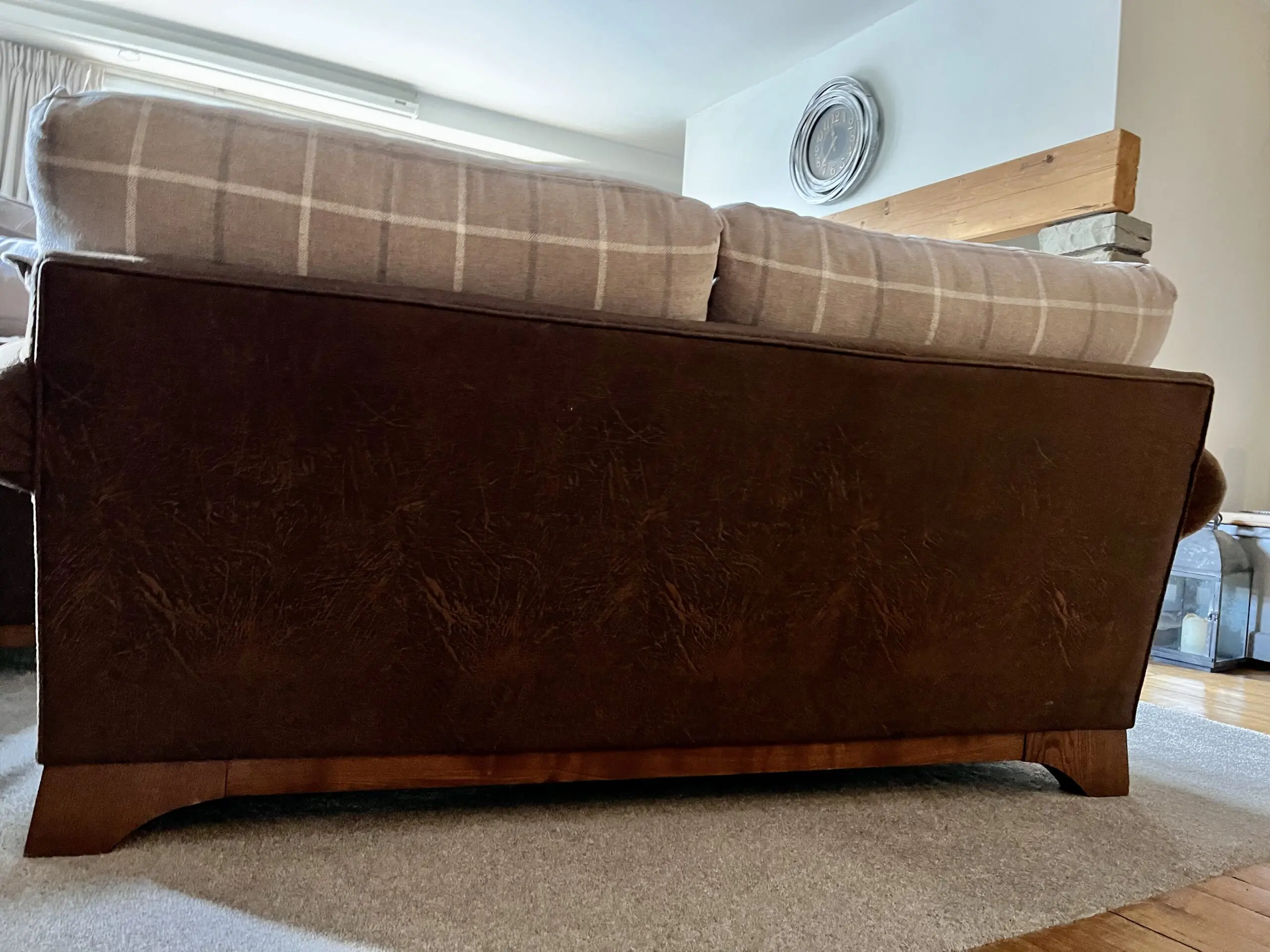 These sturdy 3 seater sofas are faux leather and fabric mix. They have lovely solid wooden frames. We are a pet free and smoke free home. There are no tears or damage to the sofas.