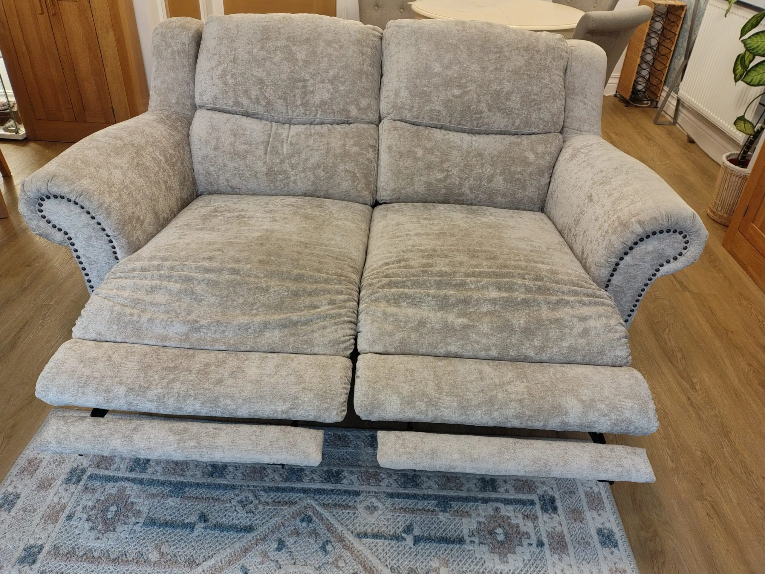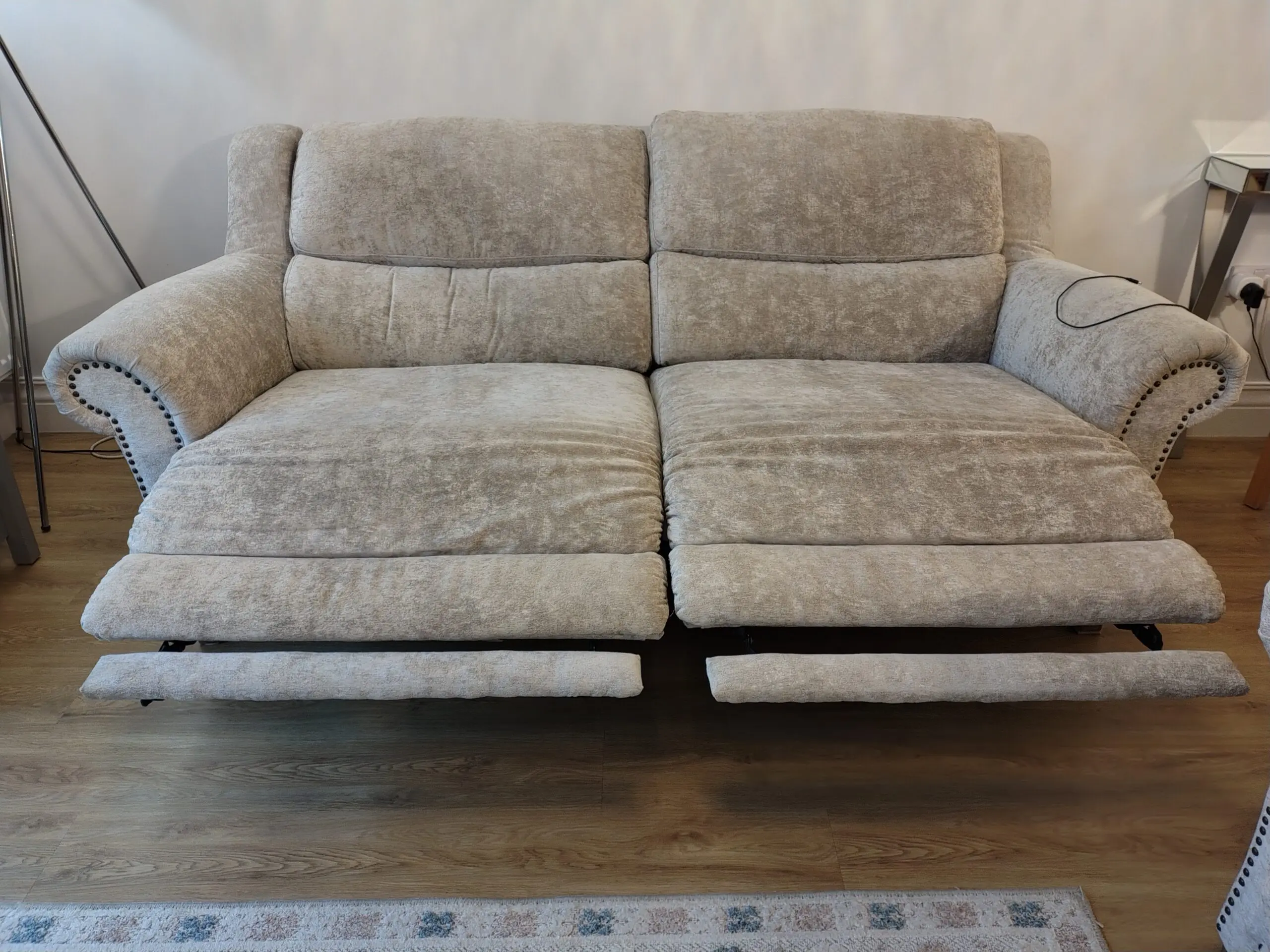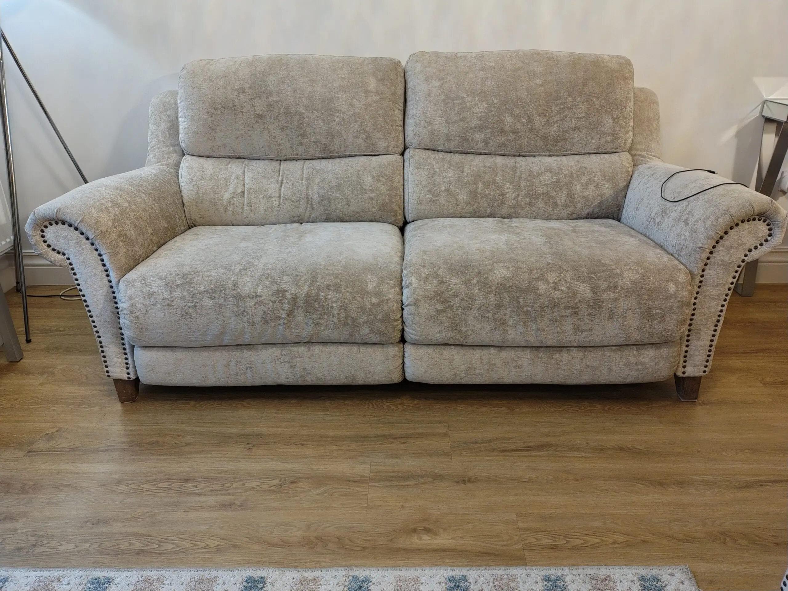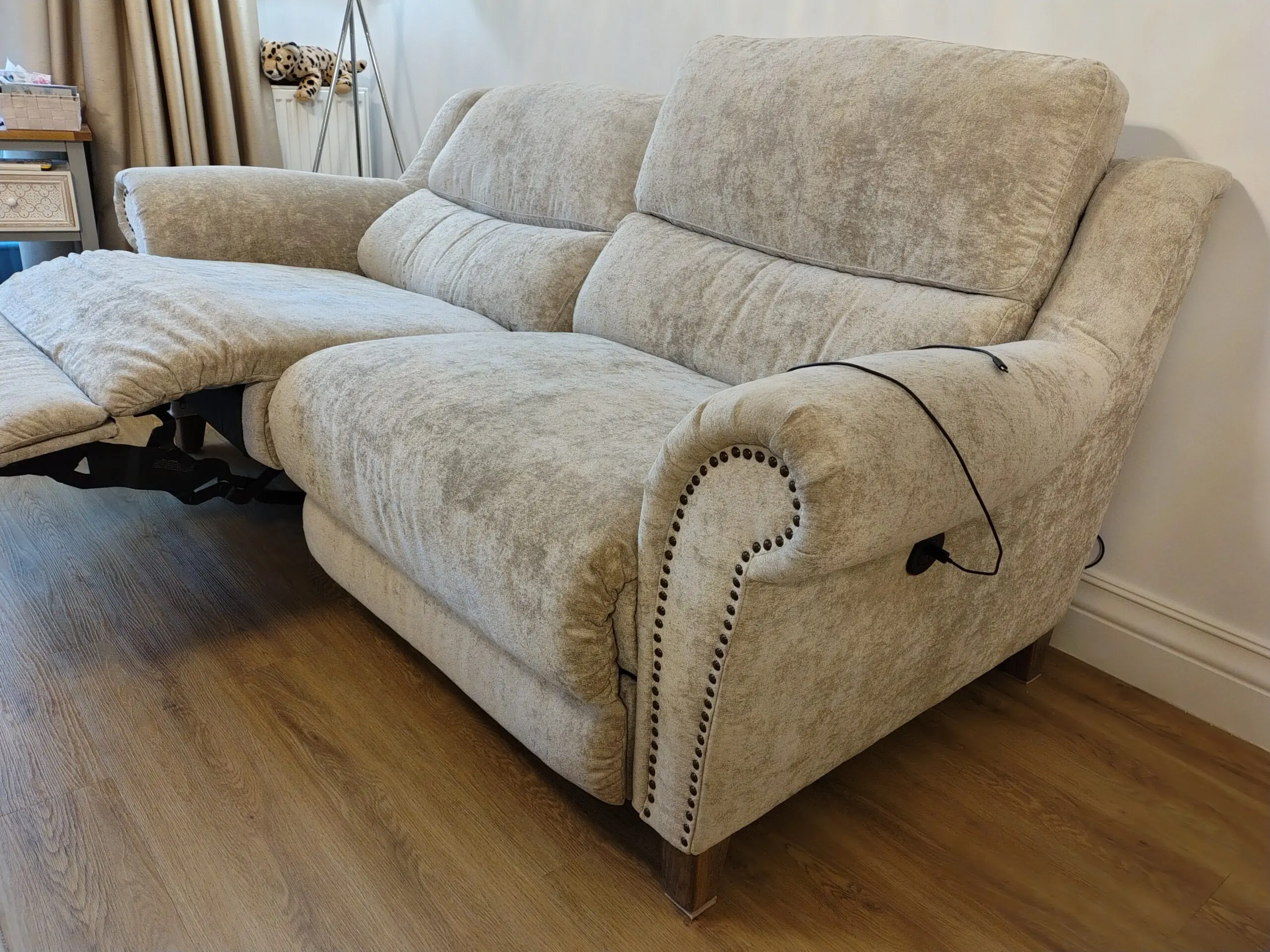 Very comfortable matching 2 and 3 seater sofas. Electric recliner action (working) beige/cream chenille fabric with studded arm detail.