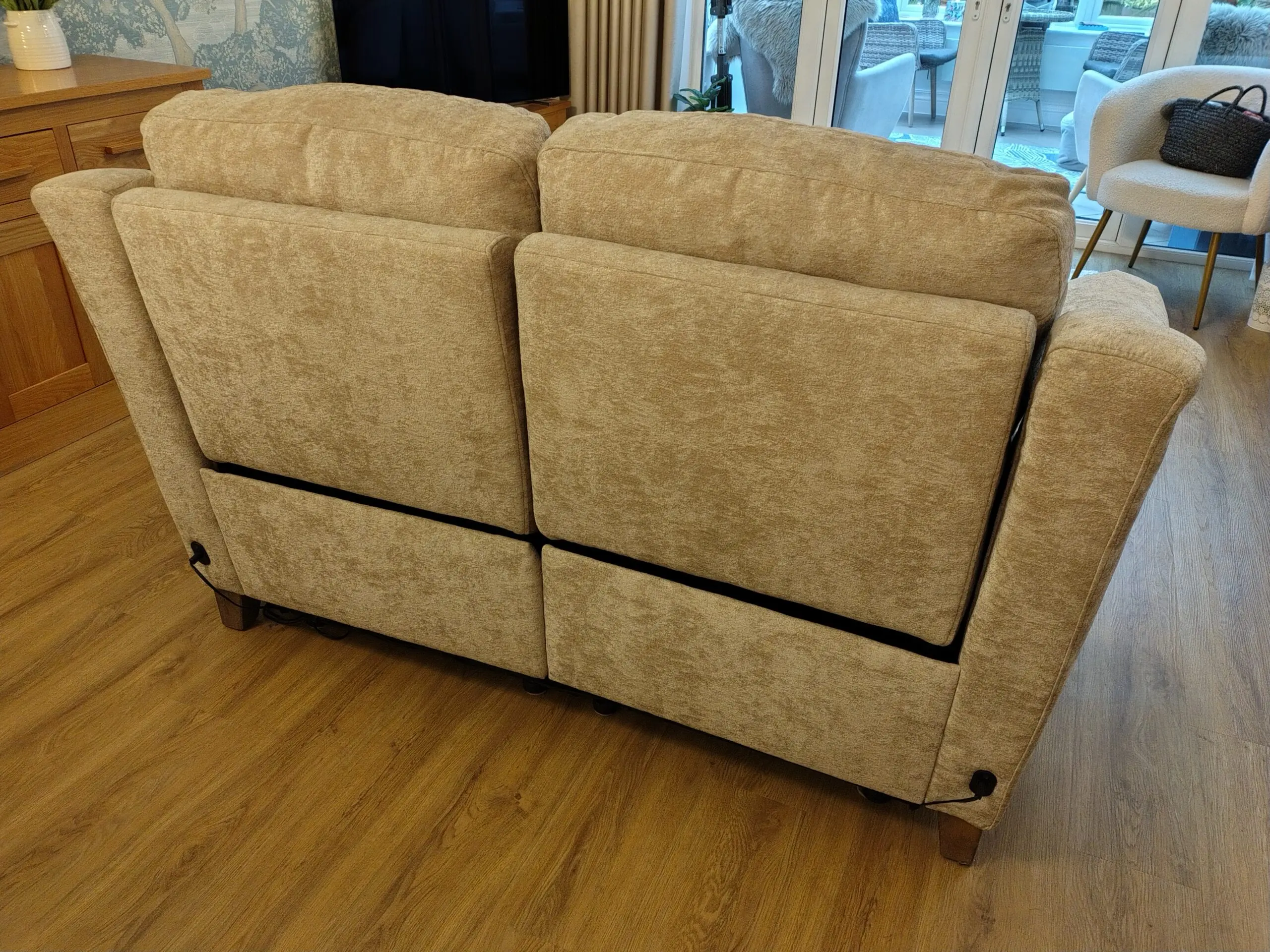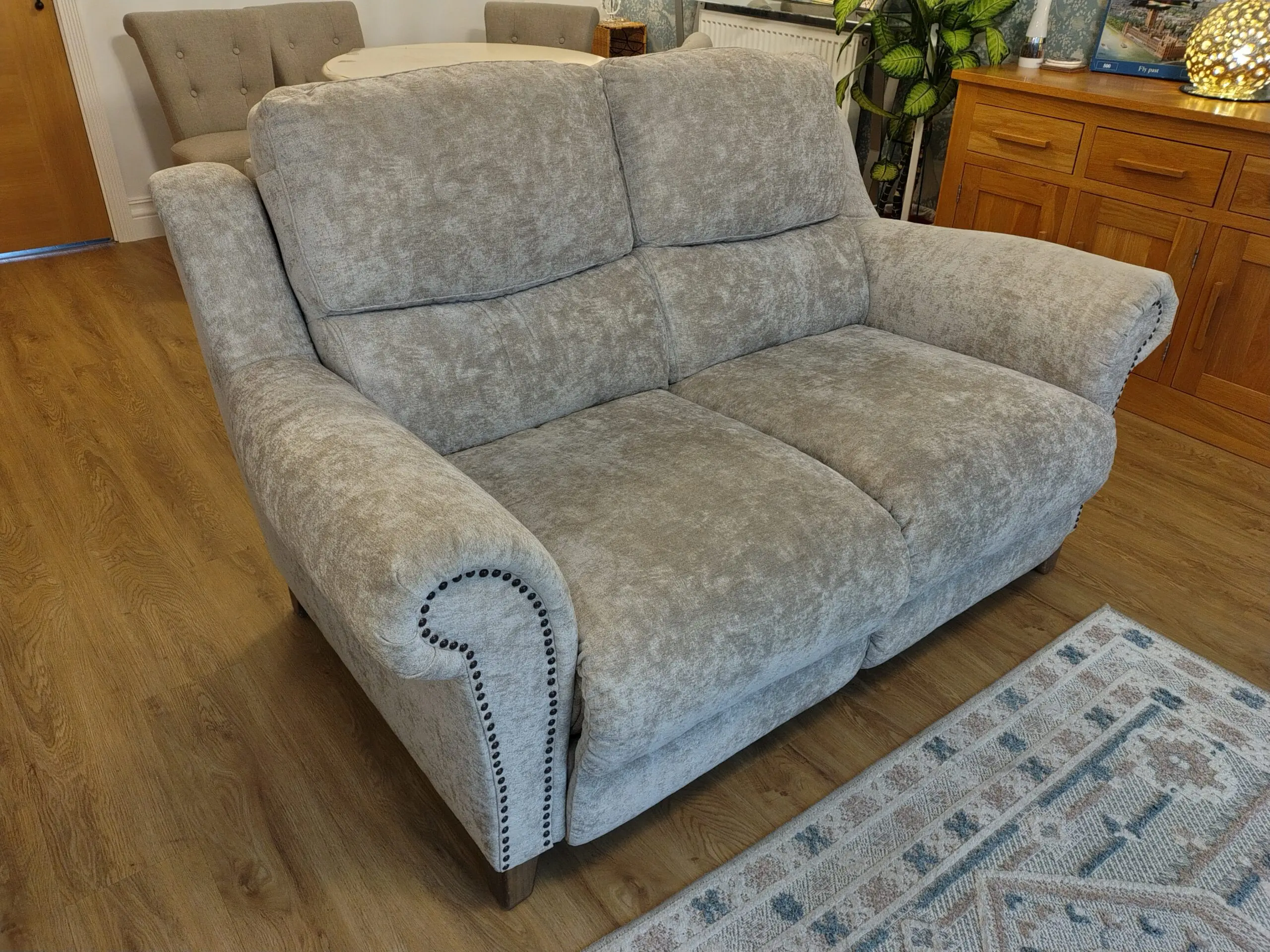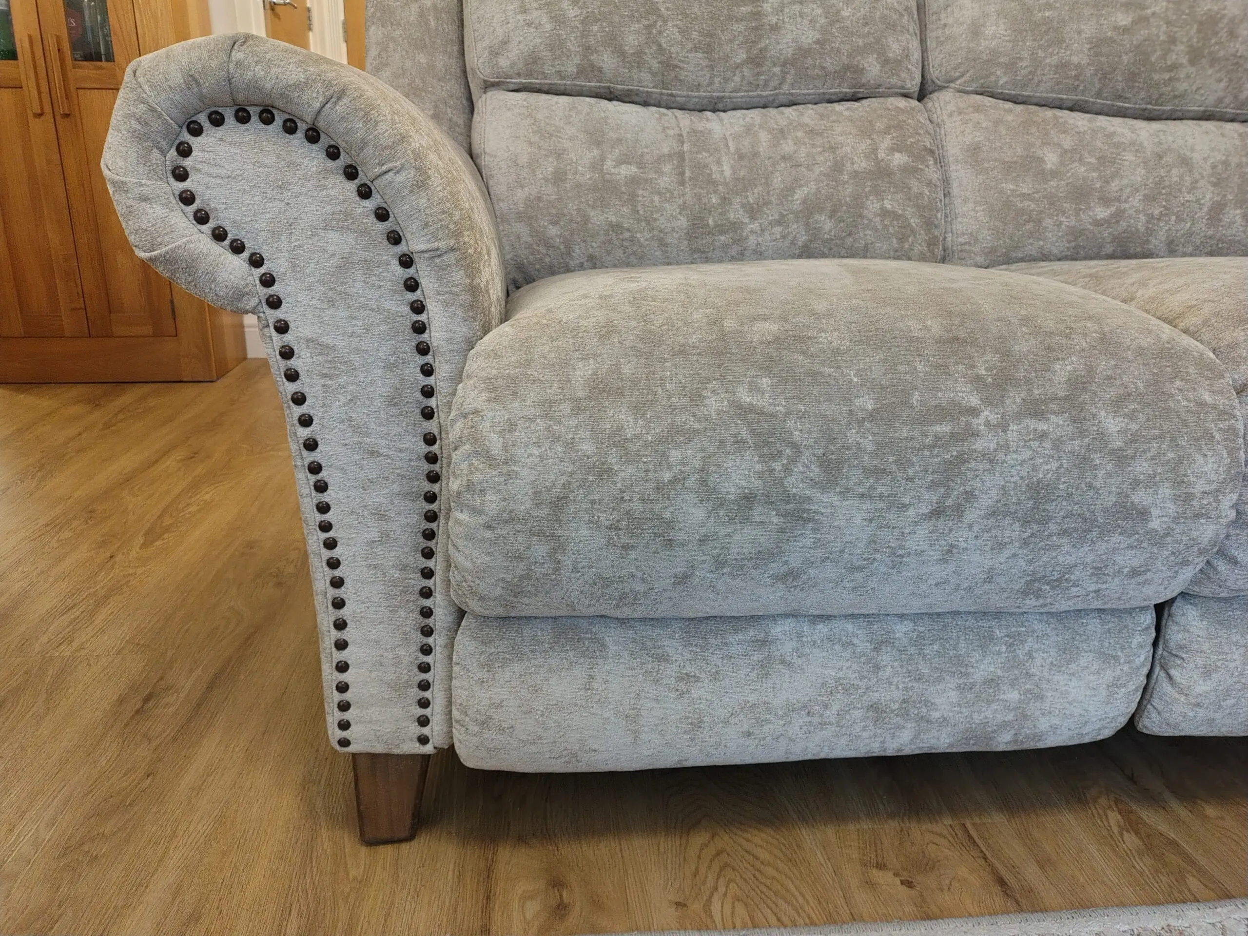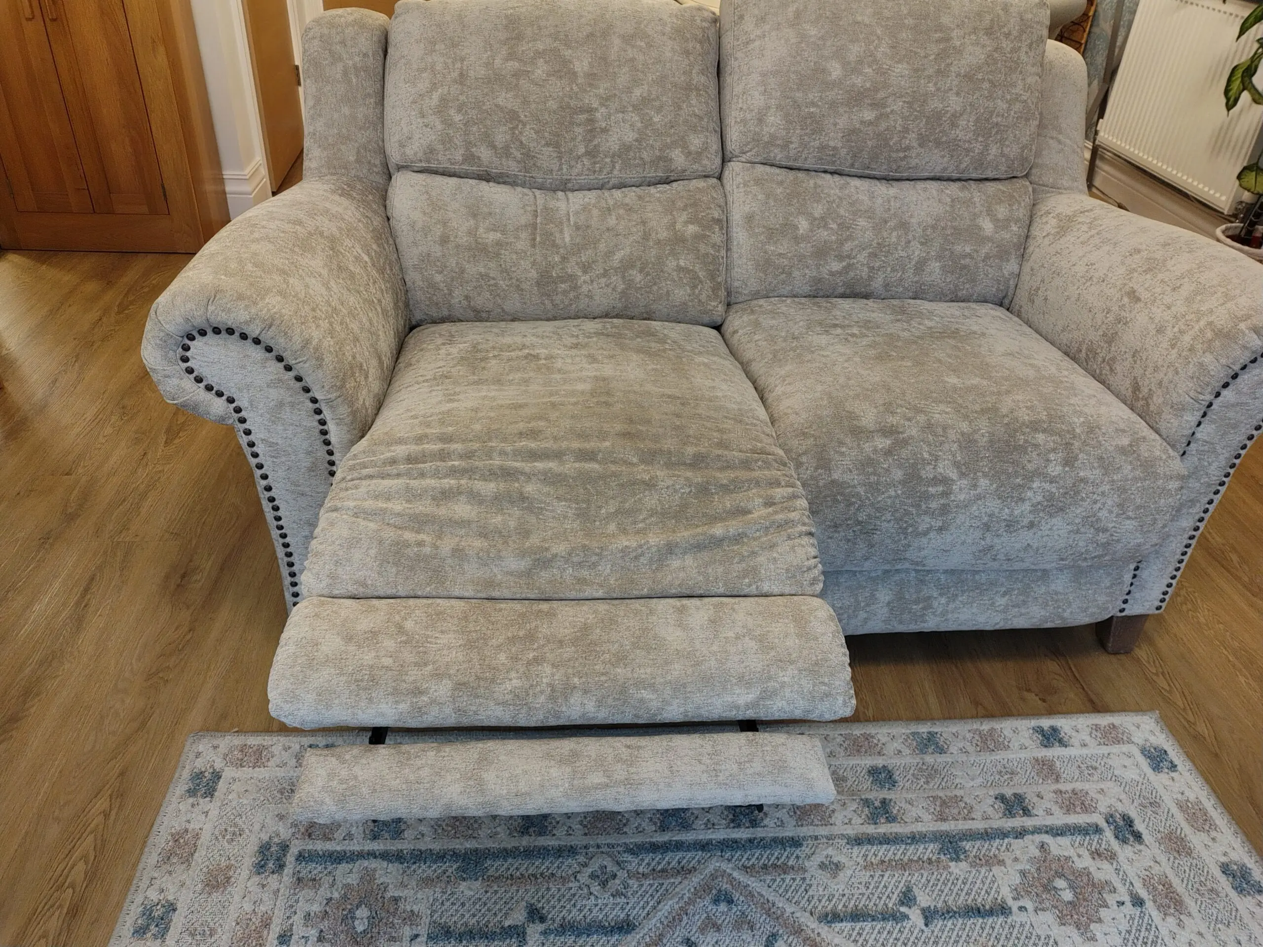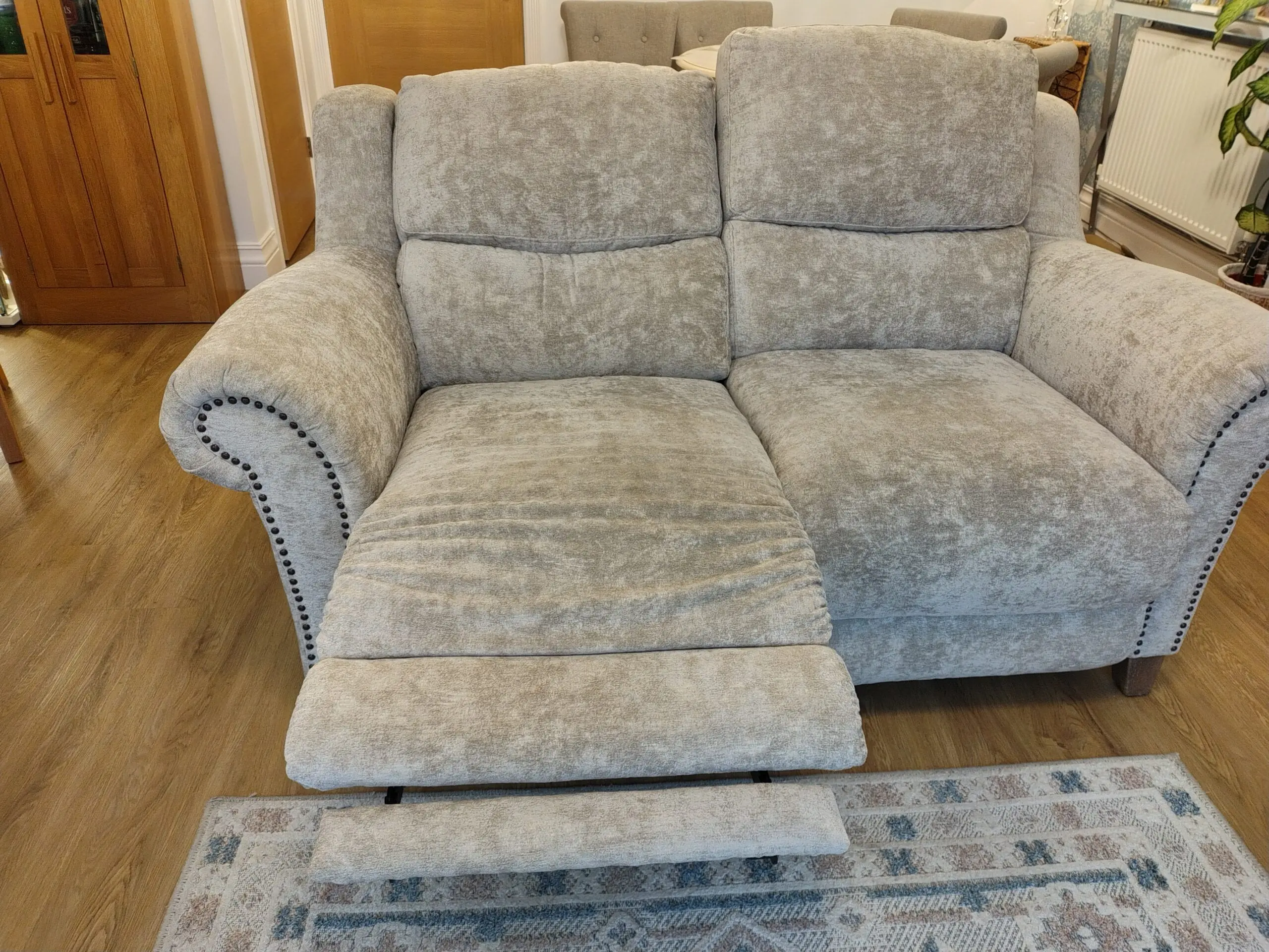 Very comfortable matching 2 and 3 seater sofas. Electric recliner action (working) beige/cream chenille fabric with studded arm detail.