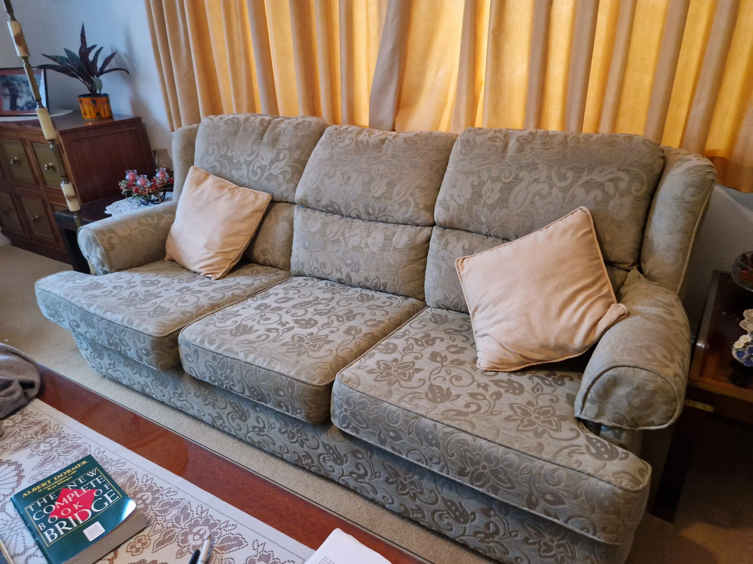 Matching 3 seater, 2 seater and armchair – a classic, inviting piece with a vintage charm. Its upholstery features a soft light green base adorned with a delicate light floral pattern—subtle enough to feel timeless, yet detailed enough to add texture and warmth. Designed with high backs designed for comfort with firm base. It has been kept well, the armrests are removable and washable. It is fire resistant, however, as it was recently professionally recovered, these are more likely hidden with the removable cushions. The pale yellow/golden cushions are thrown in with the price, making the set complete. Seat depth on 3 seater around 65cm.