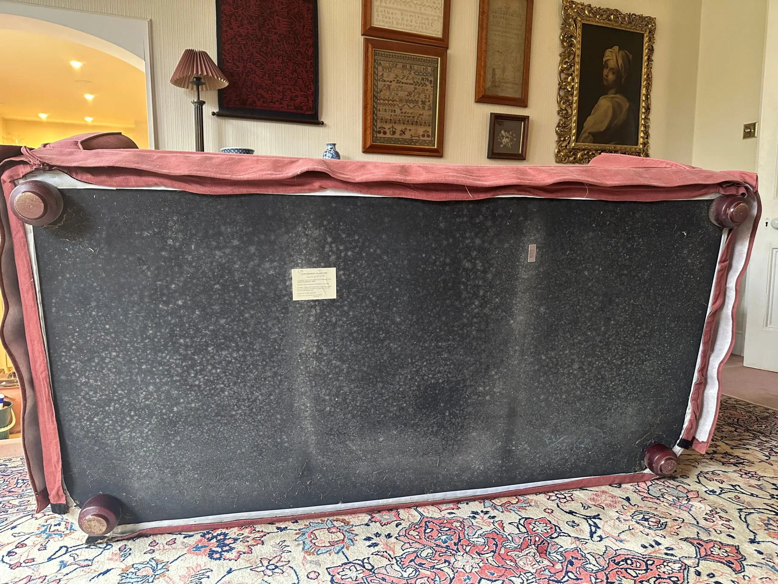A comfortable ” Chesterfield” style sofa, with a plain back and classic lines, in a loose russet pink linen fabric cover. Made by Minty.