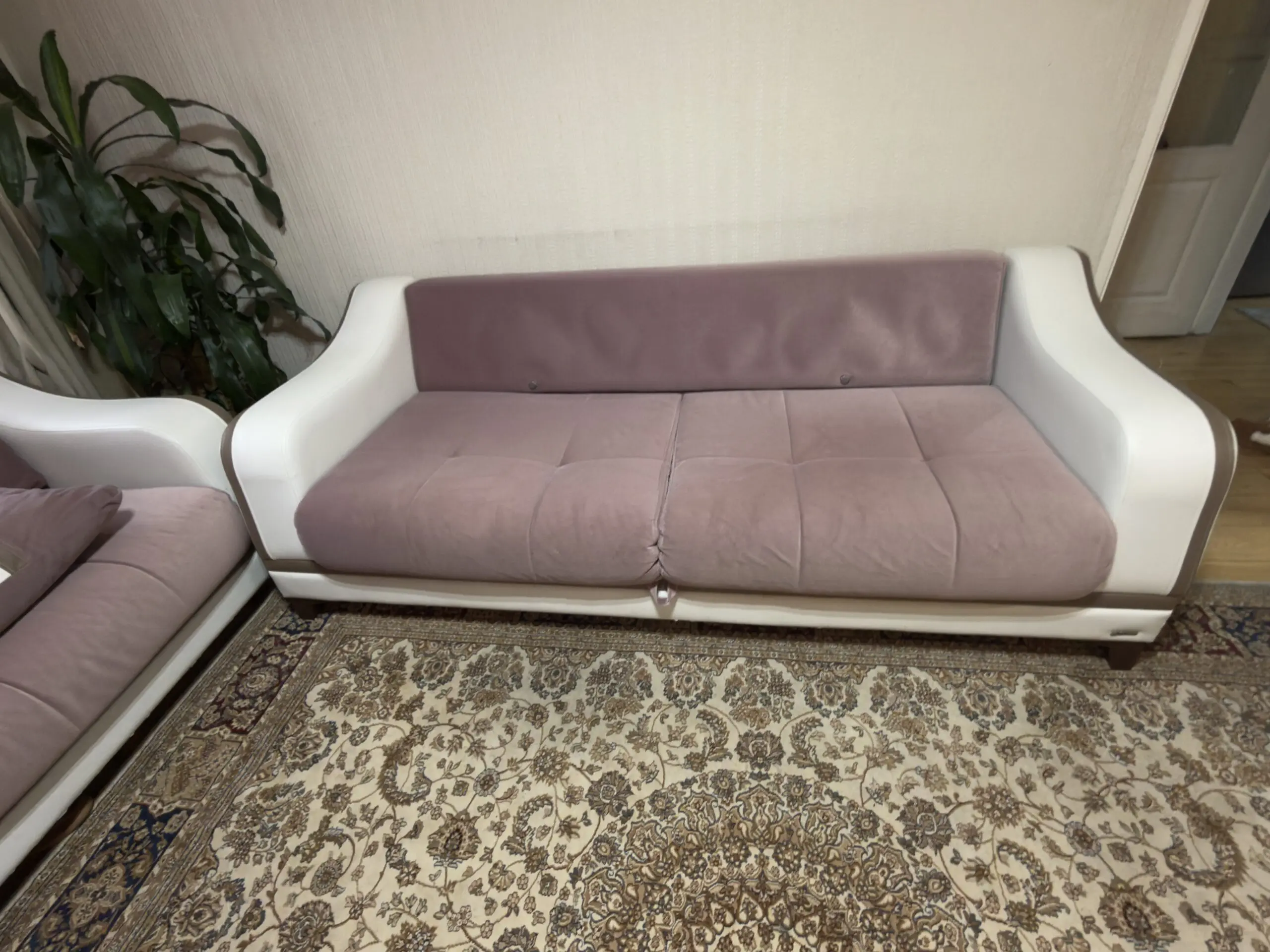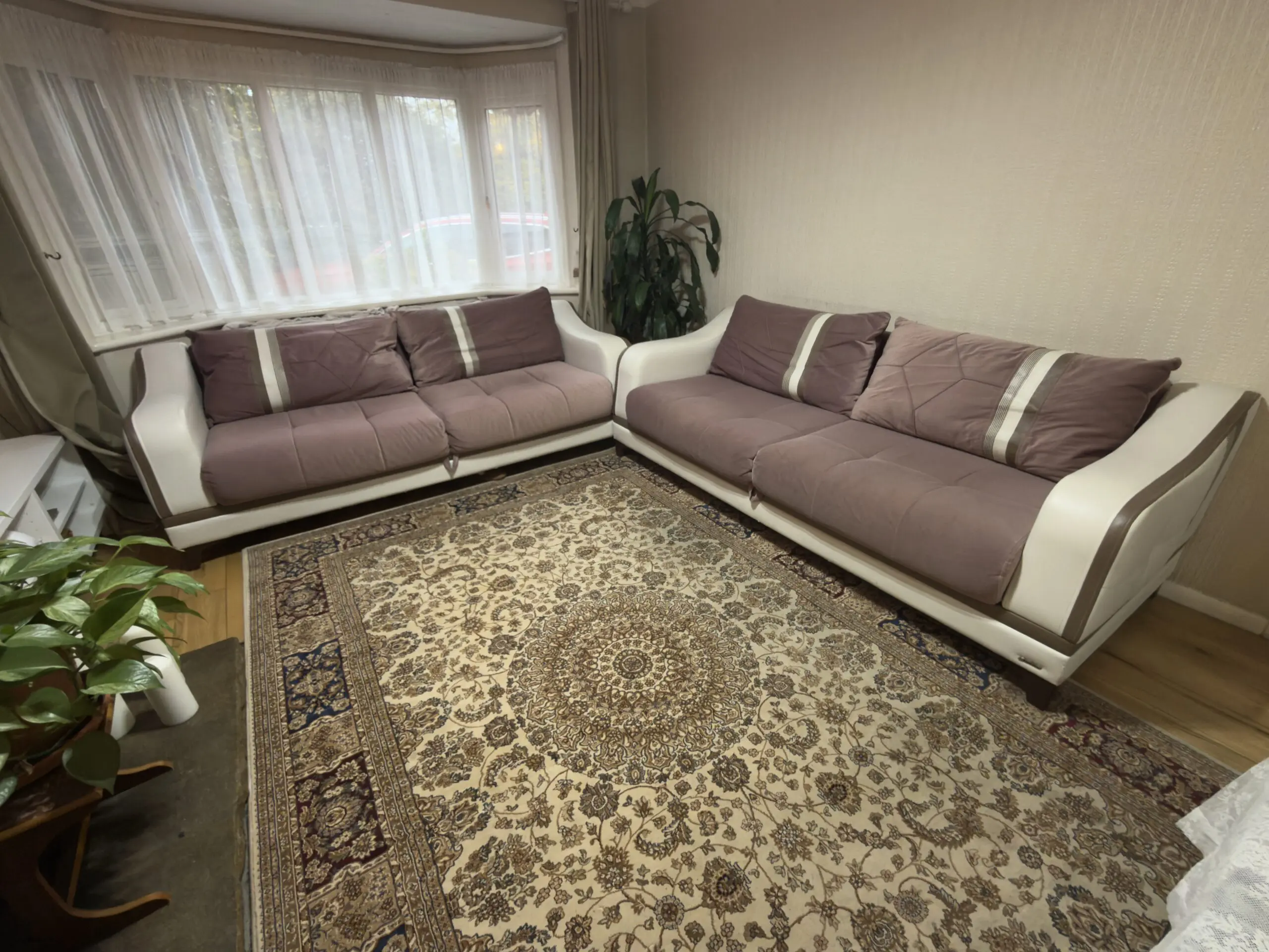 Beautiful and comfortable modern sofa set in dusky mauve (soft plum) fabric with white faux-leather sides and elegant detailing.