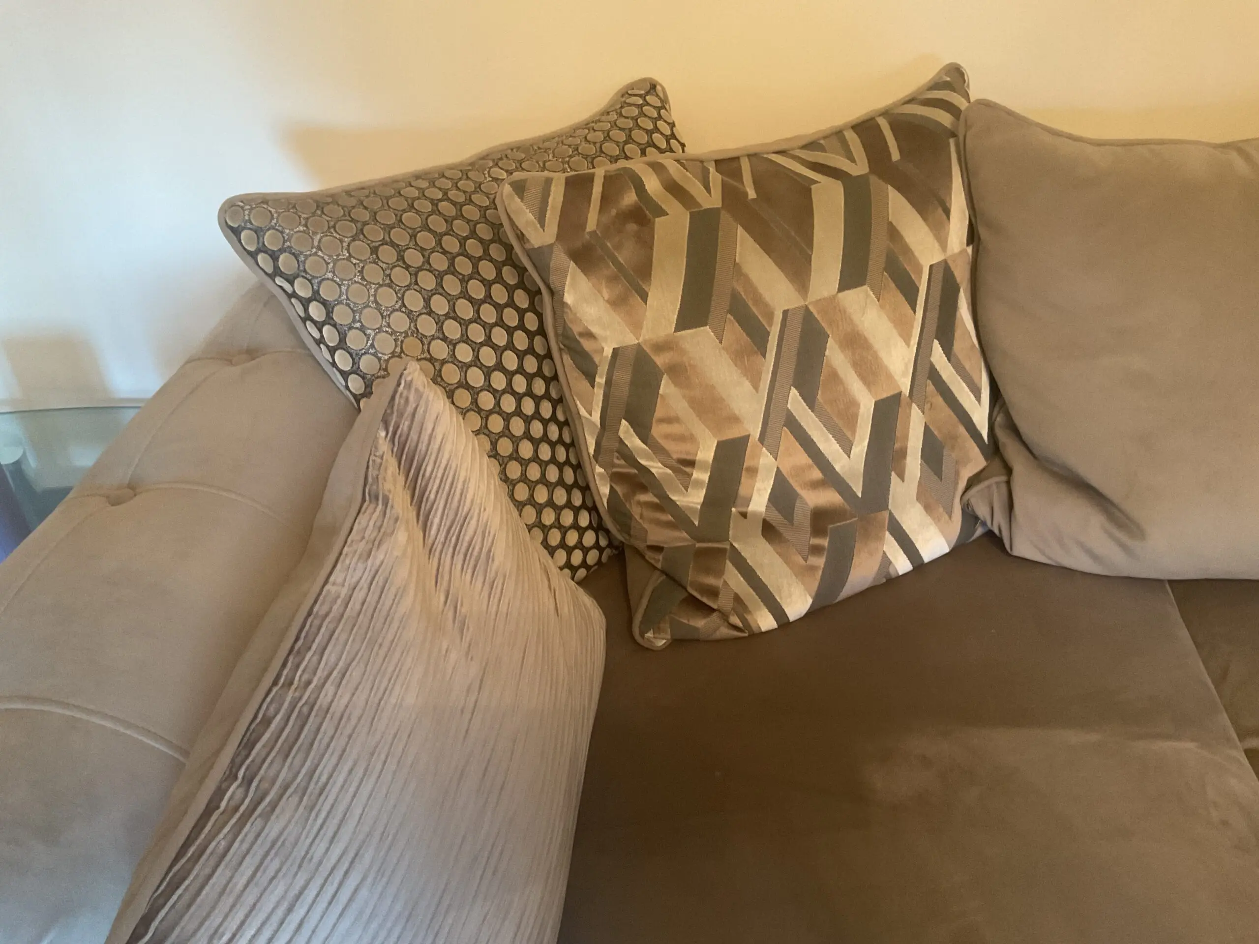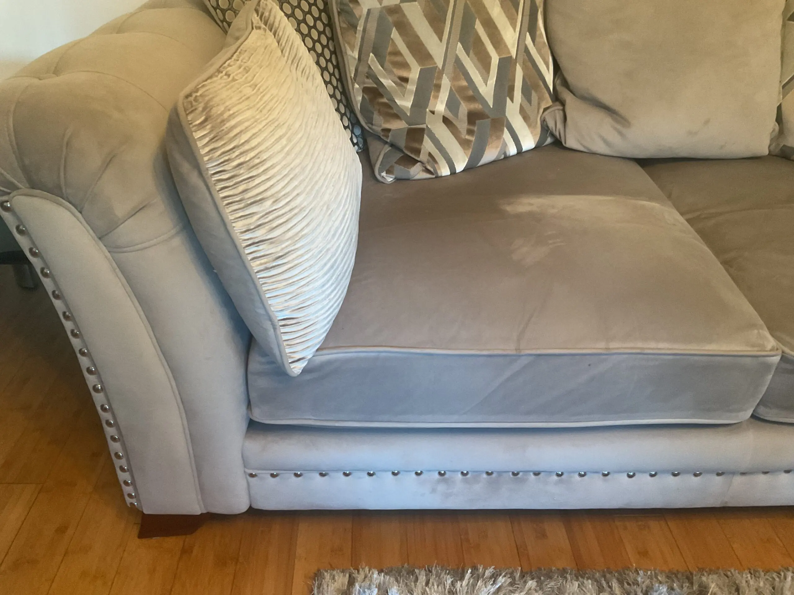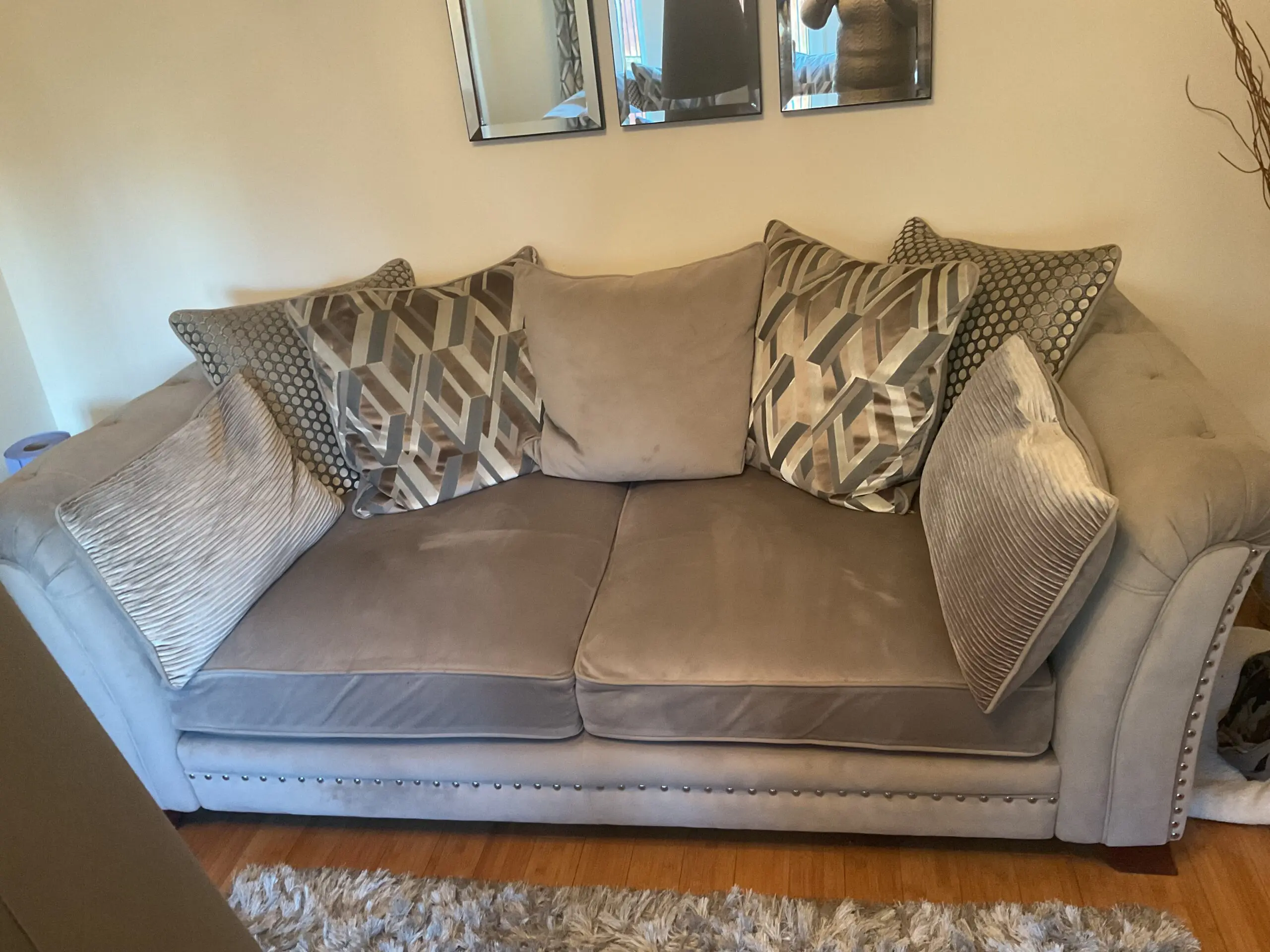 2 x identical sofas. Silver grey velvet with silver stud detail. Scatter cushion design with beige/silver mixture. Great condition and also there is a pair of 66x 90 drop curtains which match the scatter cushions purchased from next which I can include.