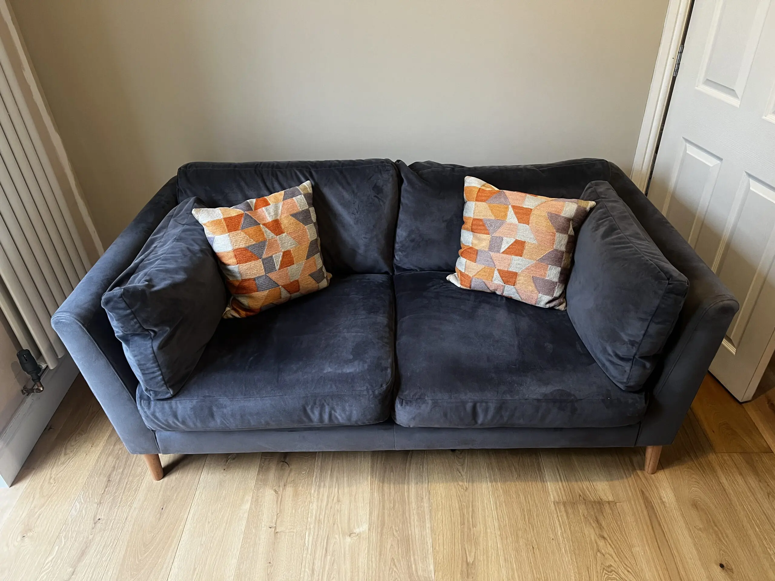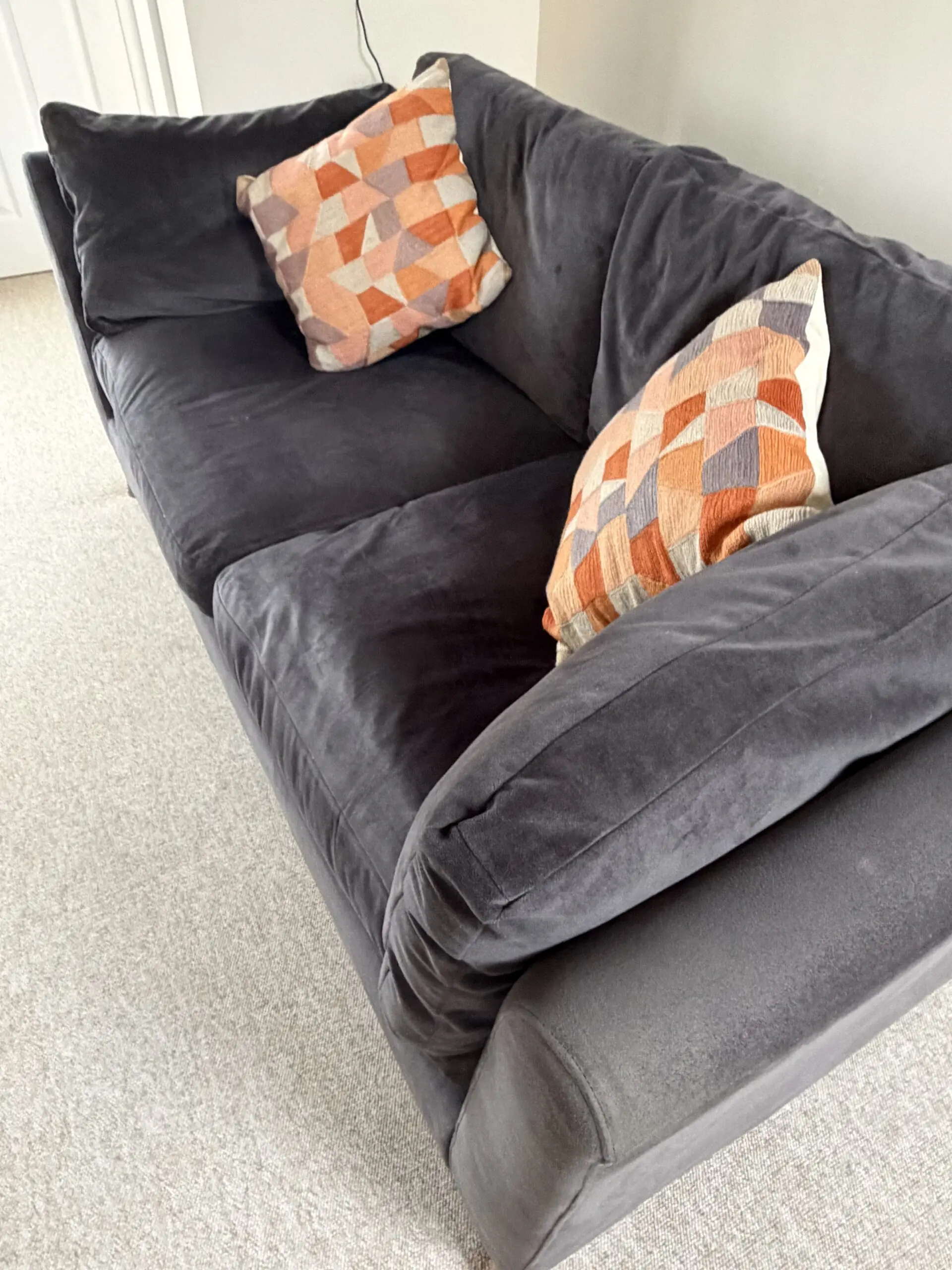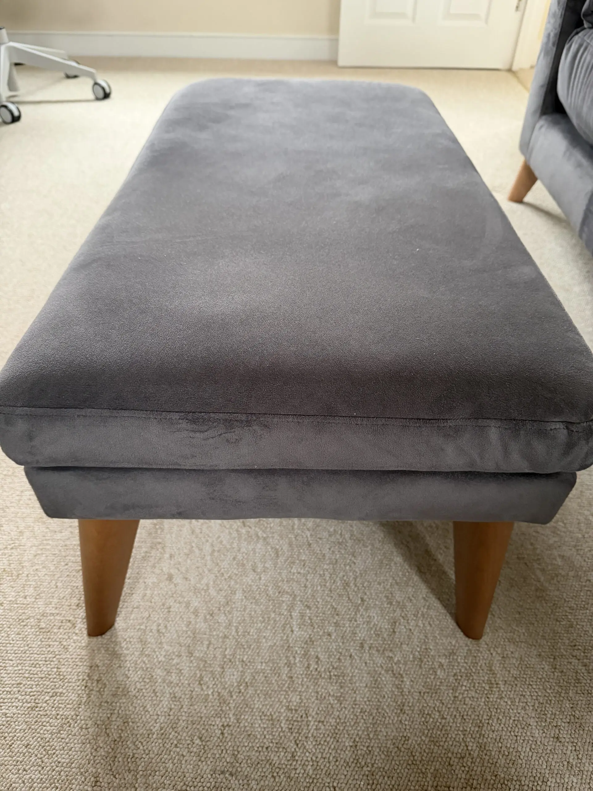 Grey velvet 3 seater sofa and matching footstool. Mixture of feather and fibre. Very soft and comfortable. Stain resistant fabric so very durable.