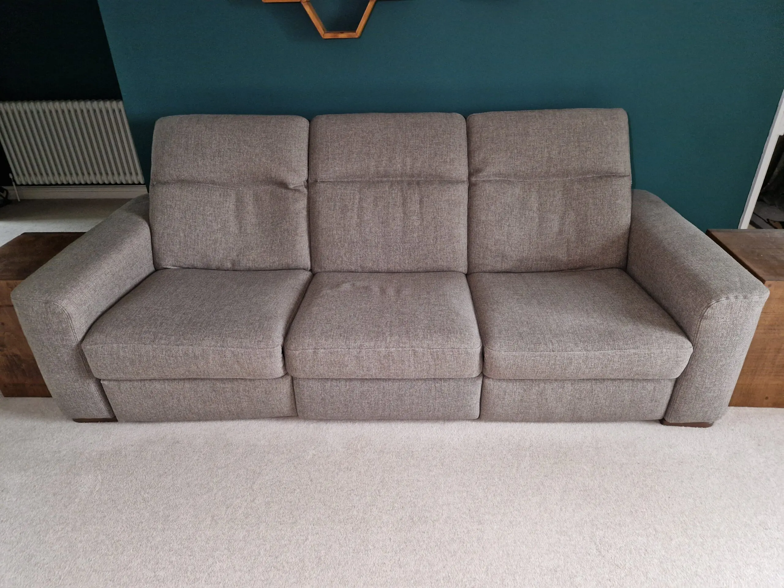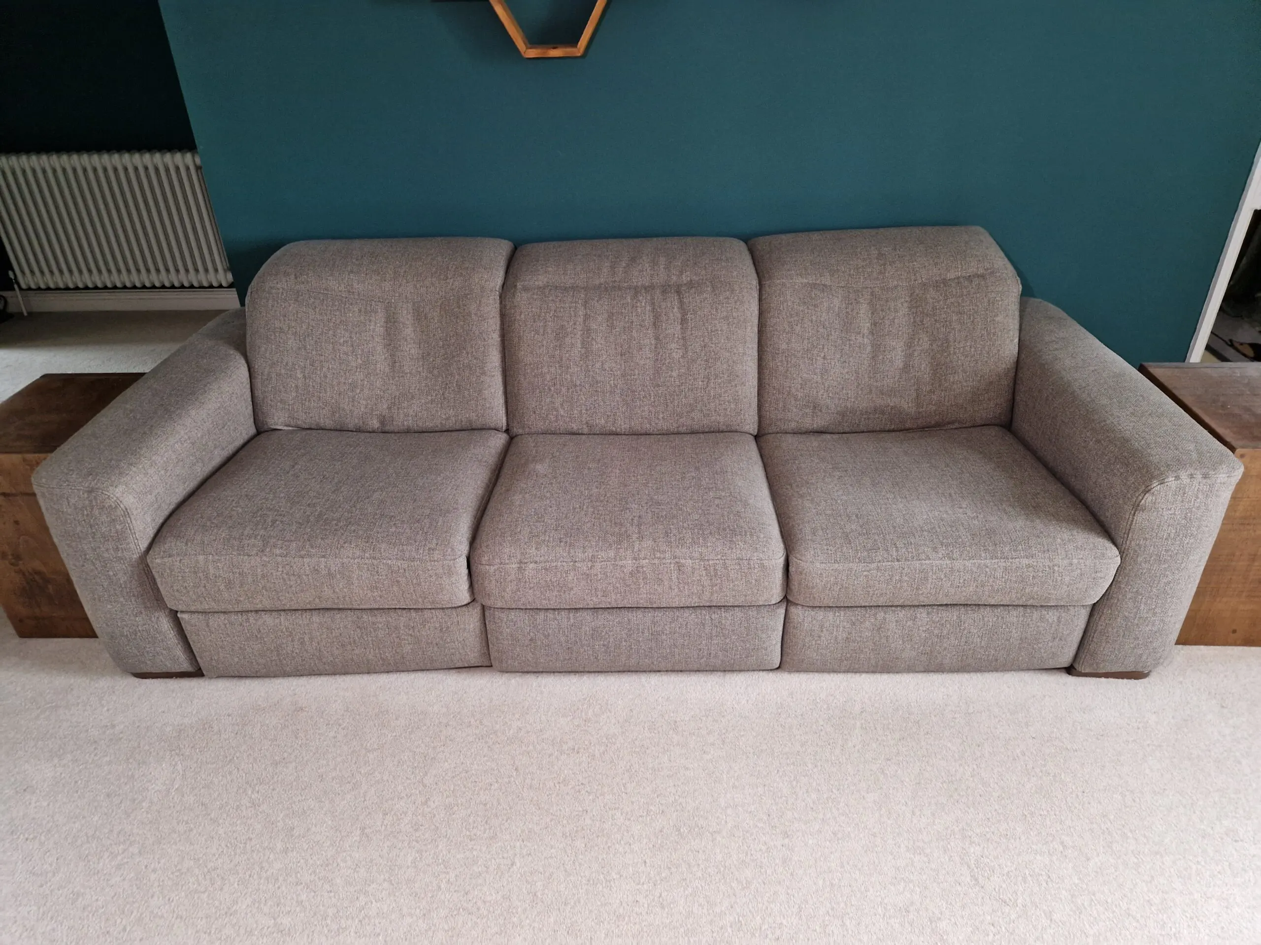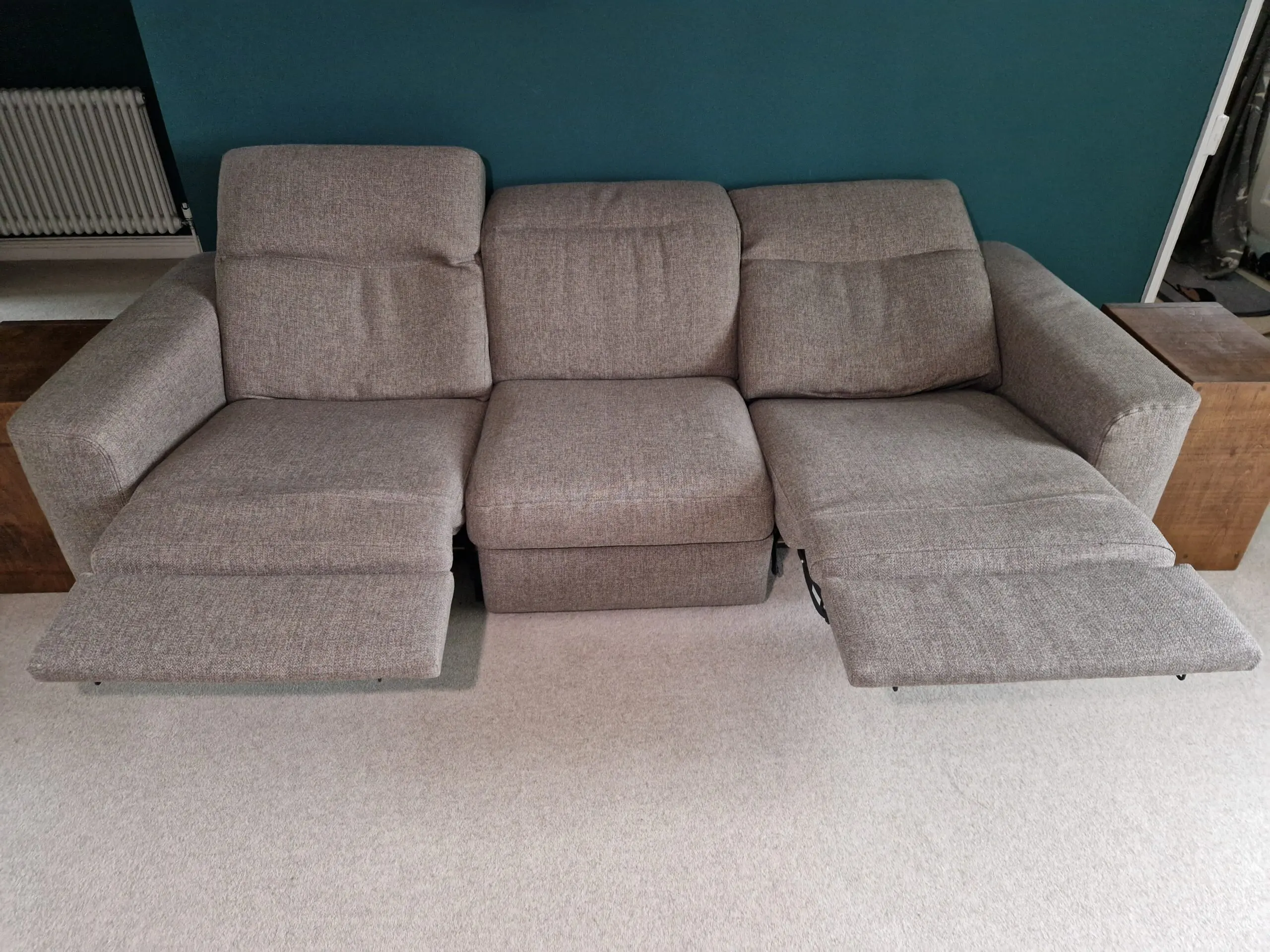 Natuzzi Italian 3 seat sofa and arm chair with adjustable headrest and 2 motorised reclining seats. In light grey/brown fabric.