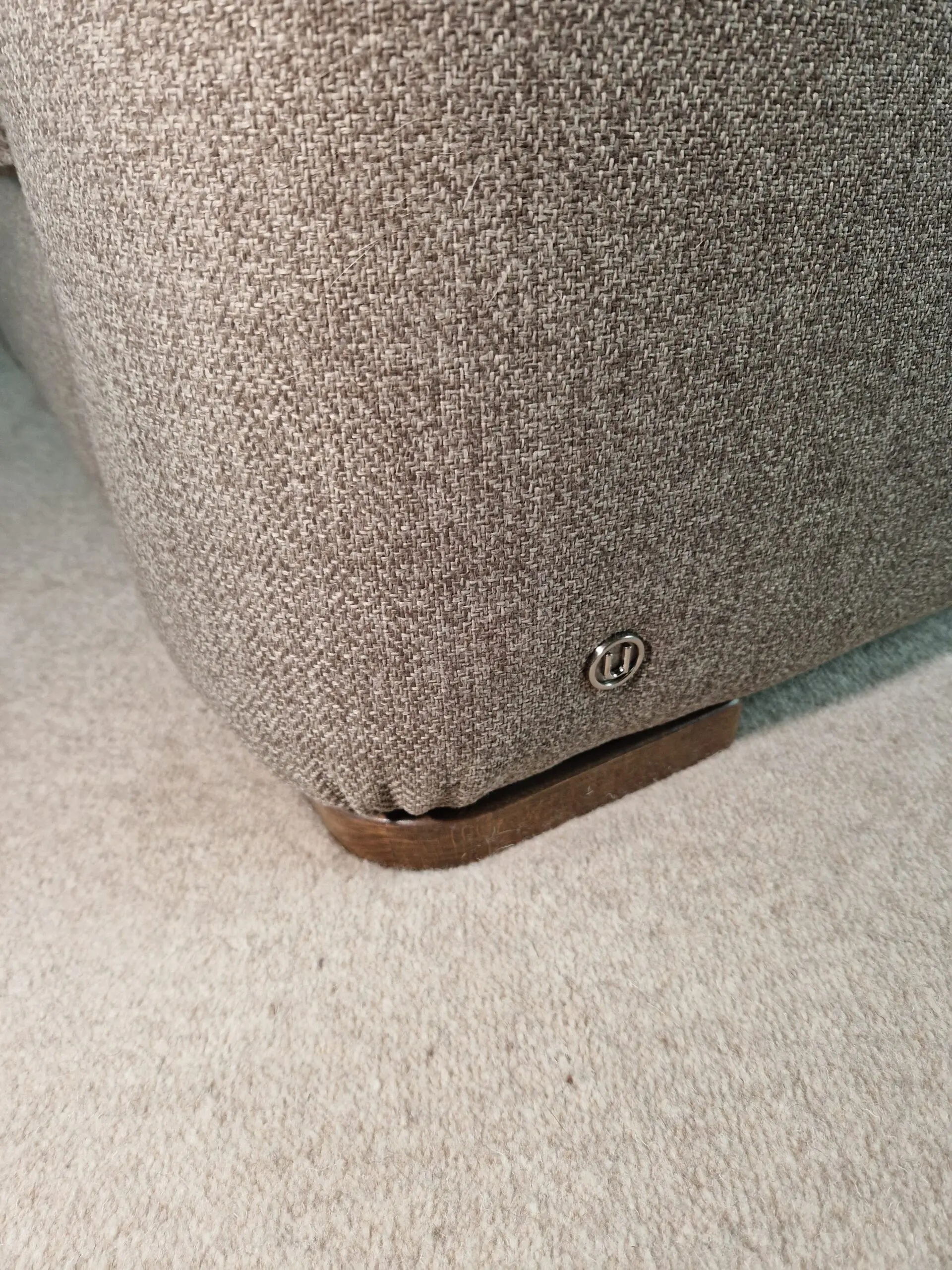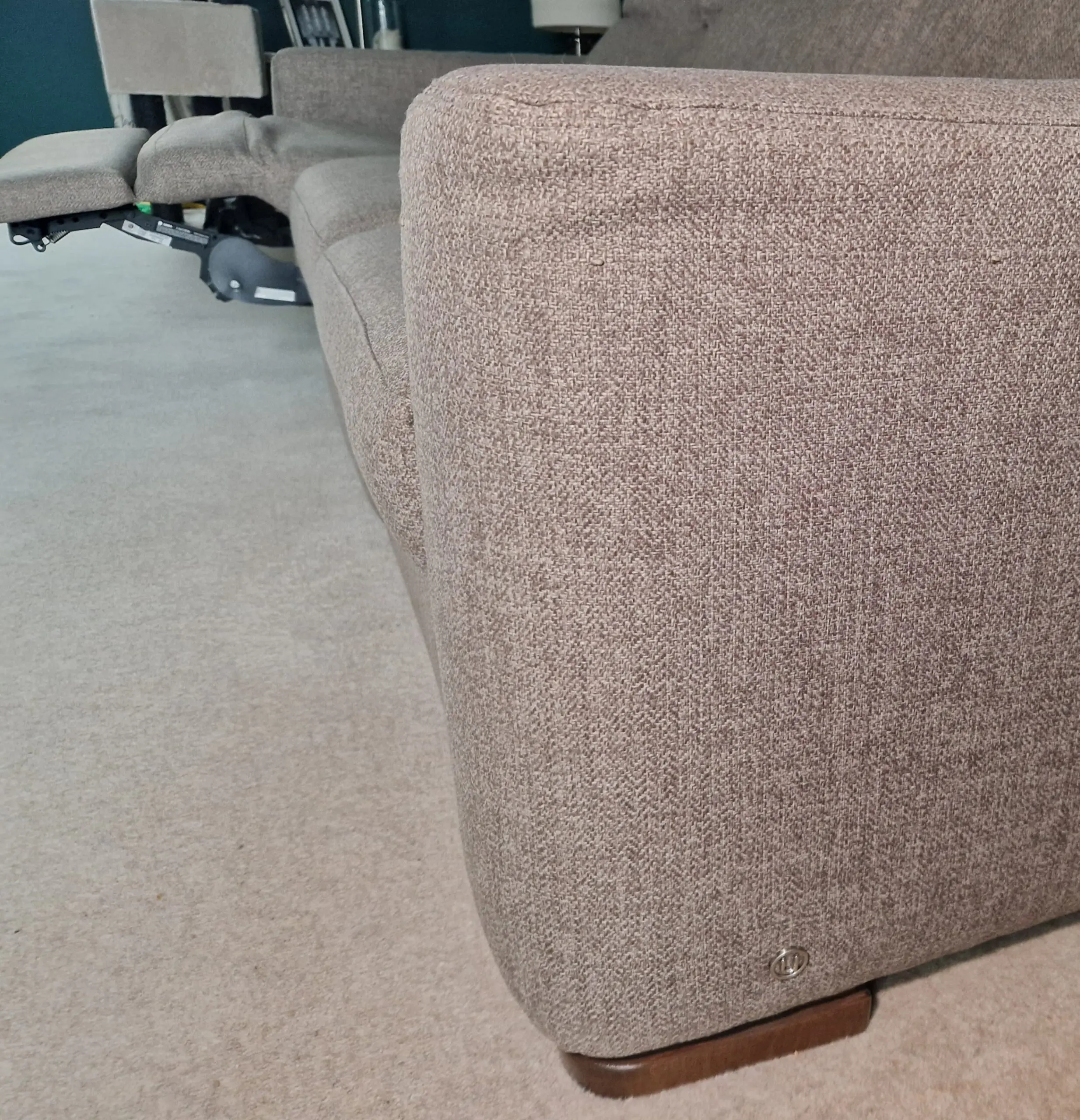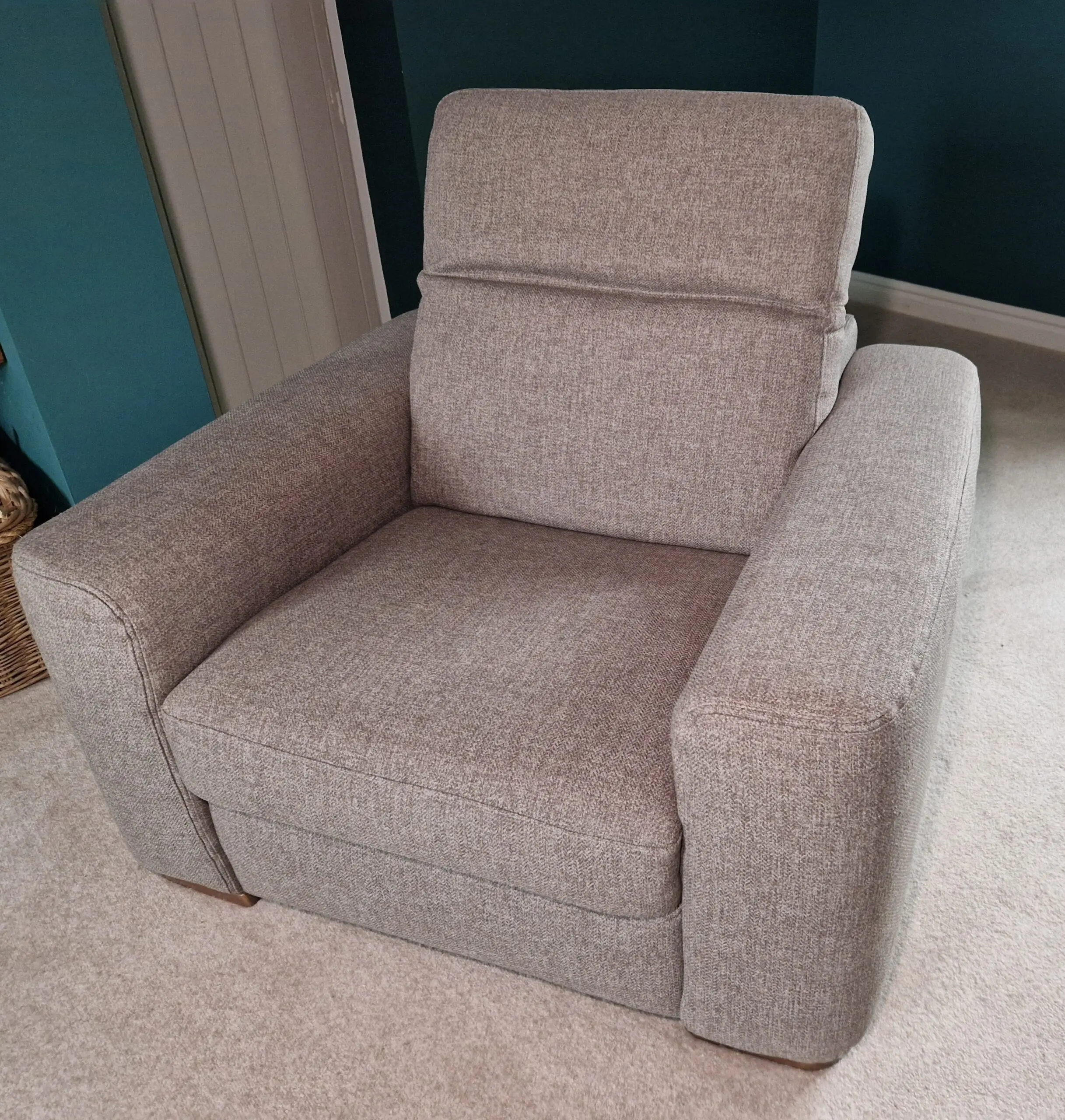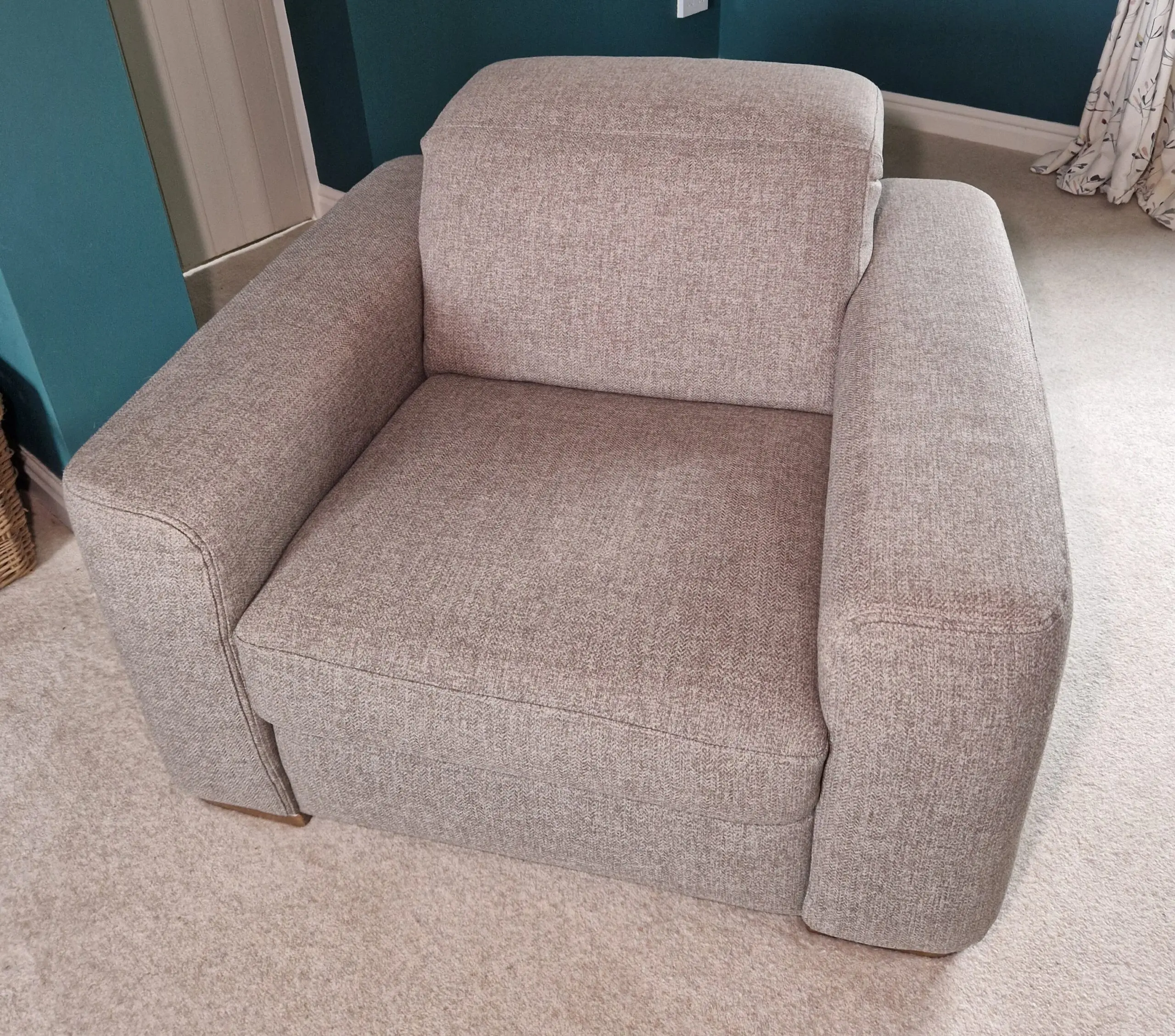 Natuzzi Italian 3 seat sofa and arm chair with adjustable headrest and 2 motorised reclining seats. In light grey/brown fabric.