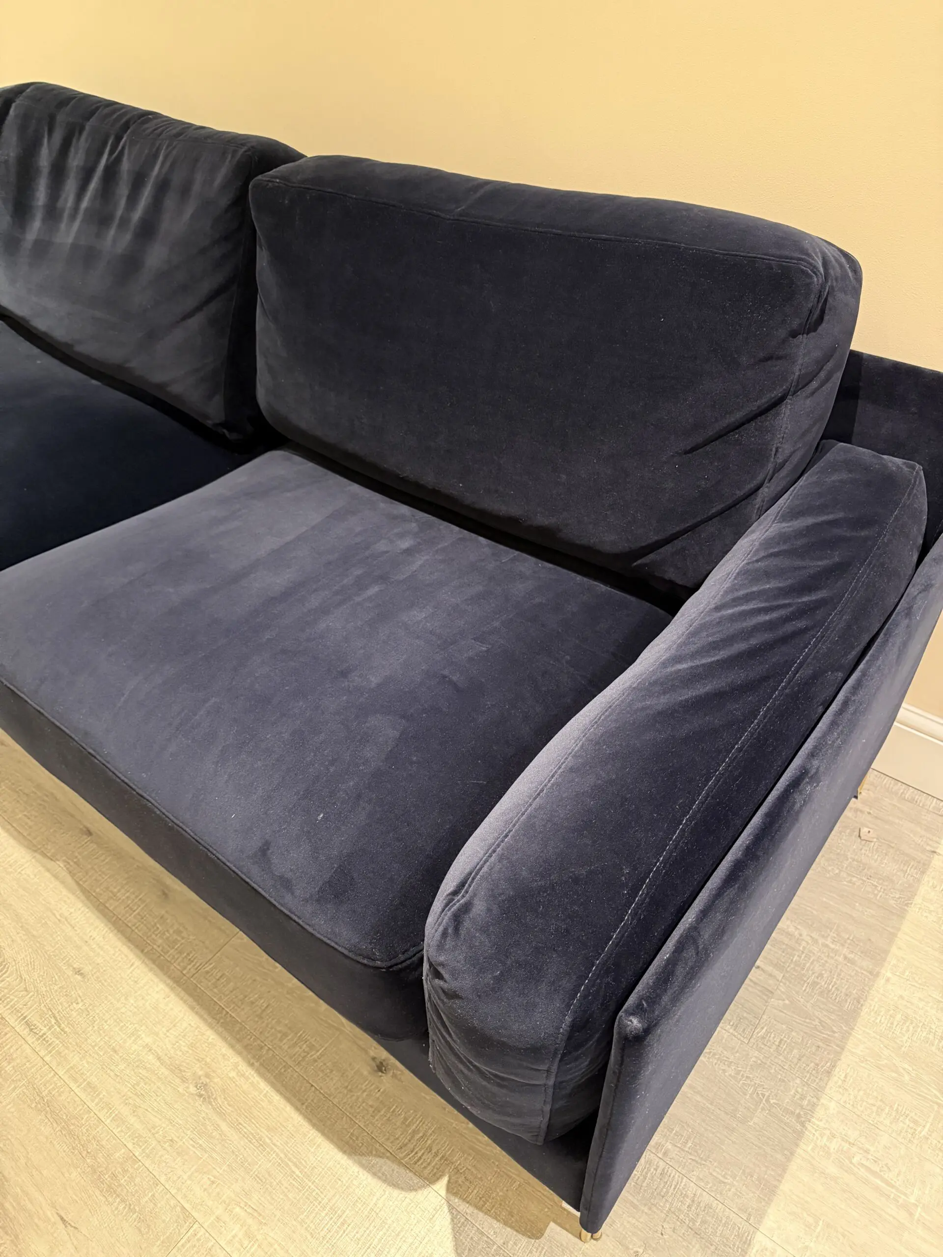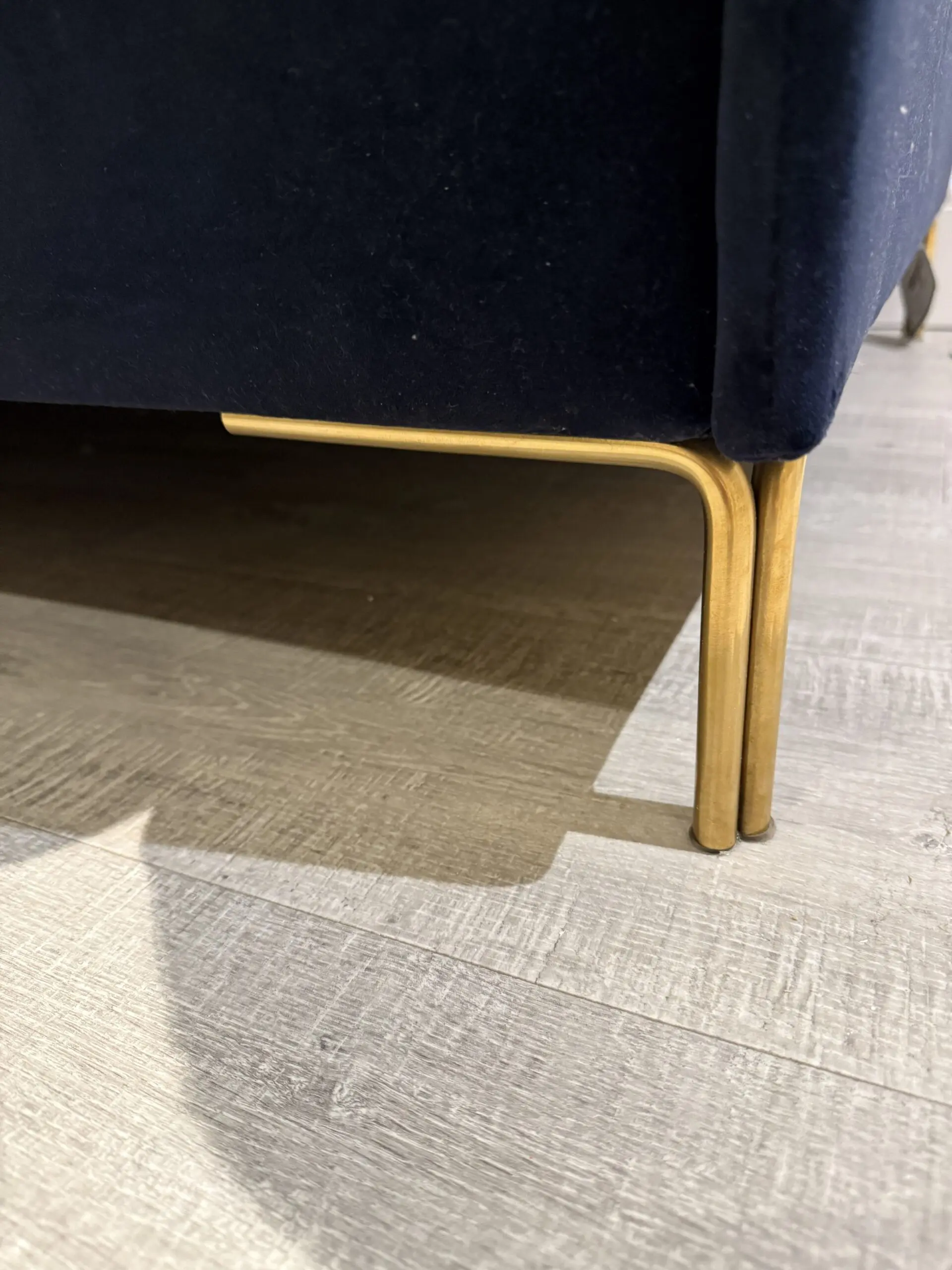 This navy blue fabric sofa with gold legs is a stylish and comfortable piece of furniture that can seat 3 adults. The contemporary/modern design features a wooden frame with pad arms, upholstered in plush velvet fabric. With a height of 90 cm and a length of 210 cm, this sofa is perfect for creating a cosy and inviting living space. The bold blue colour and elegant gold legs add a touch of sophistication to any room.