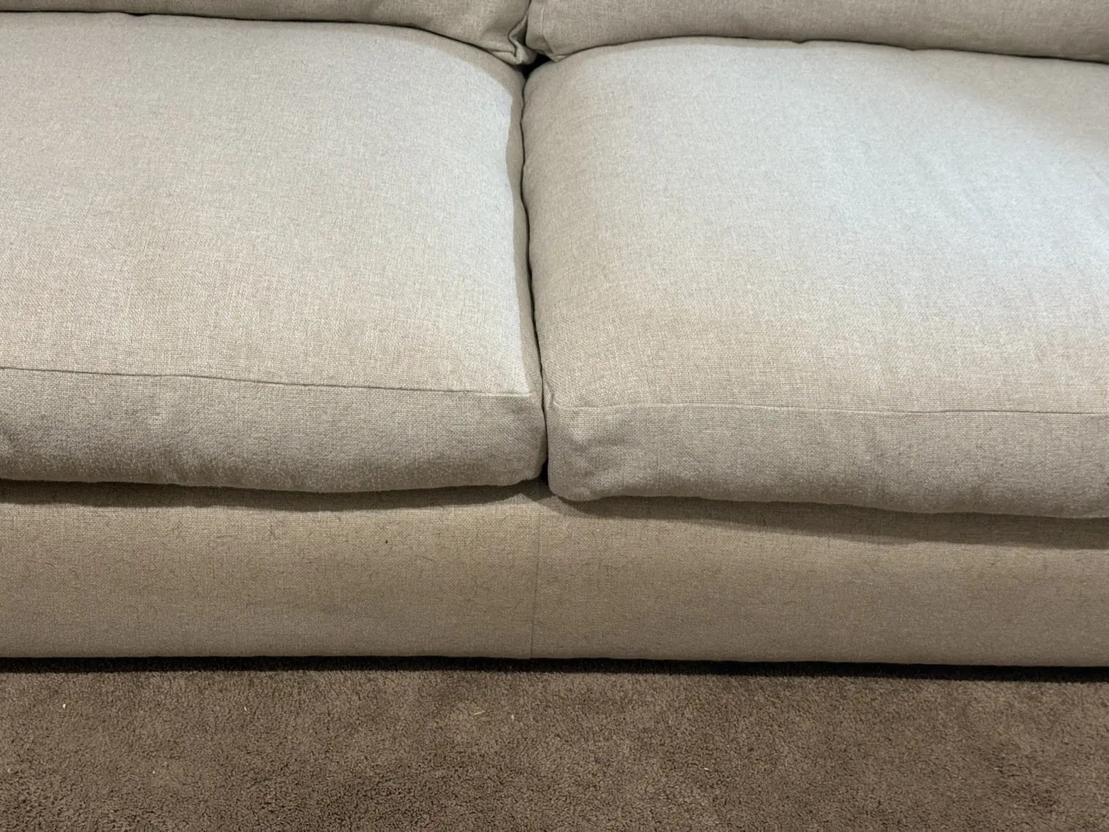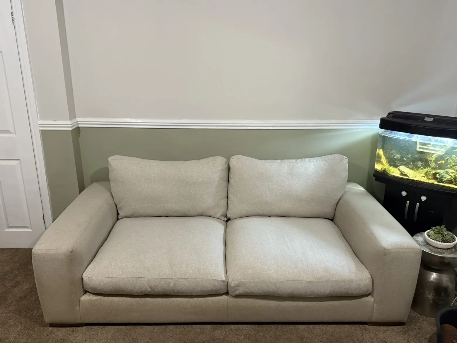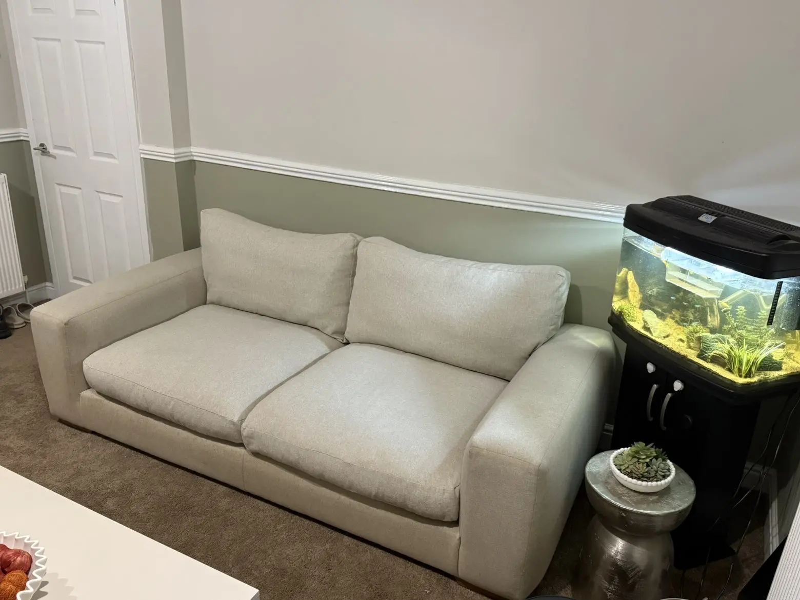 Had a year, from a home with pets, smoke free home. Only selling as getting bigger sofa. Some wear marks. Easy to clean up. Reflected in price