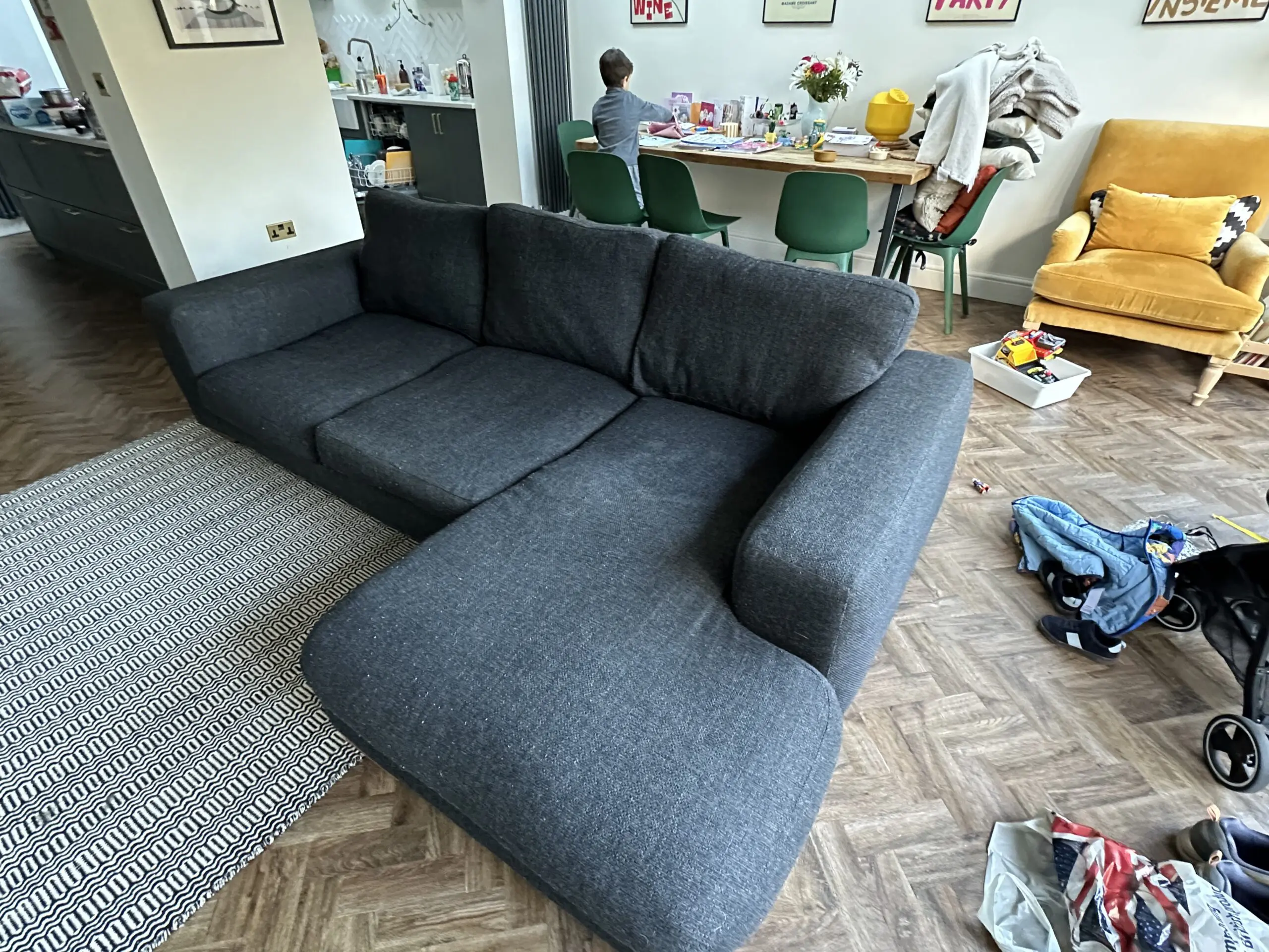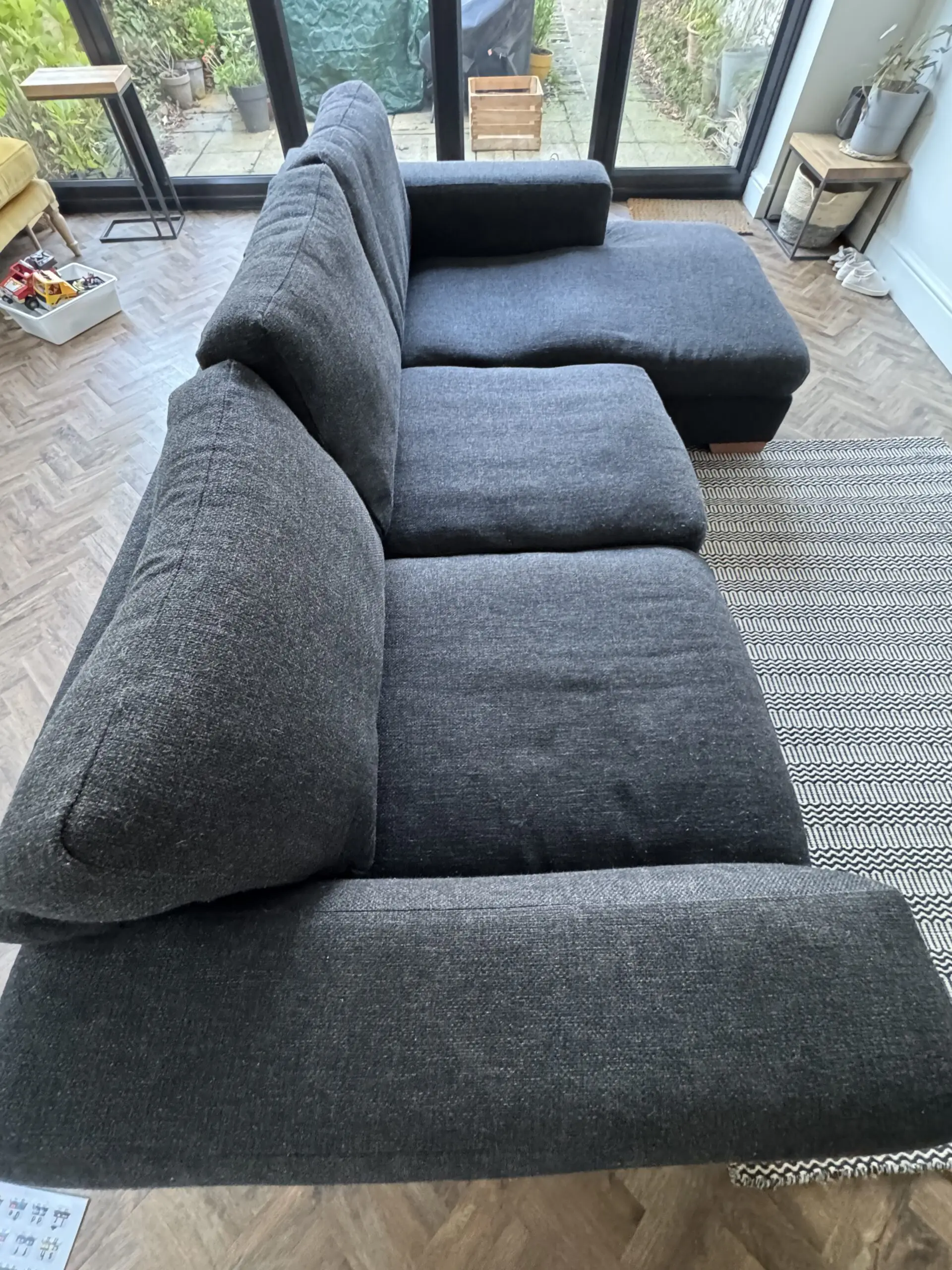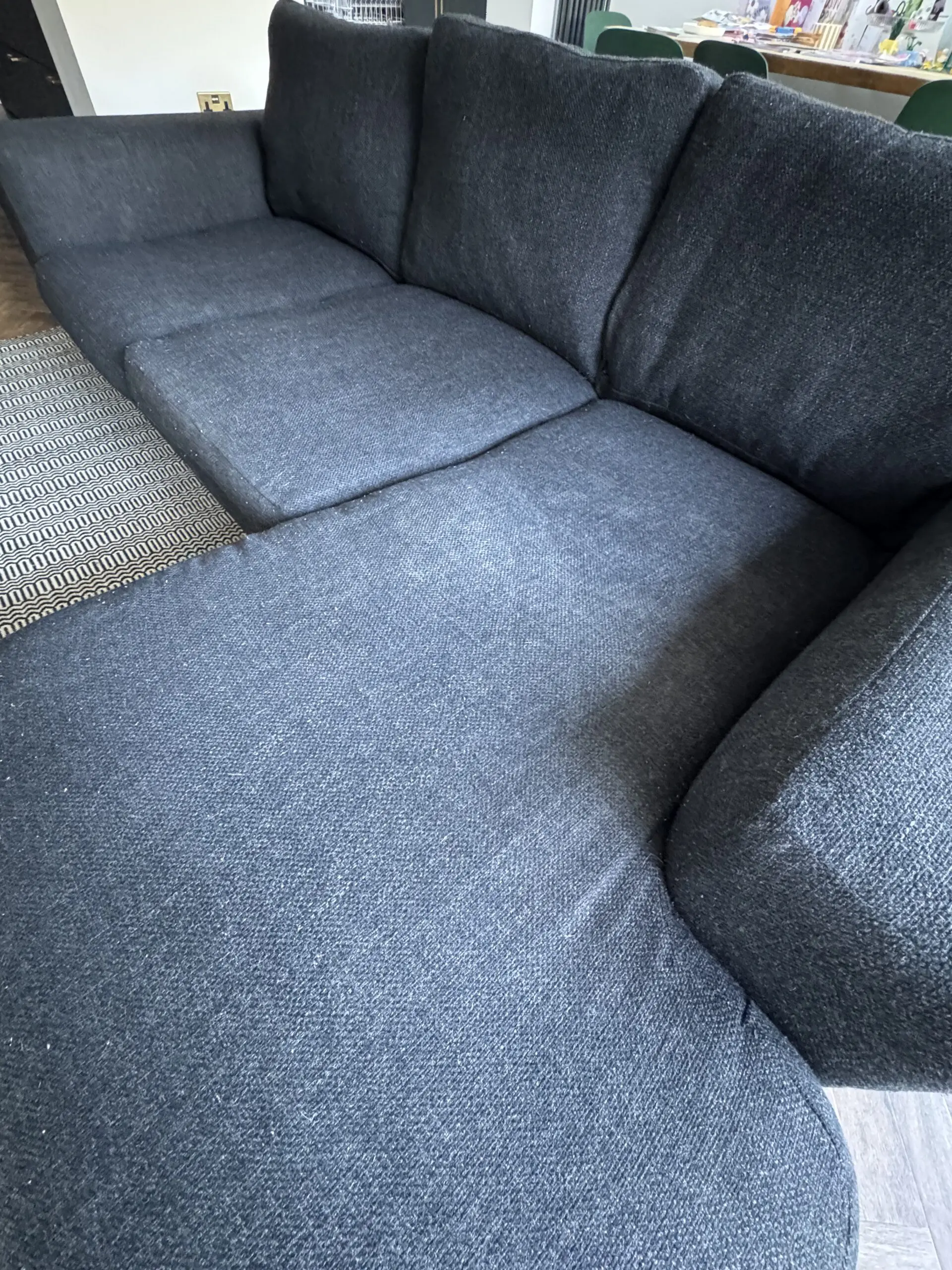 Next Houghton Black Left Hand Chaise 3 Seater Sofa. Dint in the chaise cushion but otherwise in good condition.
