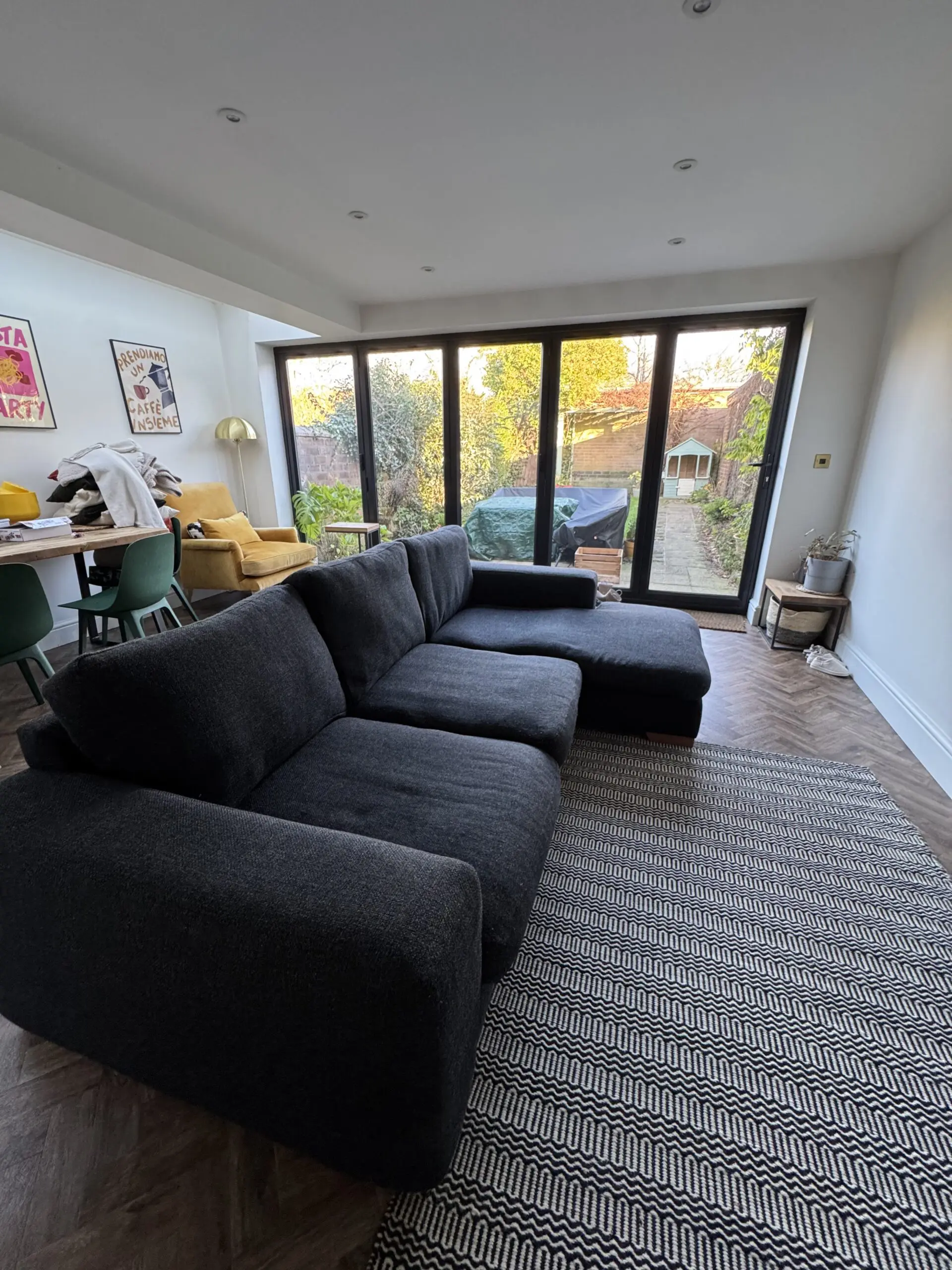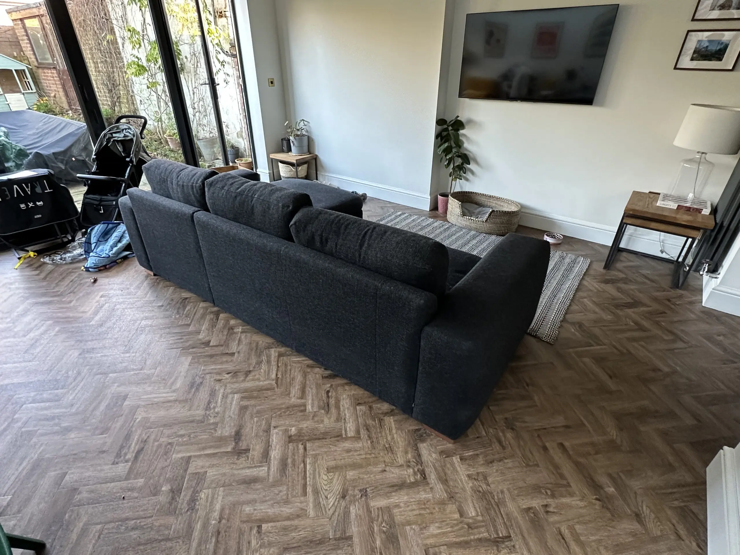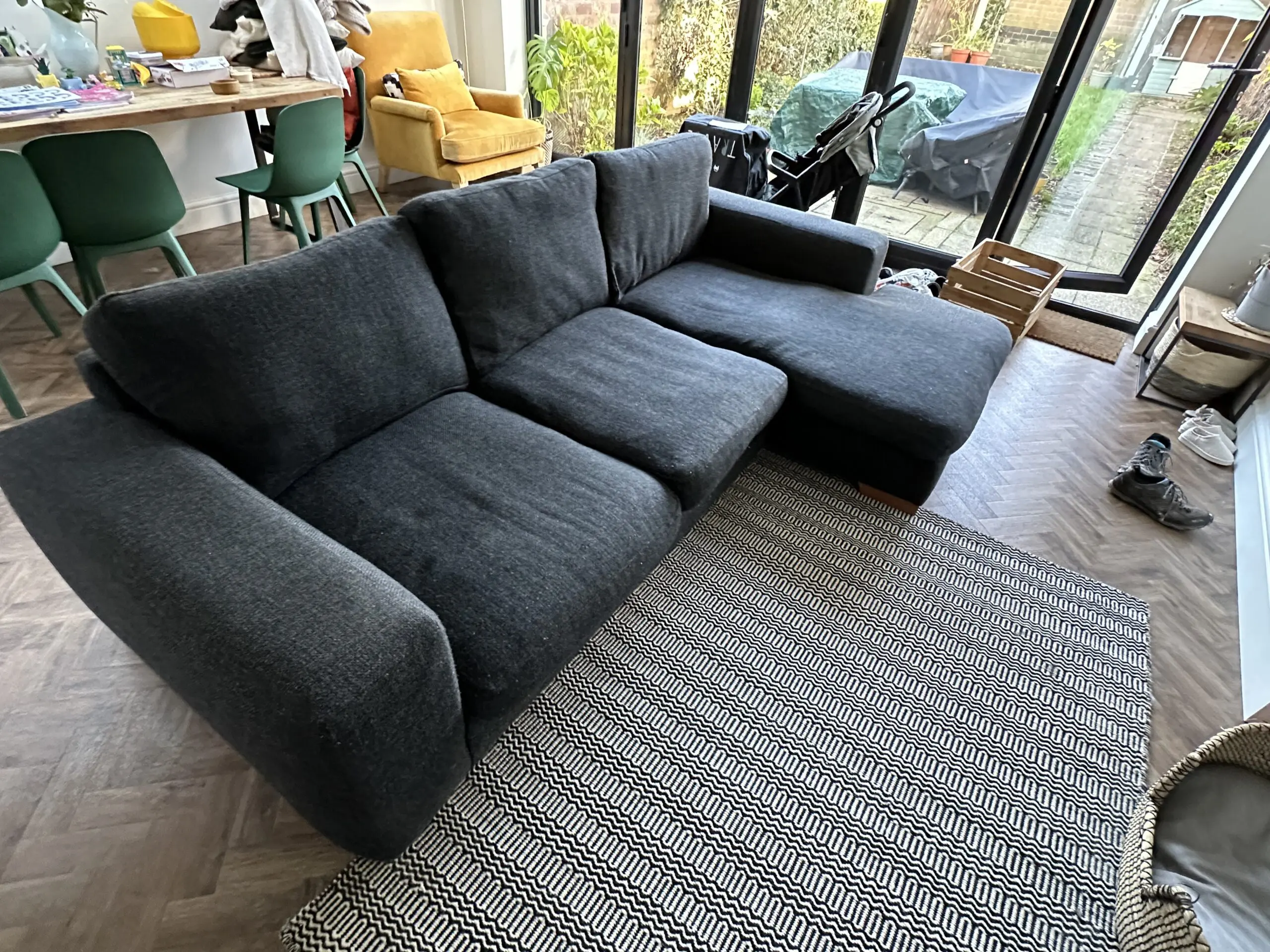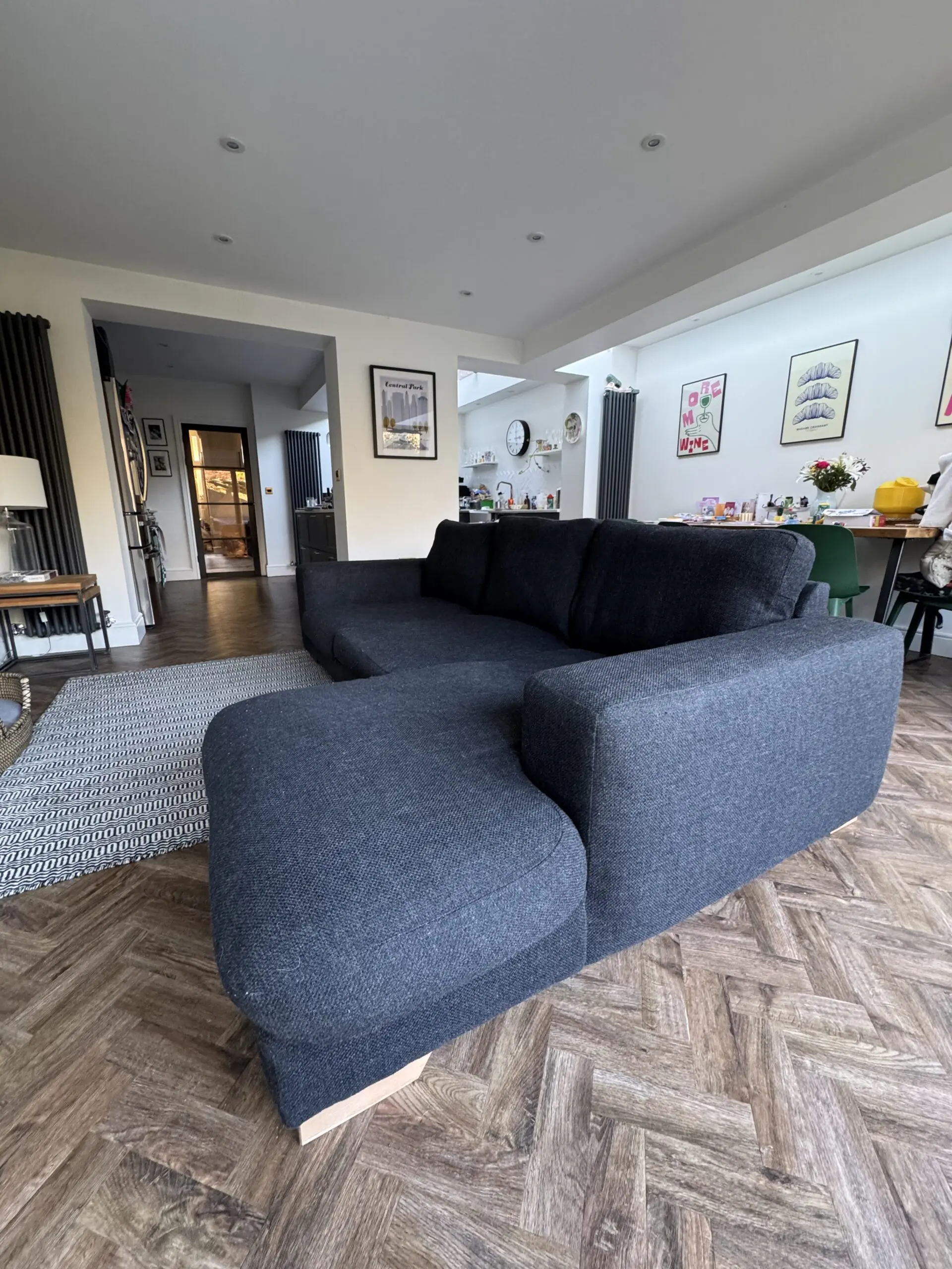 Next Houghton Black Left Hand Chaise 3 Seater Sofa. Dint in the chaise cushion but otherwise in good condition.