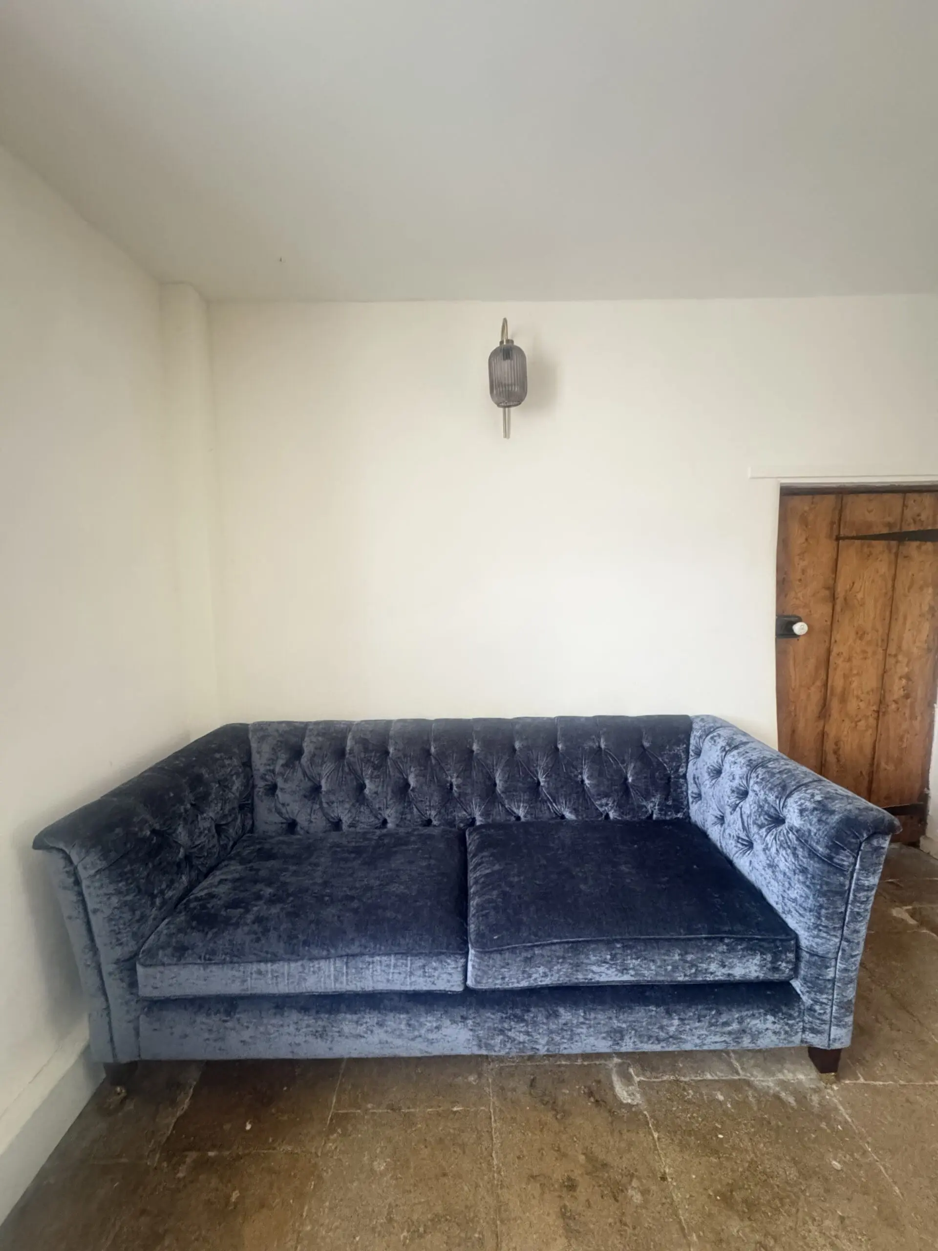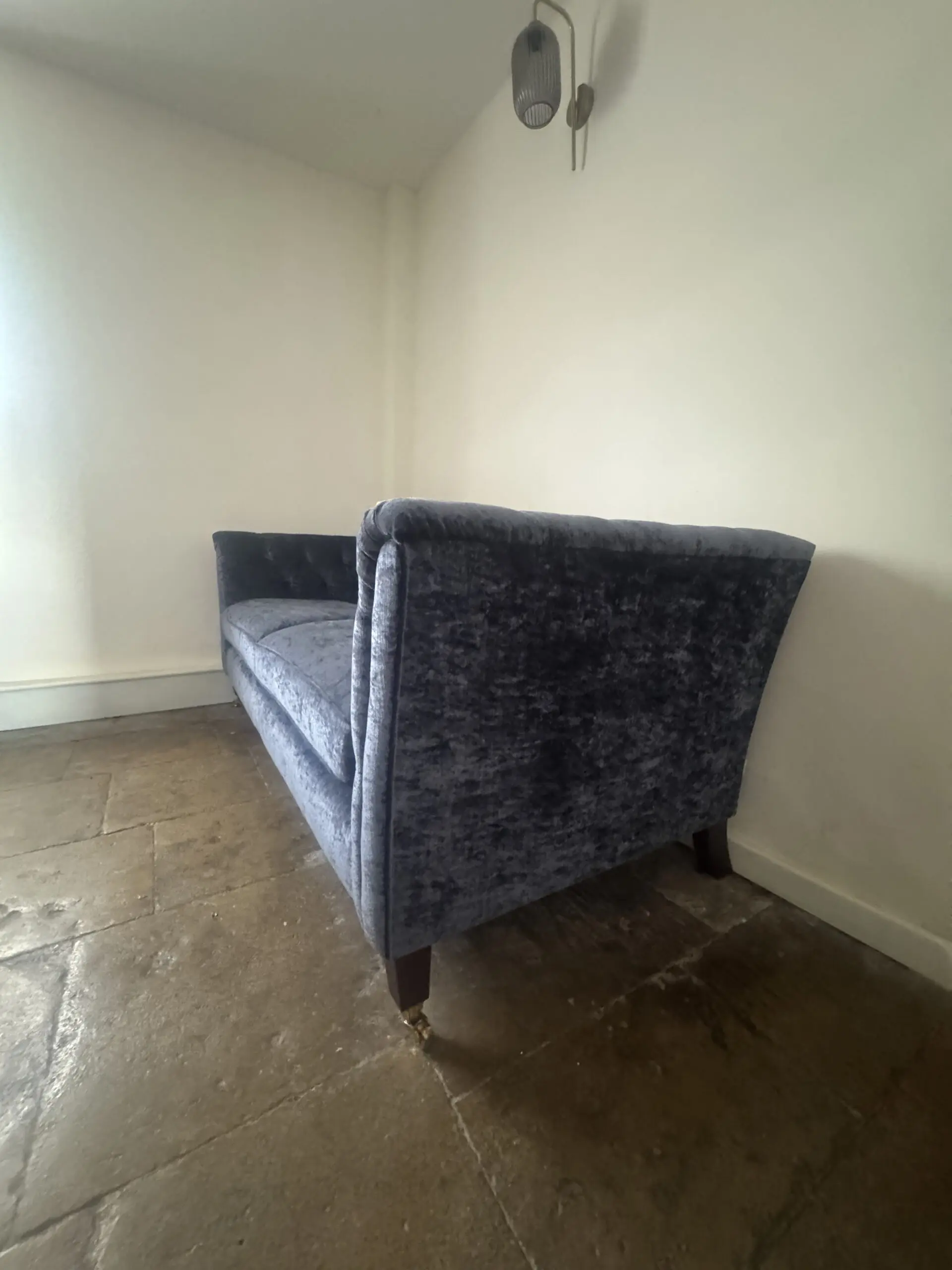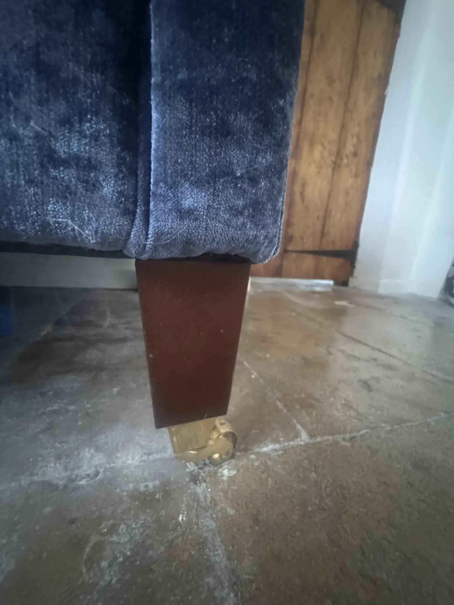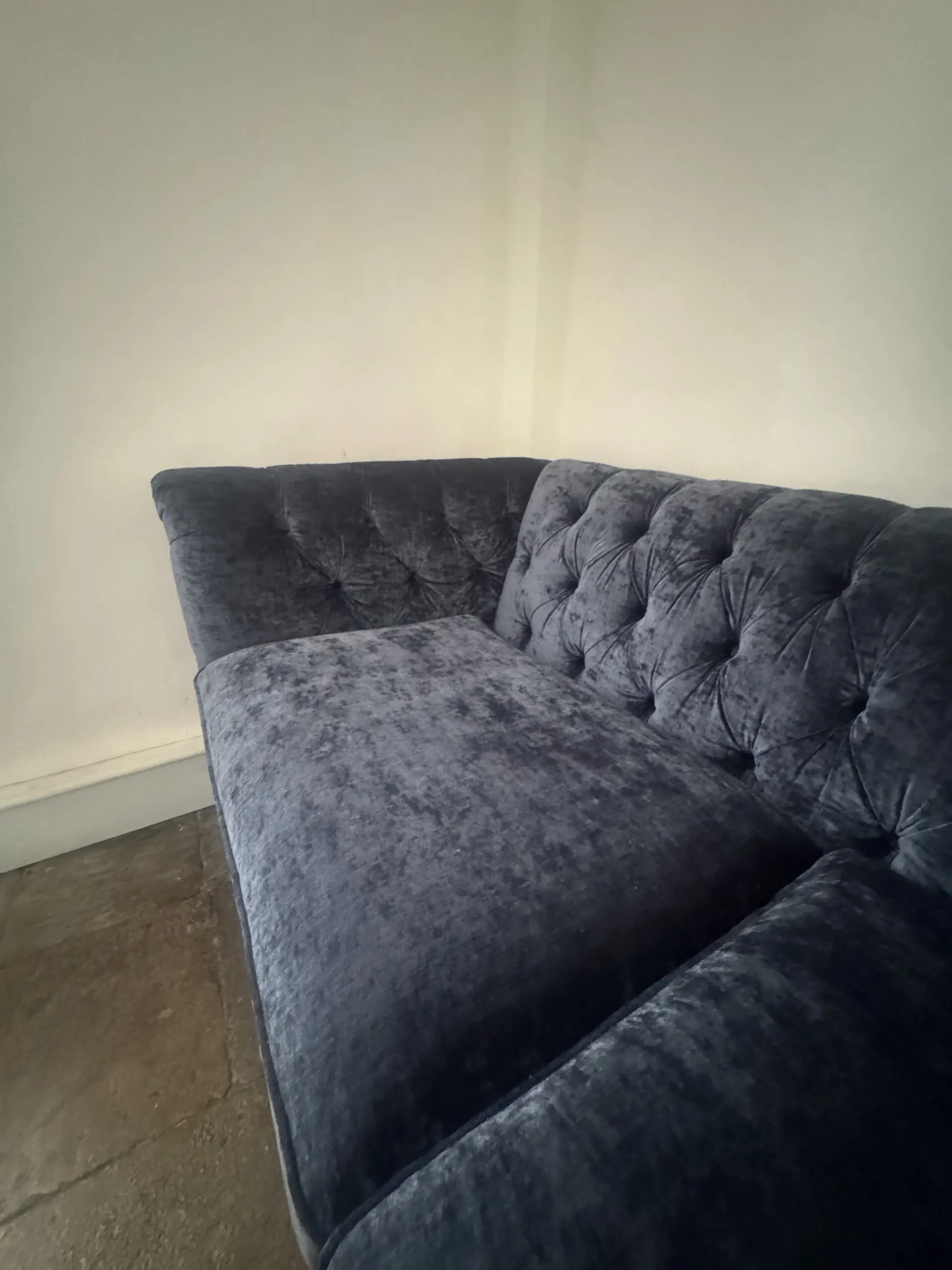 Three seater sofa from Laura Ashley at Next. Middnight Blue/Navy crushed velvet with stud detail. Front legs on brass rollers and dark wood legs at the rear. Detachable sofa cushions.