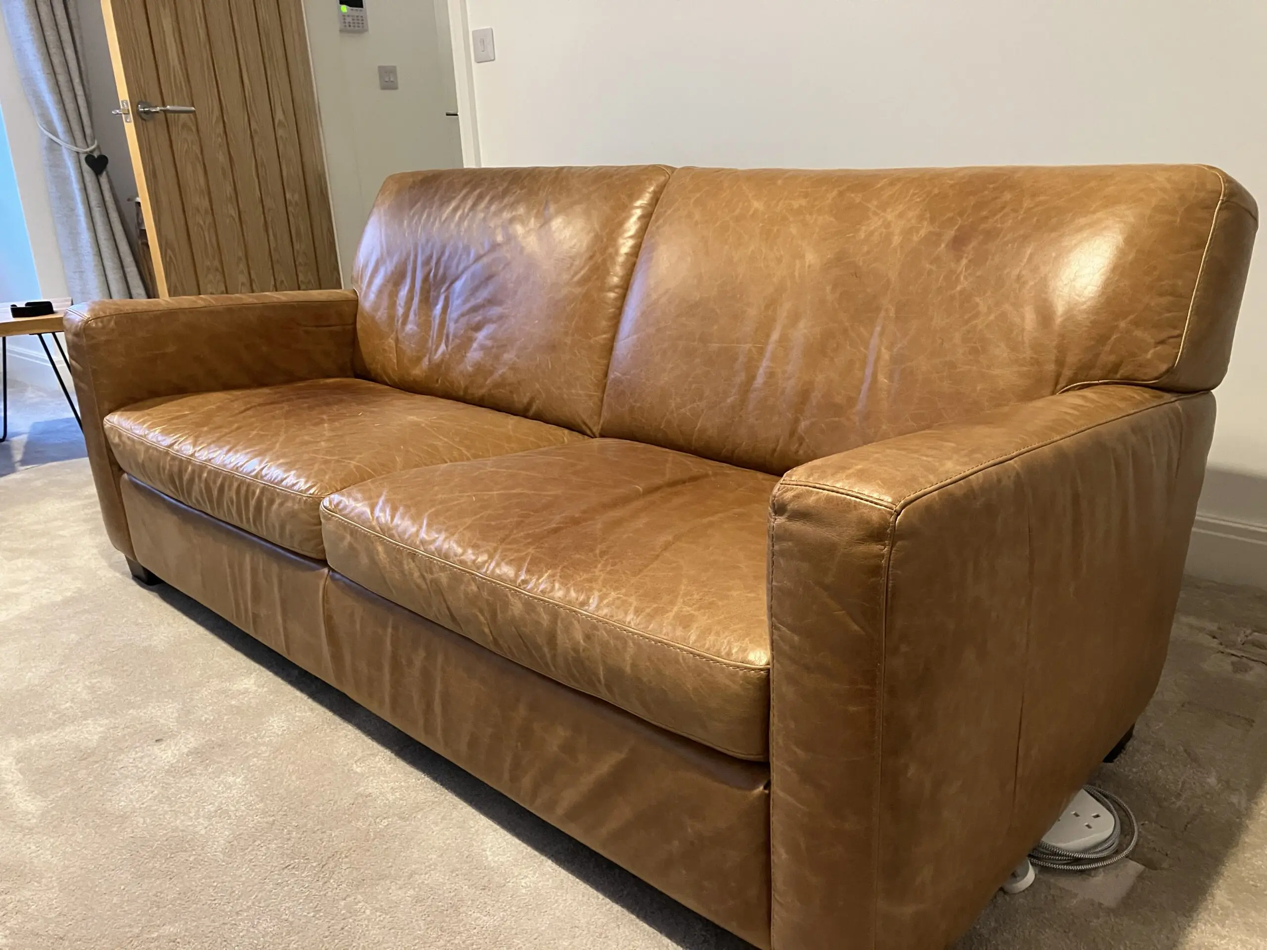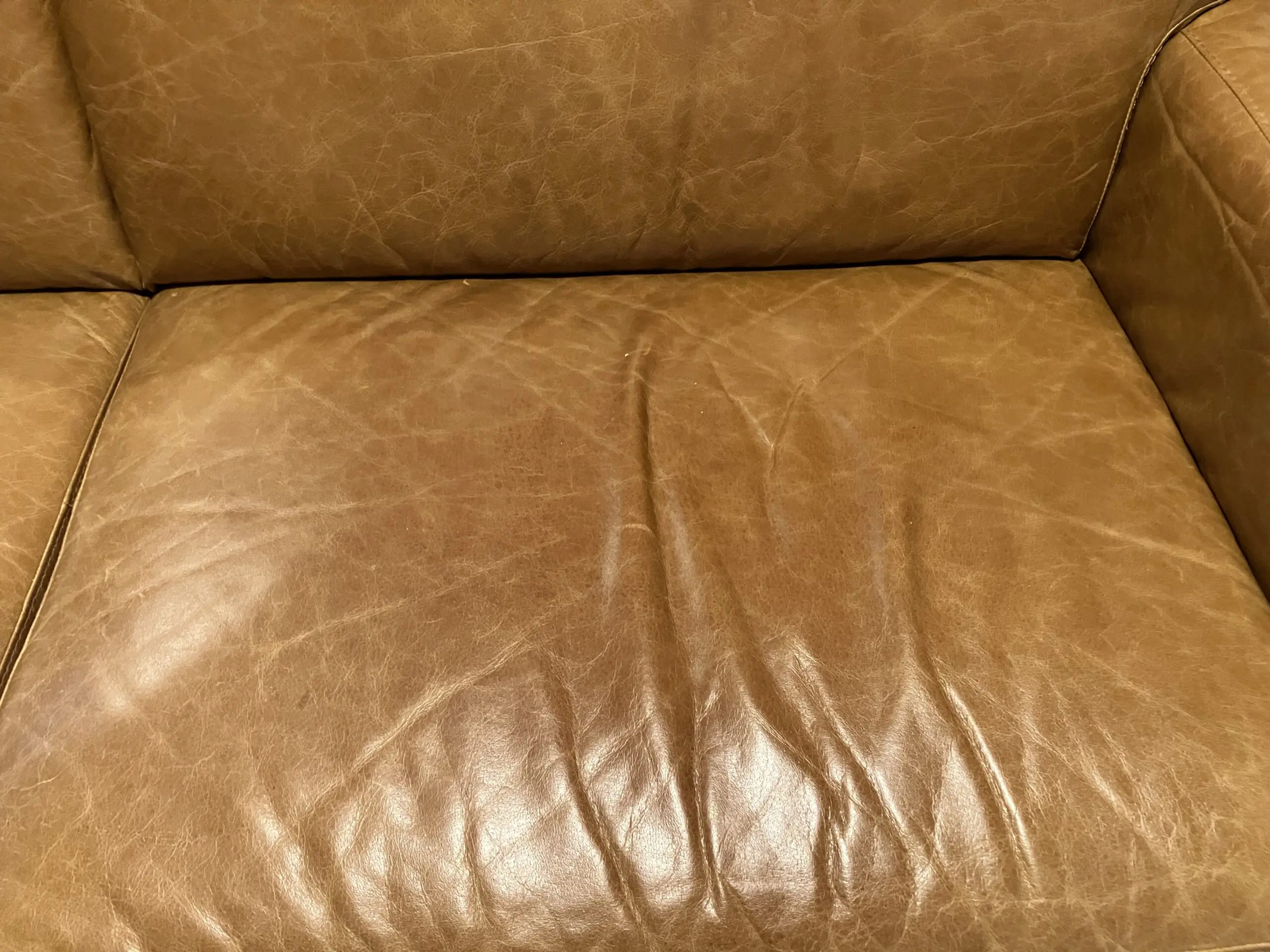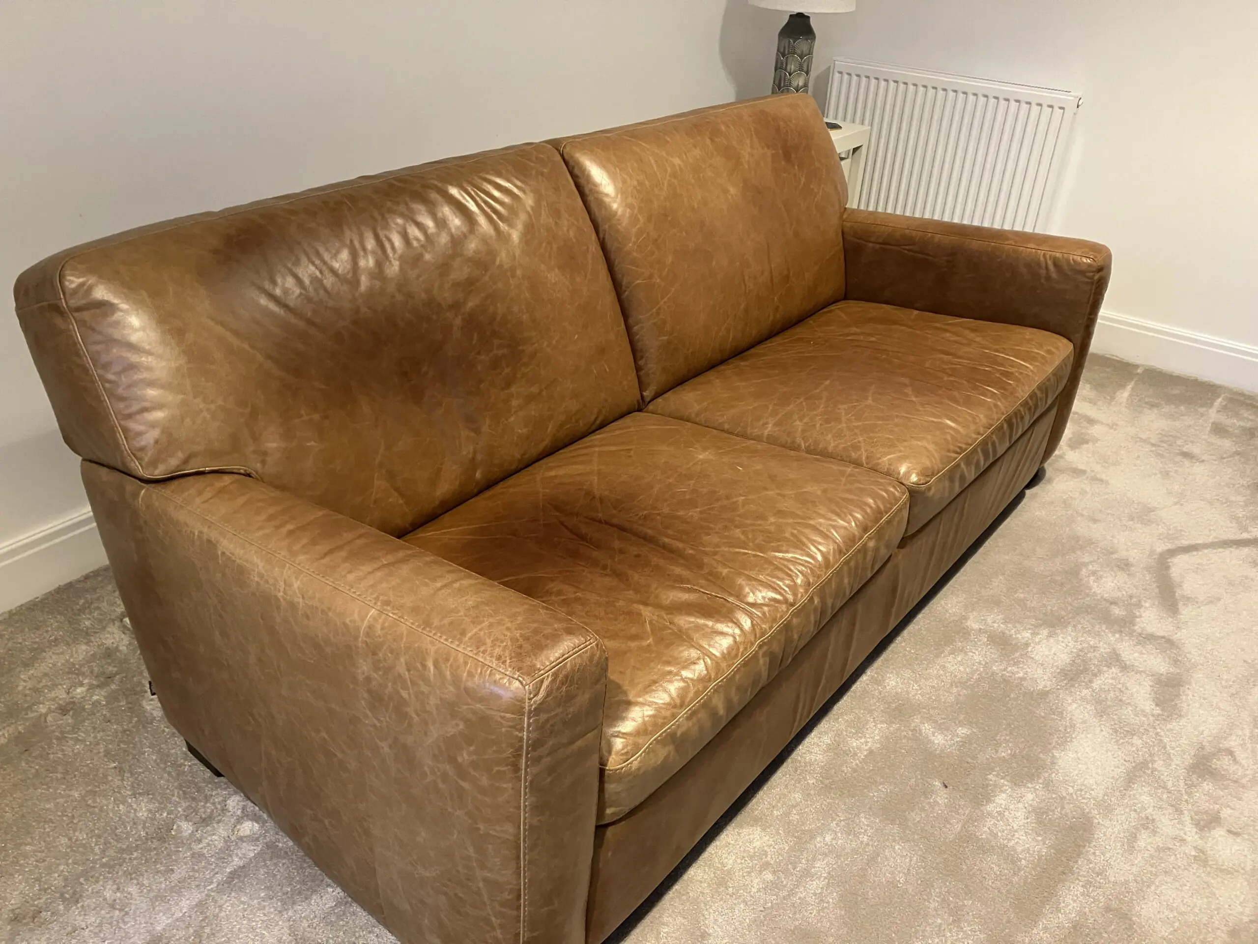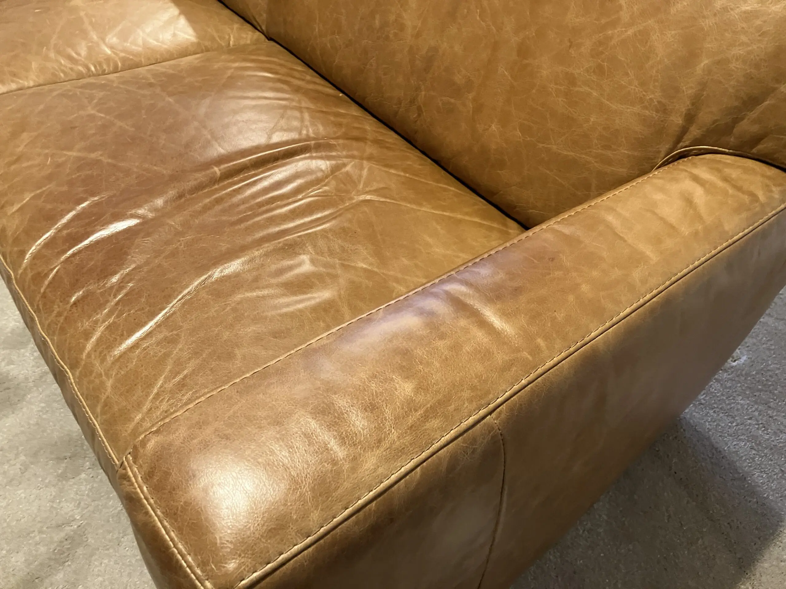 Leather natural Antiquing marks to the seat and back of sofa, but otherwise good condition.