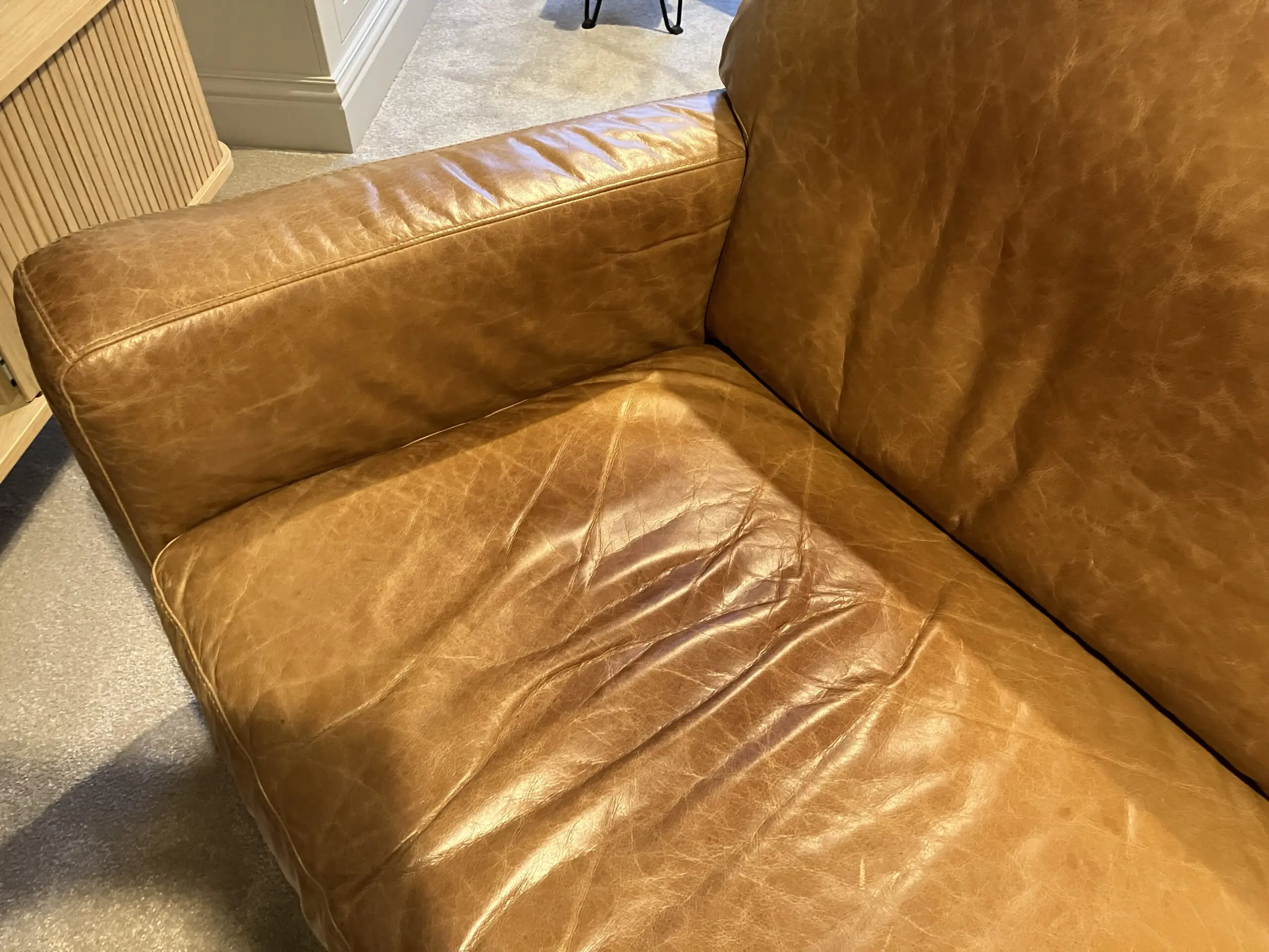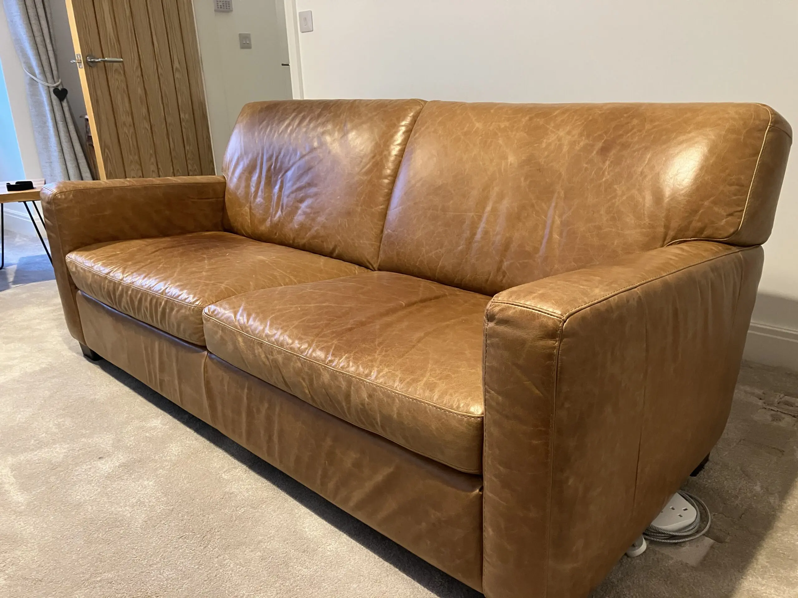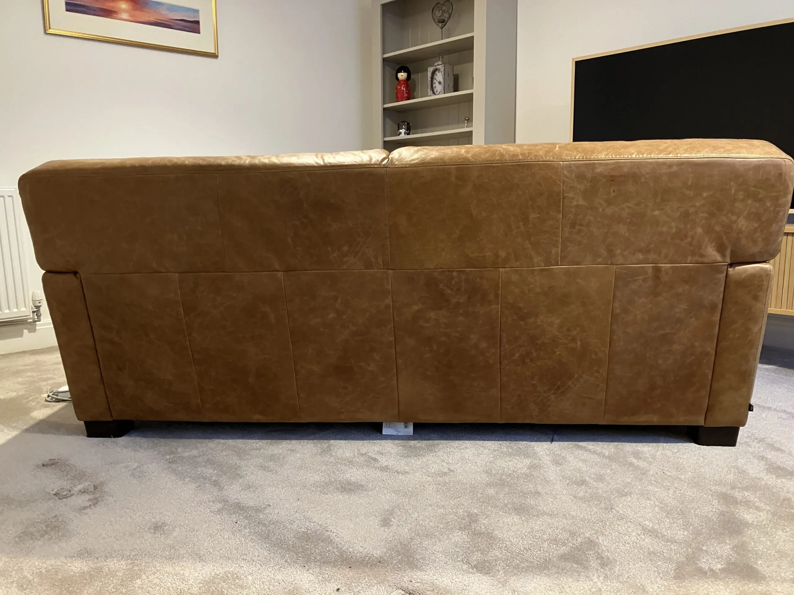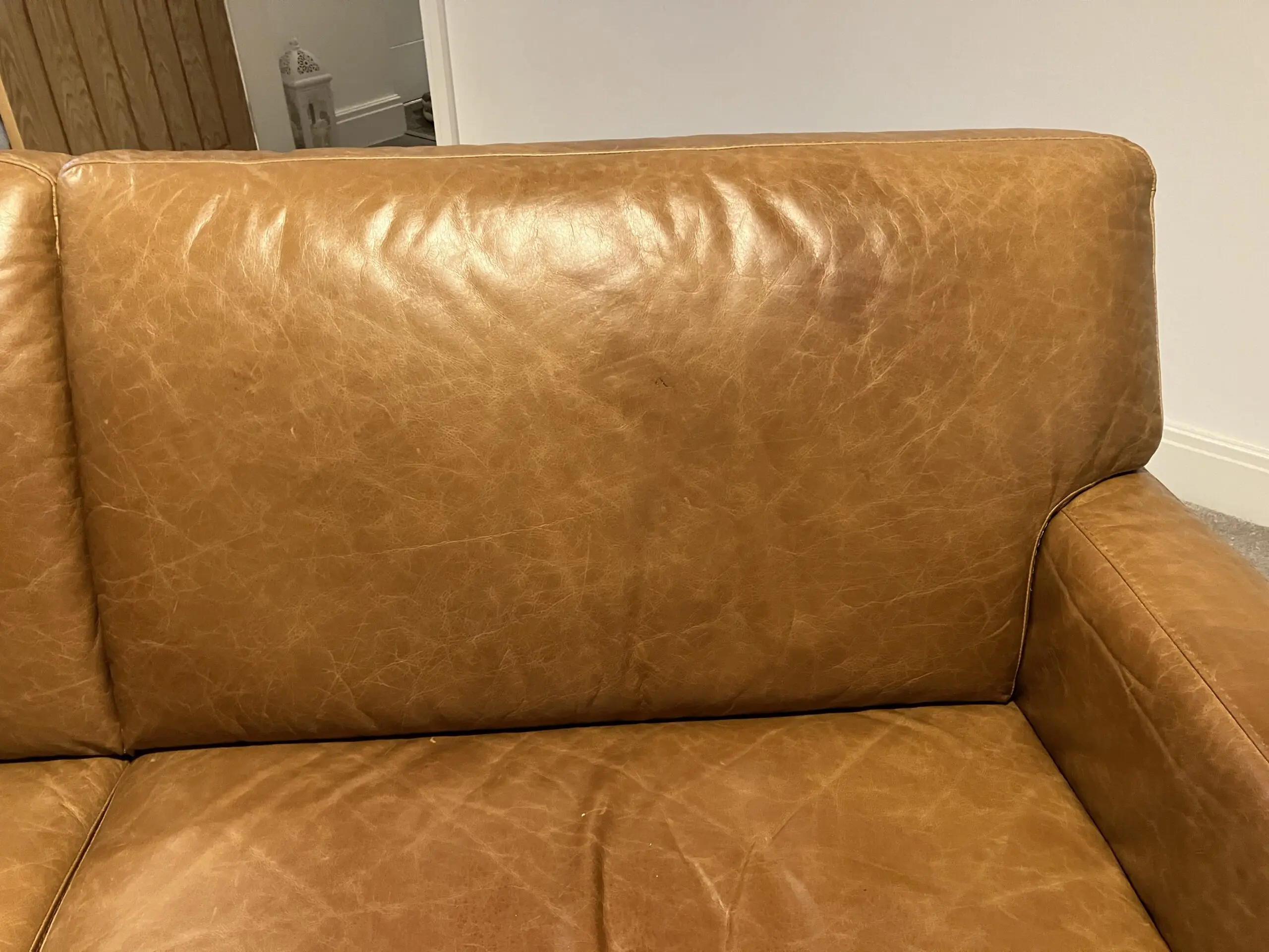 Leather natural Antiquing marks to the seat and back of sofa, but otherwise good condition.