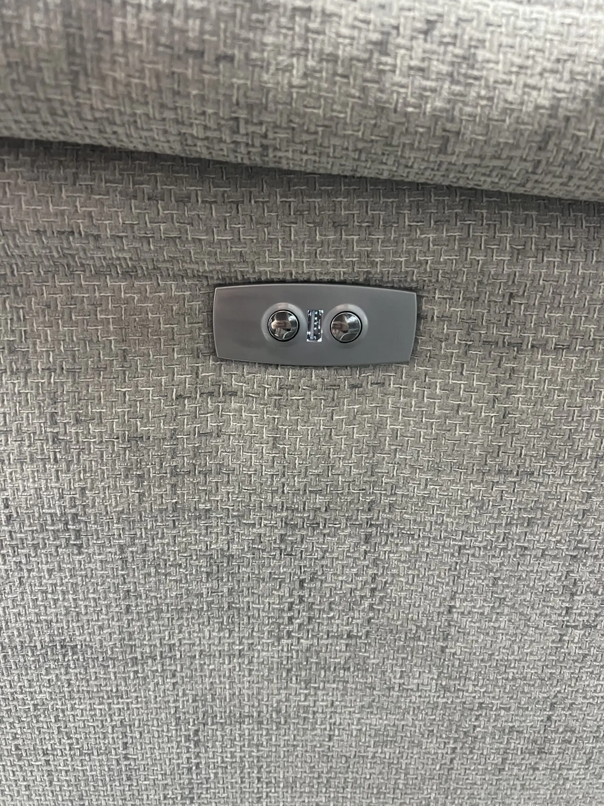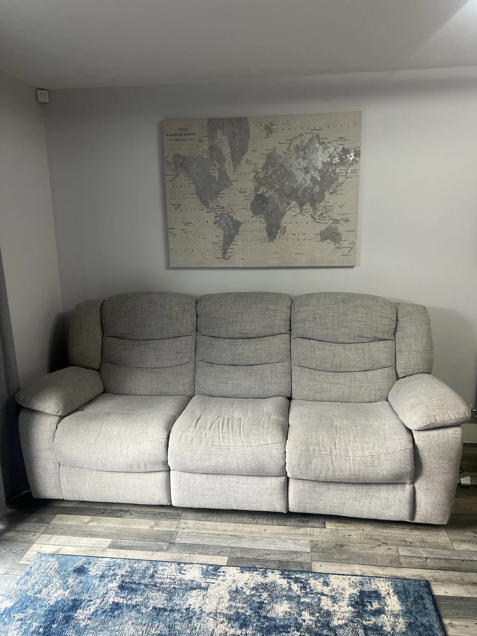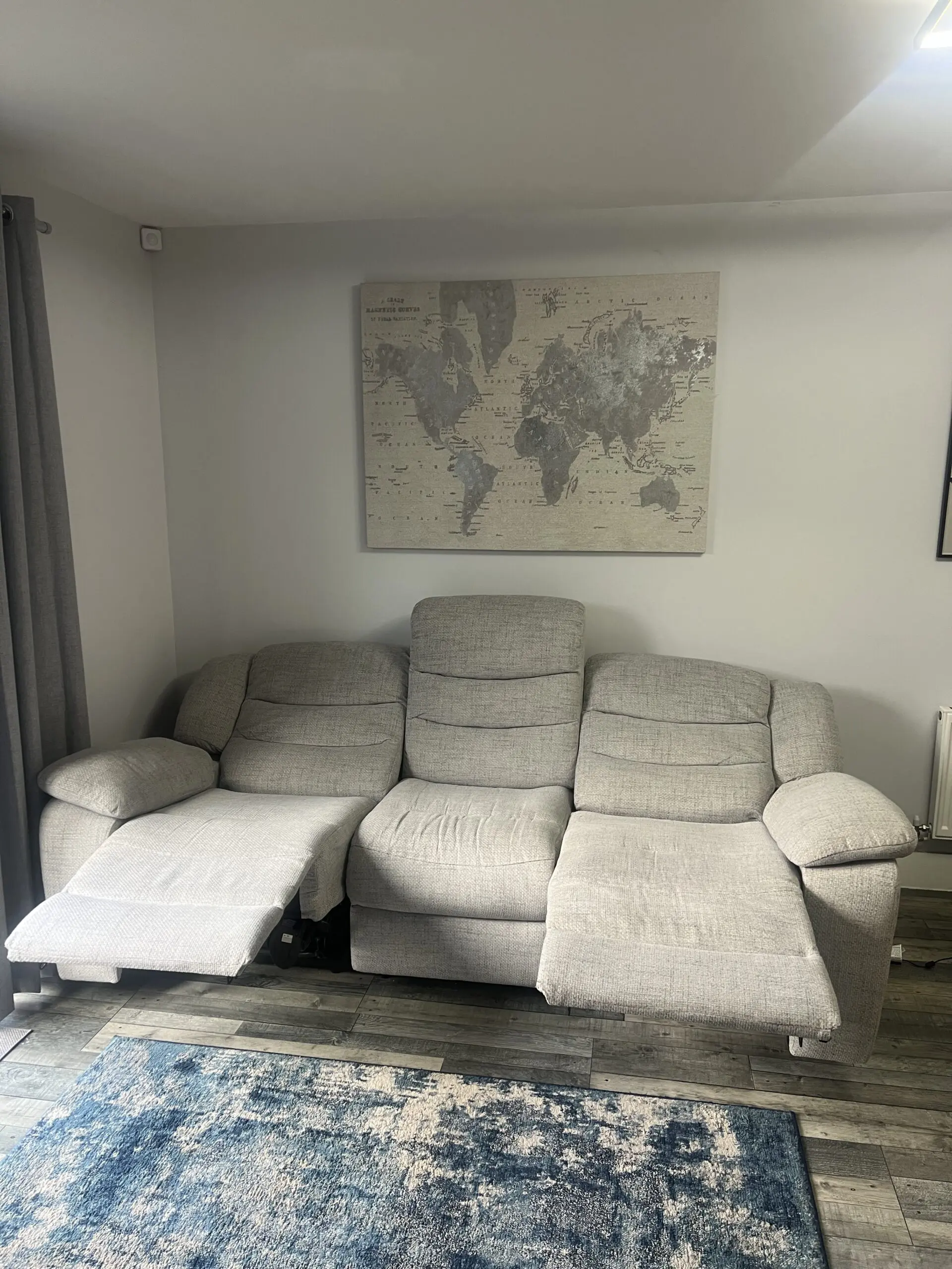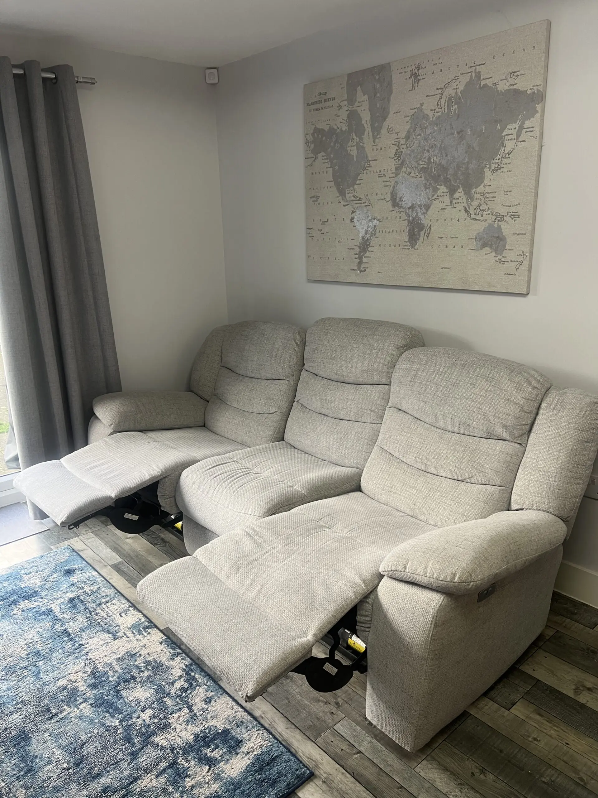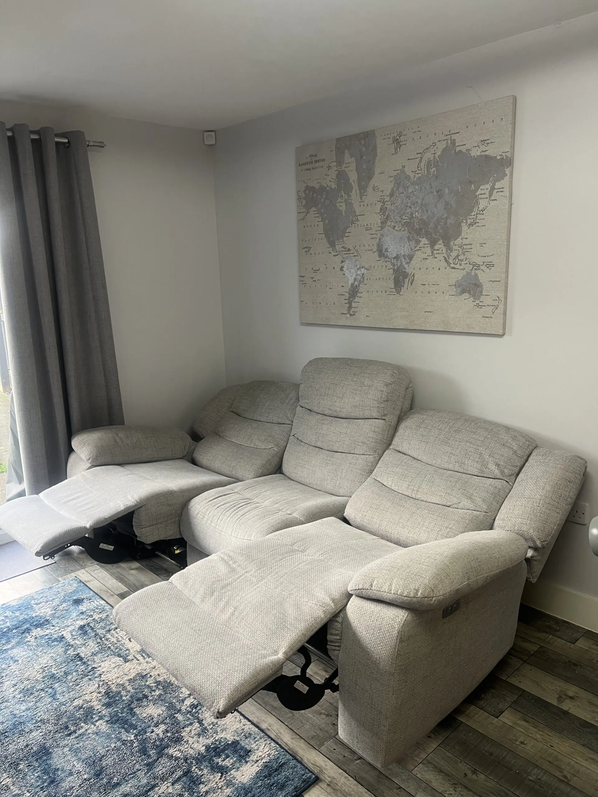 Owned for 2 and a half years and still in great condition. Close up shown of colour. Photo shown of small defect but recliner in full working order. USB port on each side with buttons. Very comfortable sofa.