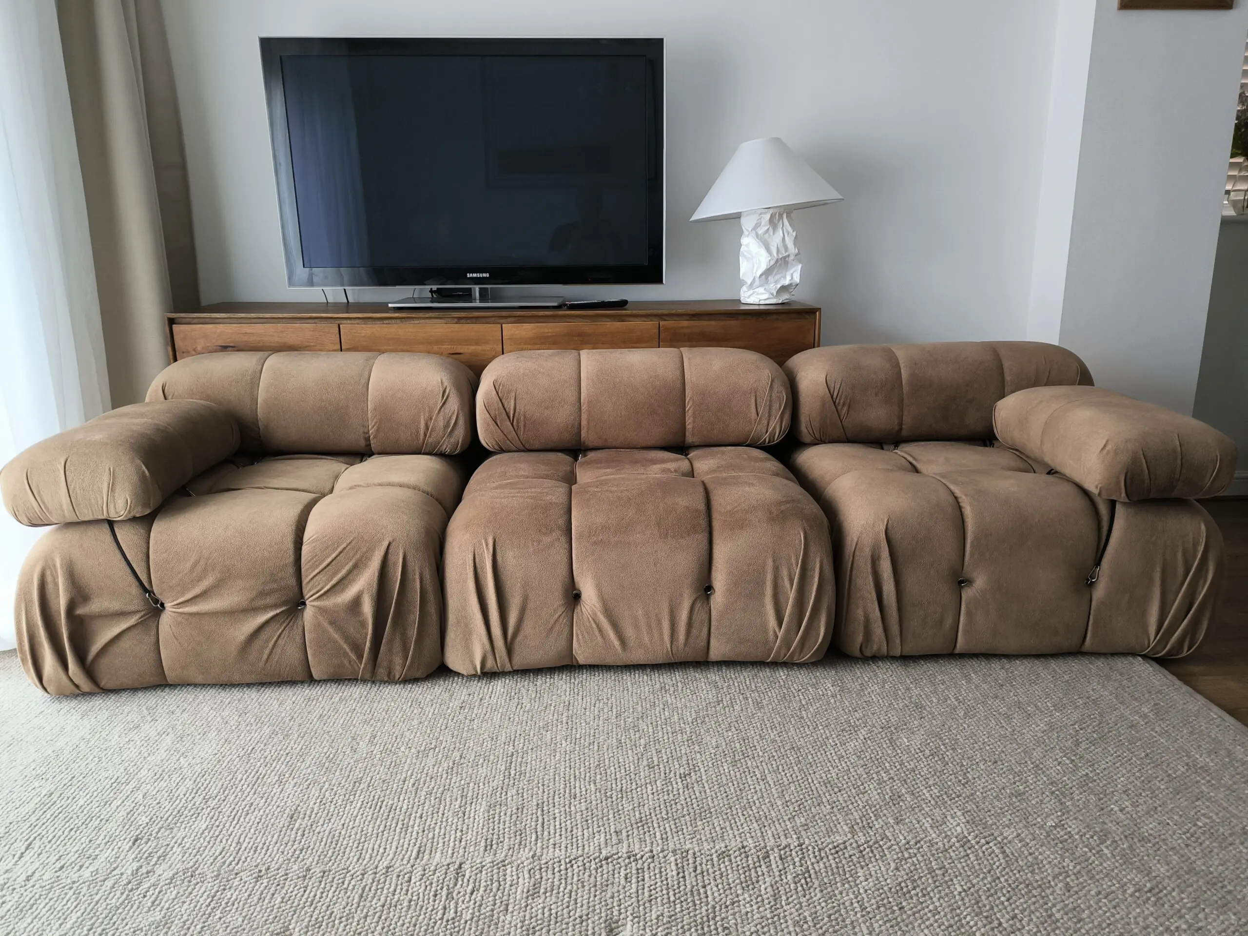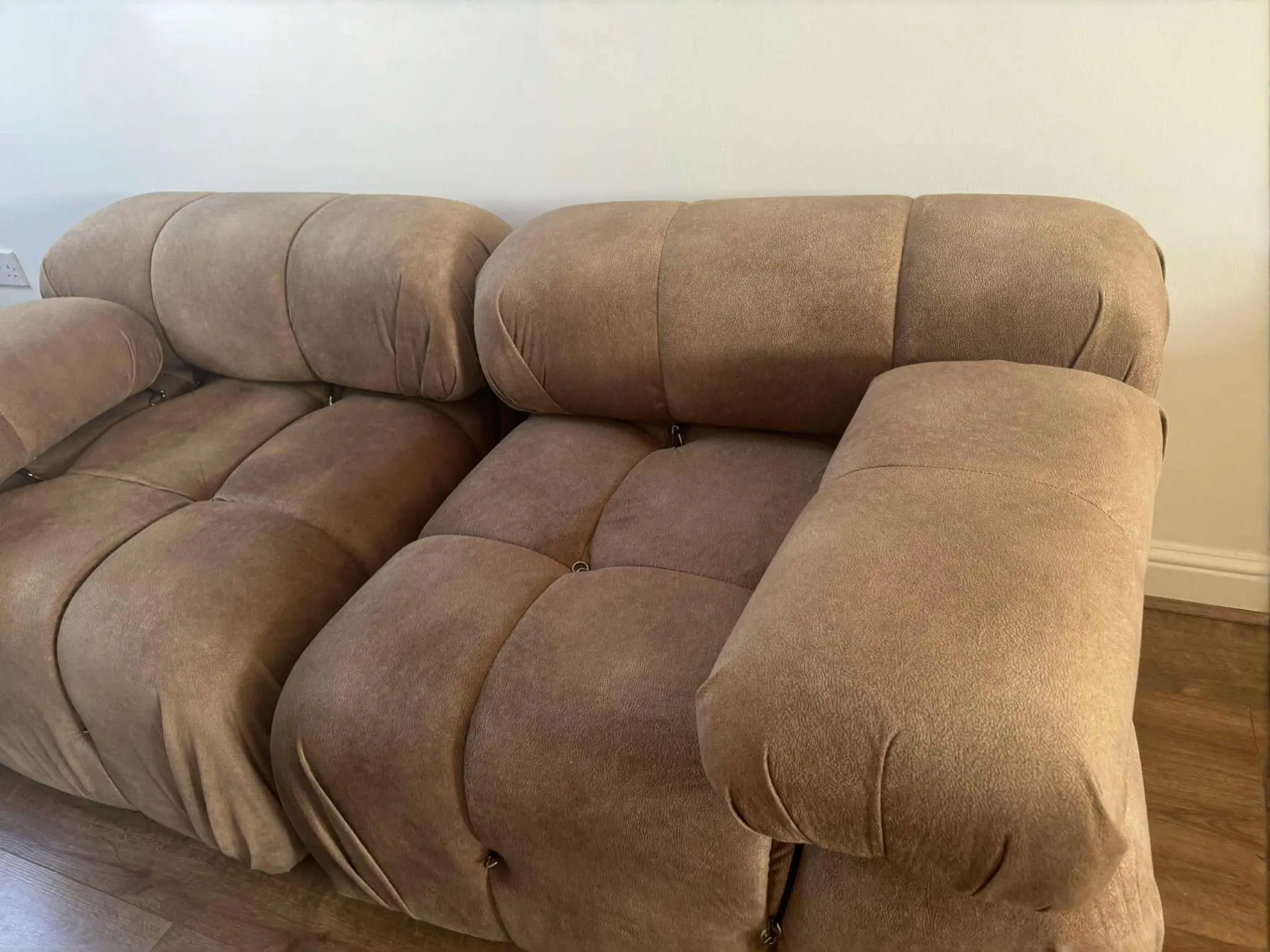 Selling our Storm Arizona latte leather /velvet look fabric 3-seater sofa, inspired by the iconic Camaleonda design by Mario Bellini. This beautiful piece was purchased brand new just two weeks ago from OpaLiving and is in immaculate condition – used only a few times.