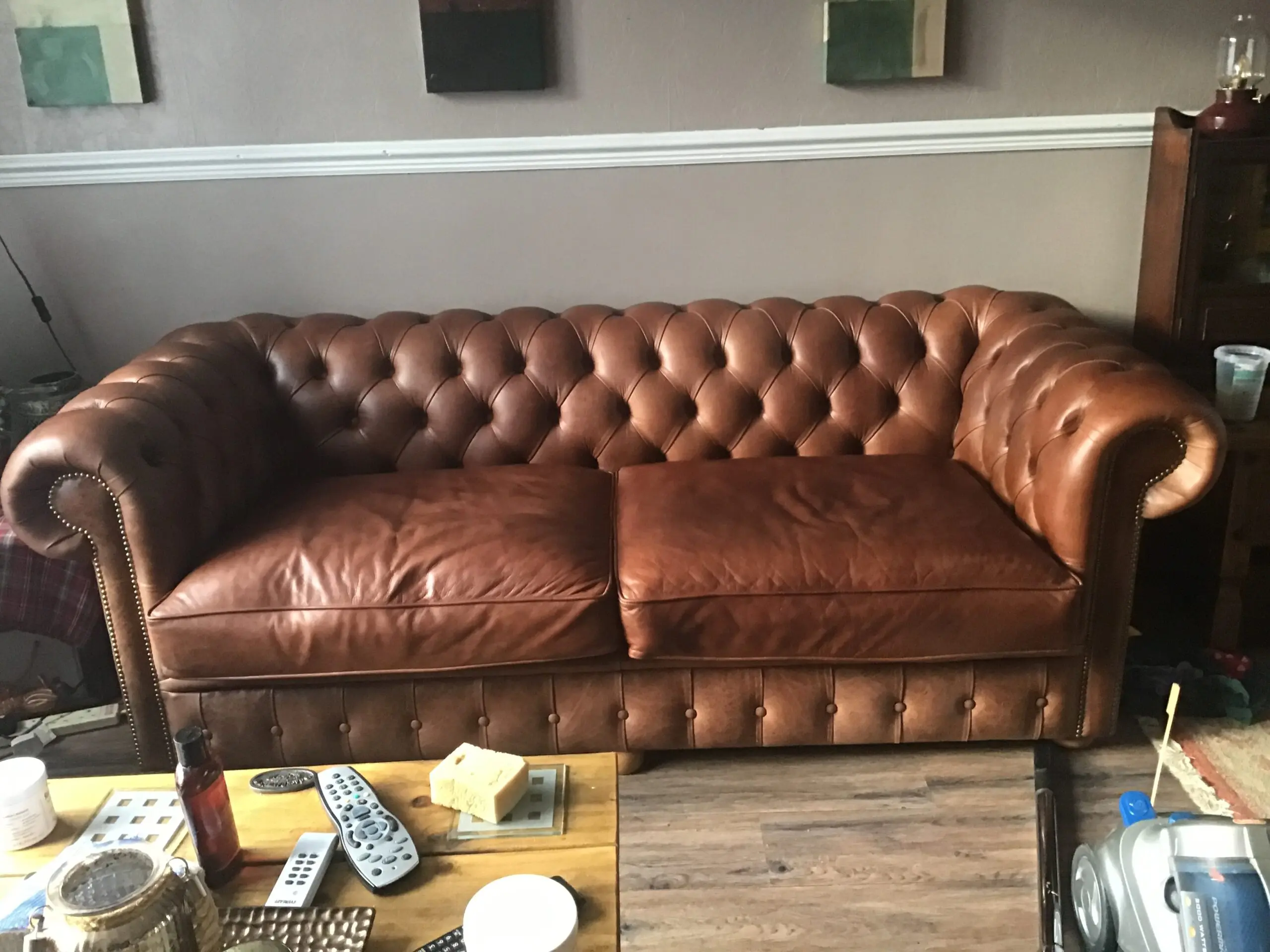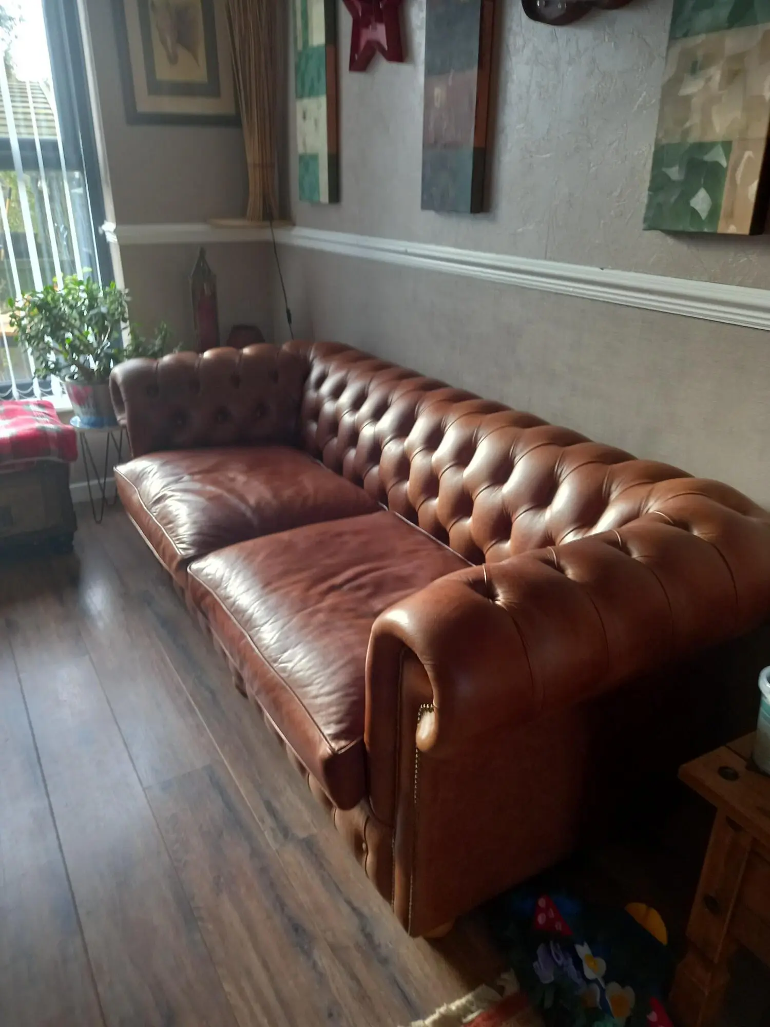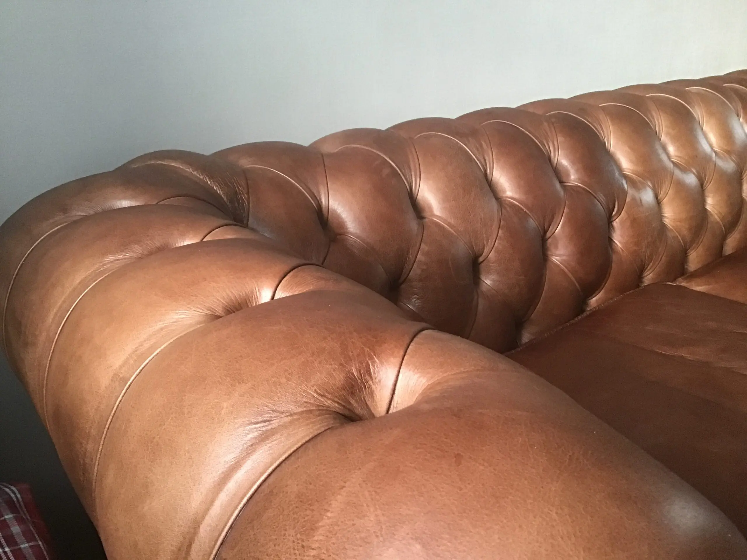 Made by Chesterfield Sofa Company, who make handmade bespoke Chesterfields in small workshop in Greater Manchester. Each sofa is built to last by skilled tradesmen, and they supply places like MOD & other high class establishments. The sofa is full aniline half grain English leather in the colour Marrone. The frame is Beechwood and guaranteed 25 years from new. The feet are light oak and the studs are oxidised bronze. The sofa is in excellent condition, the back and sides are the same as when it was delivered, the seat cushions have light wear. This sofa is an investment piece and is very beautiful to look at. The seat cushions are firm, in order to keep their shape, but can easily be re stuffed with softer cushions if required as they are zipped at the back.