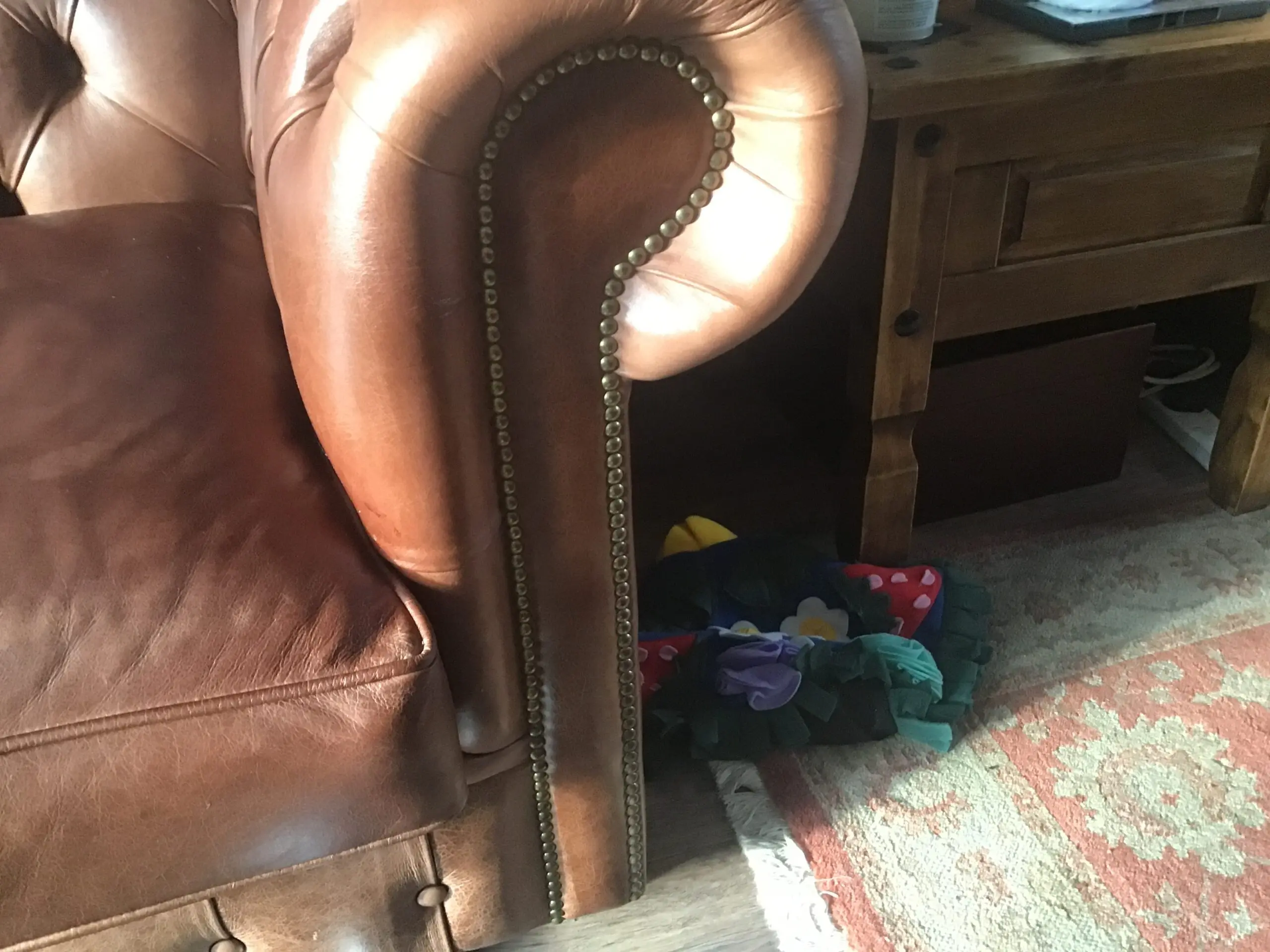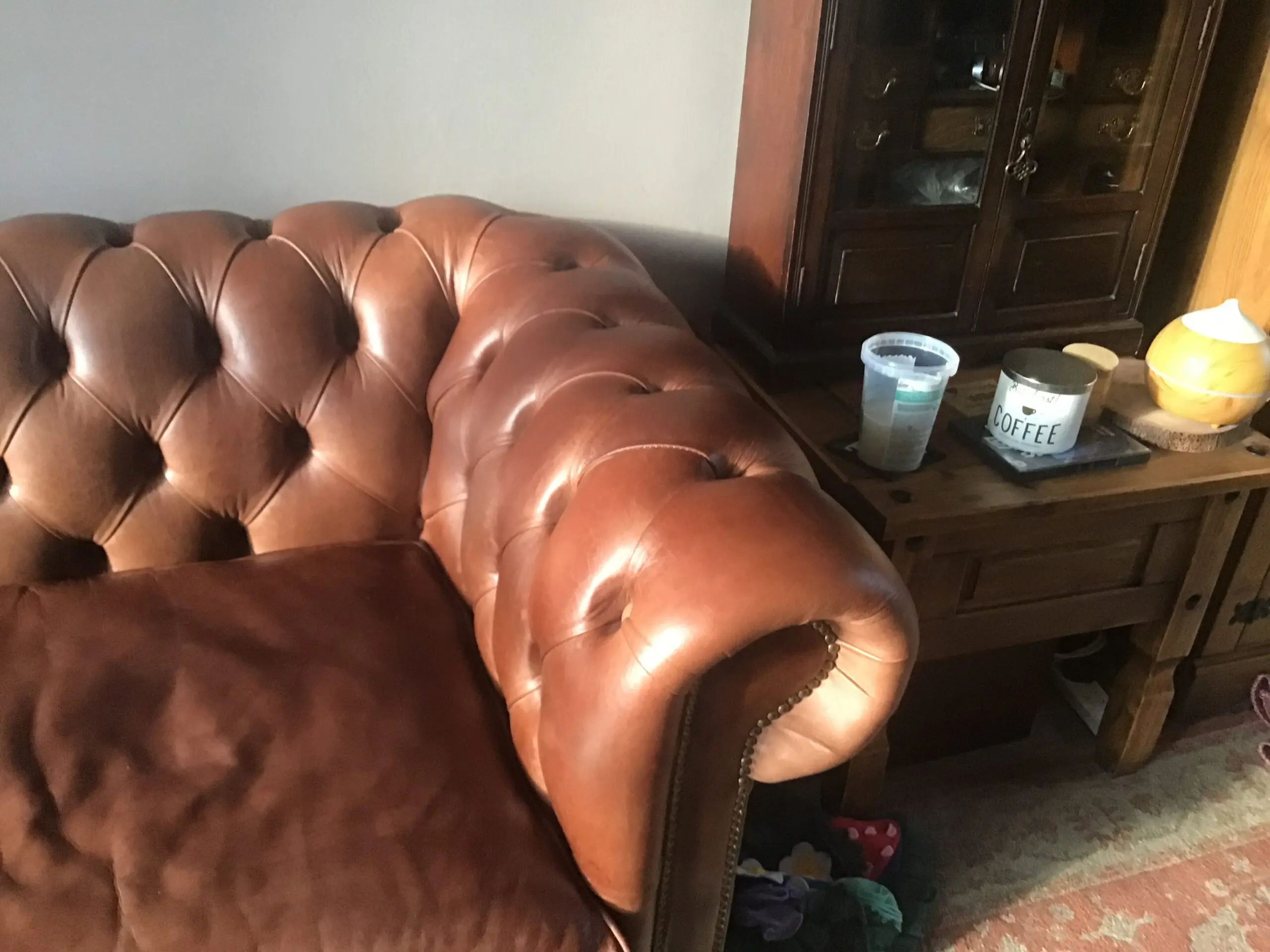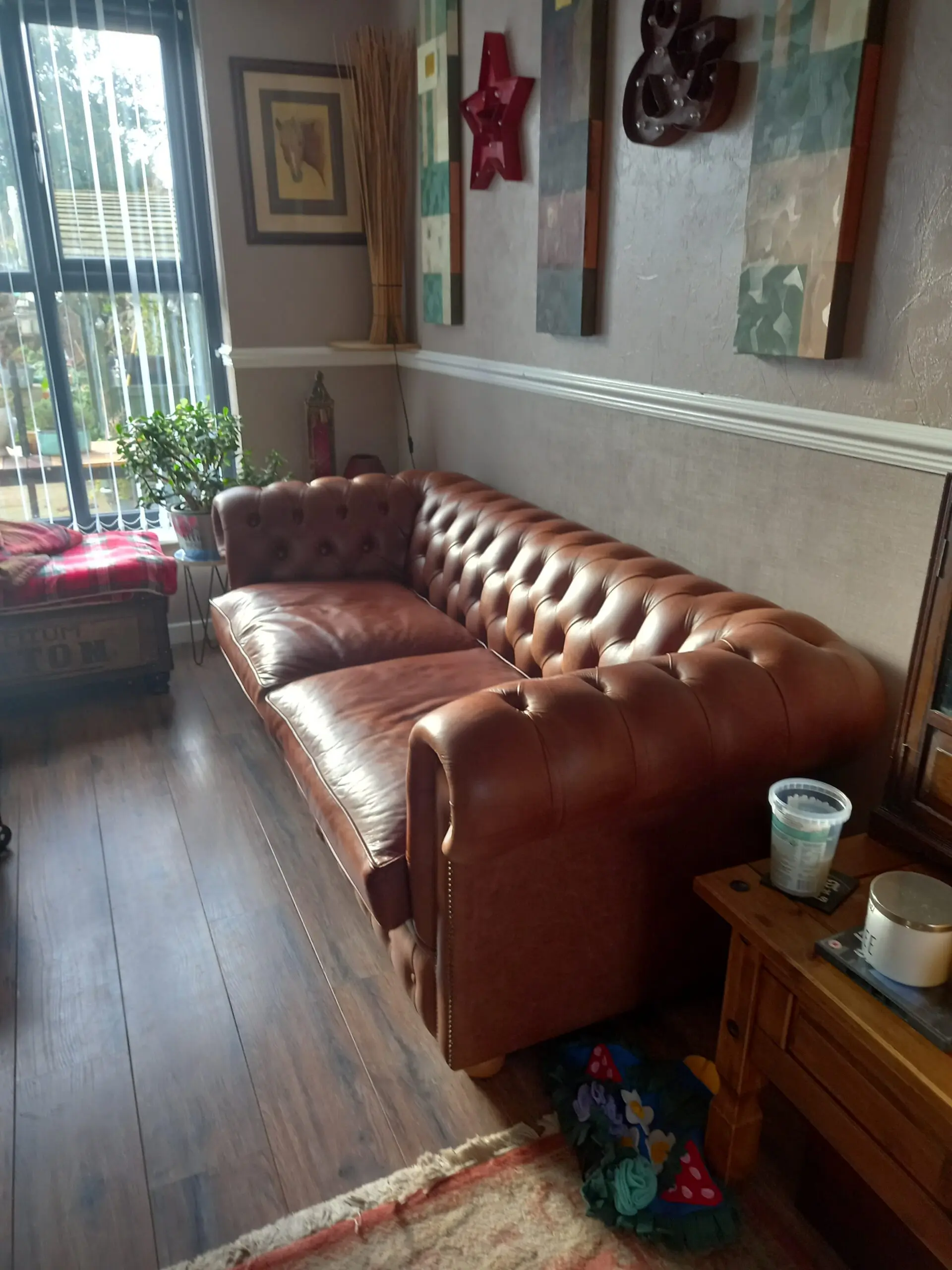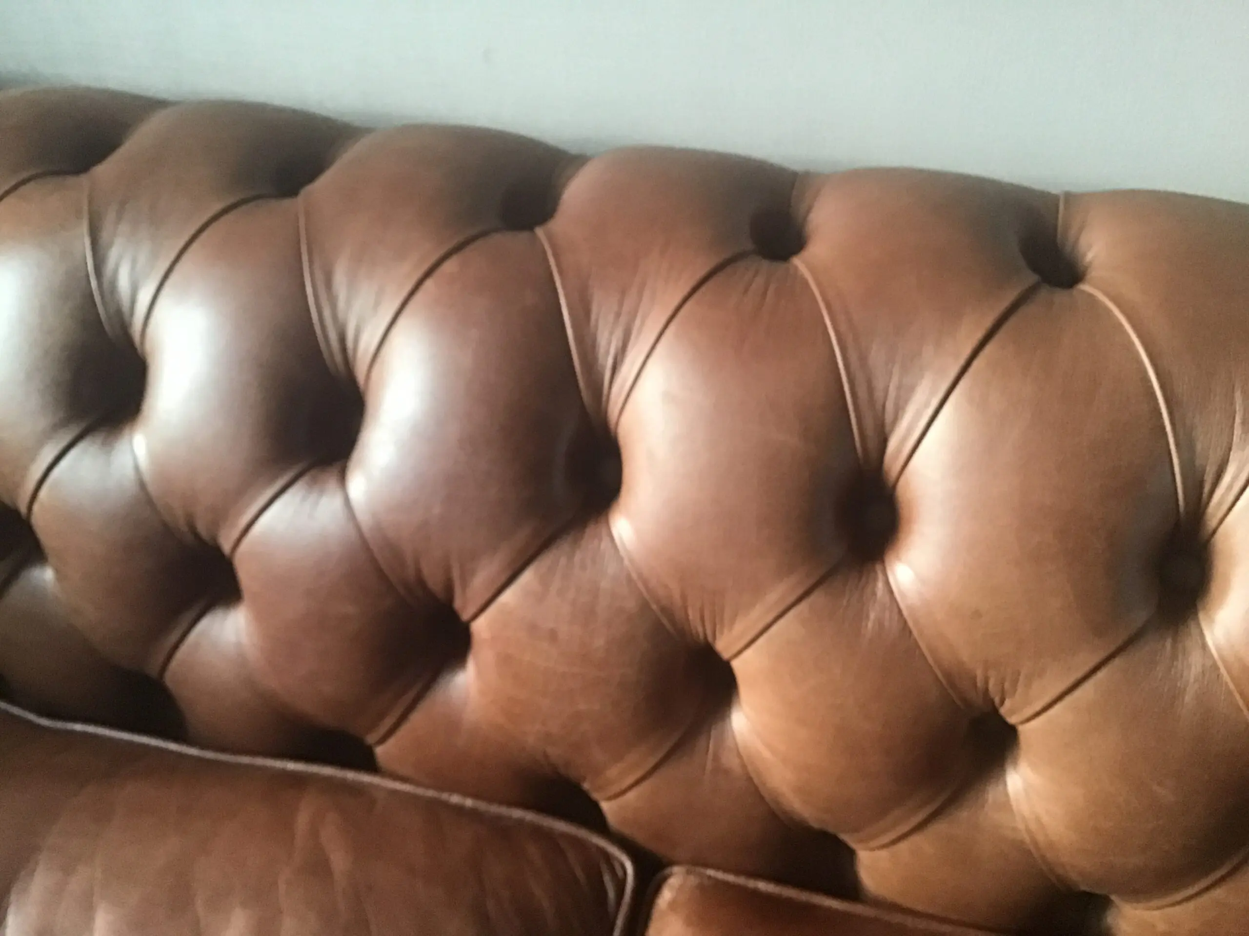 Made by Chesterfield Sofa Company, who make handmade bespoke Chesterfields in small workshop in Greater Manchester. Each sofa is built to last by skilled tradesmen, and they supply places like MOD & other high class establishments. The sofa is full aniline half grain English leather in the colour Marrone. The frame is Beechwood and guaranteed 25 years from new. The feet are light oak and the studs are oxidised bronze. The sofa is in excellent condition, the back and sides are the same as when it was delivered, the seat cushions have light wear. This sofa is an investment piece and is very beautiful to look at. The seat cushions are firm, in order to keep their shape, but can easily be re stuffed with softer cushions if required as they are zipped at the back.