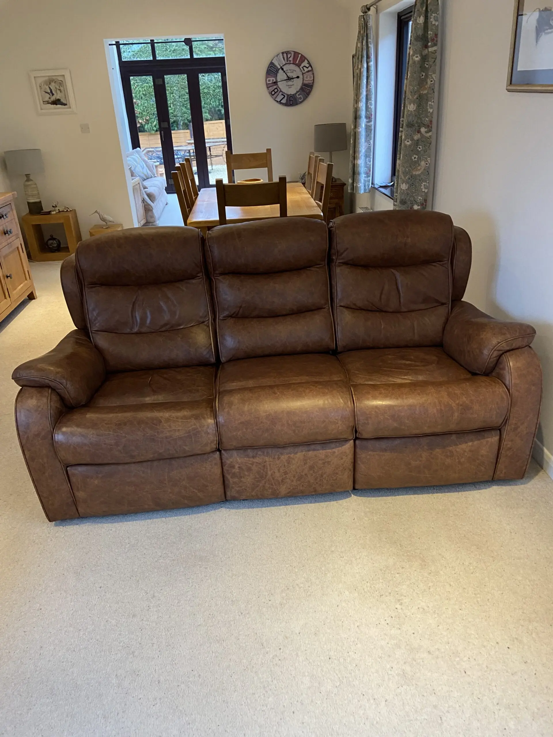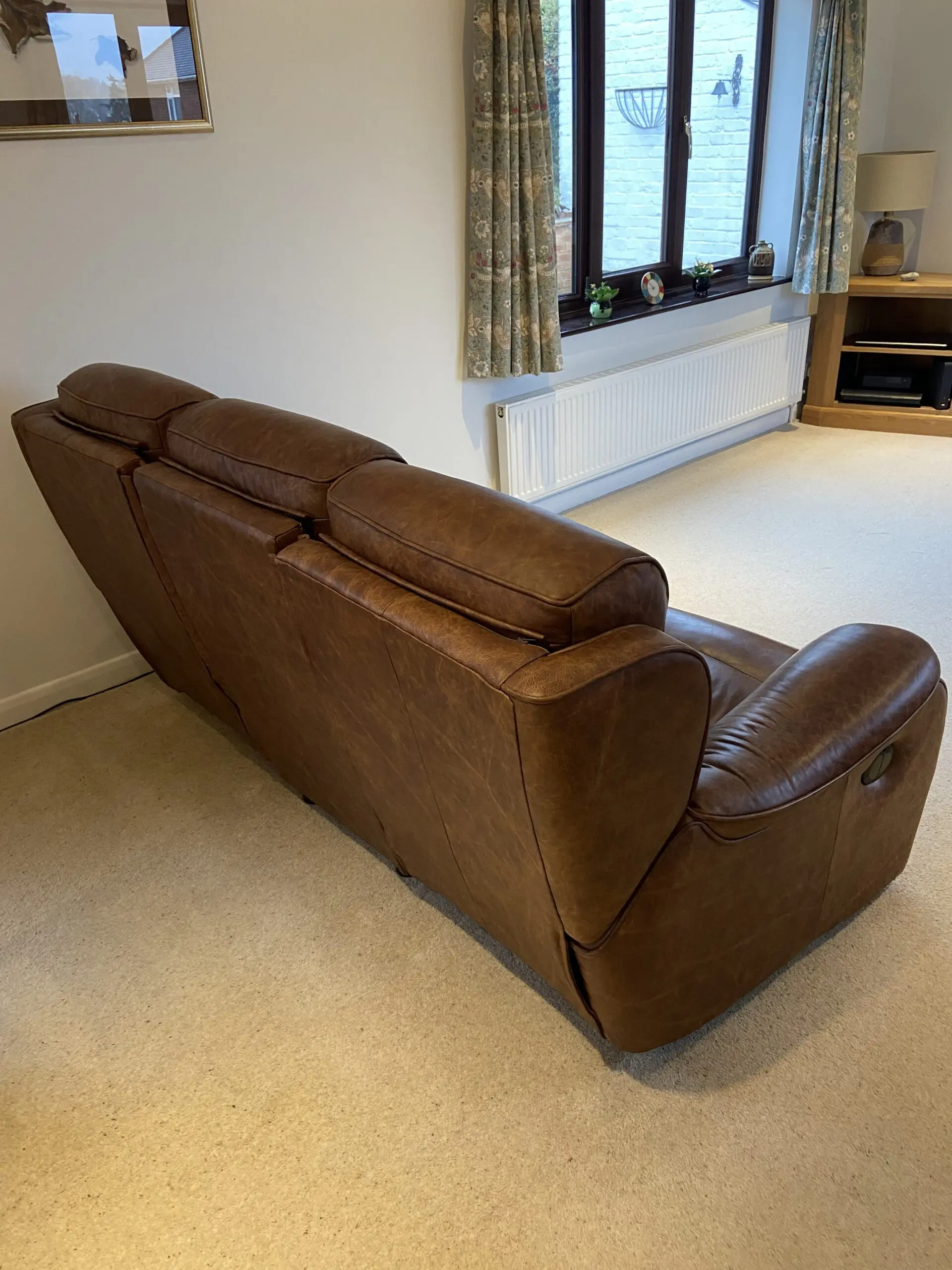 Parker Knoll 3 piece brown leather suite, comprising electric recline sofa and two non reclining chairs.