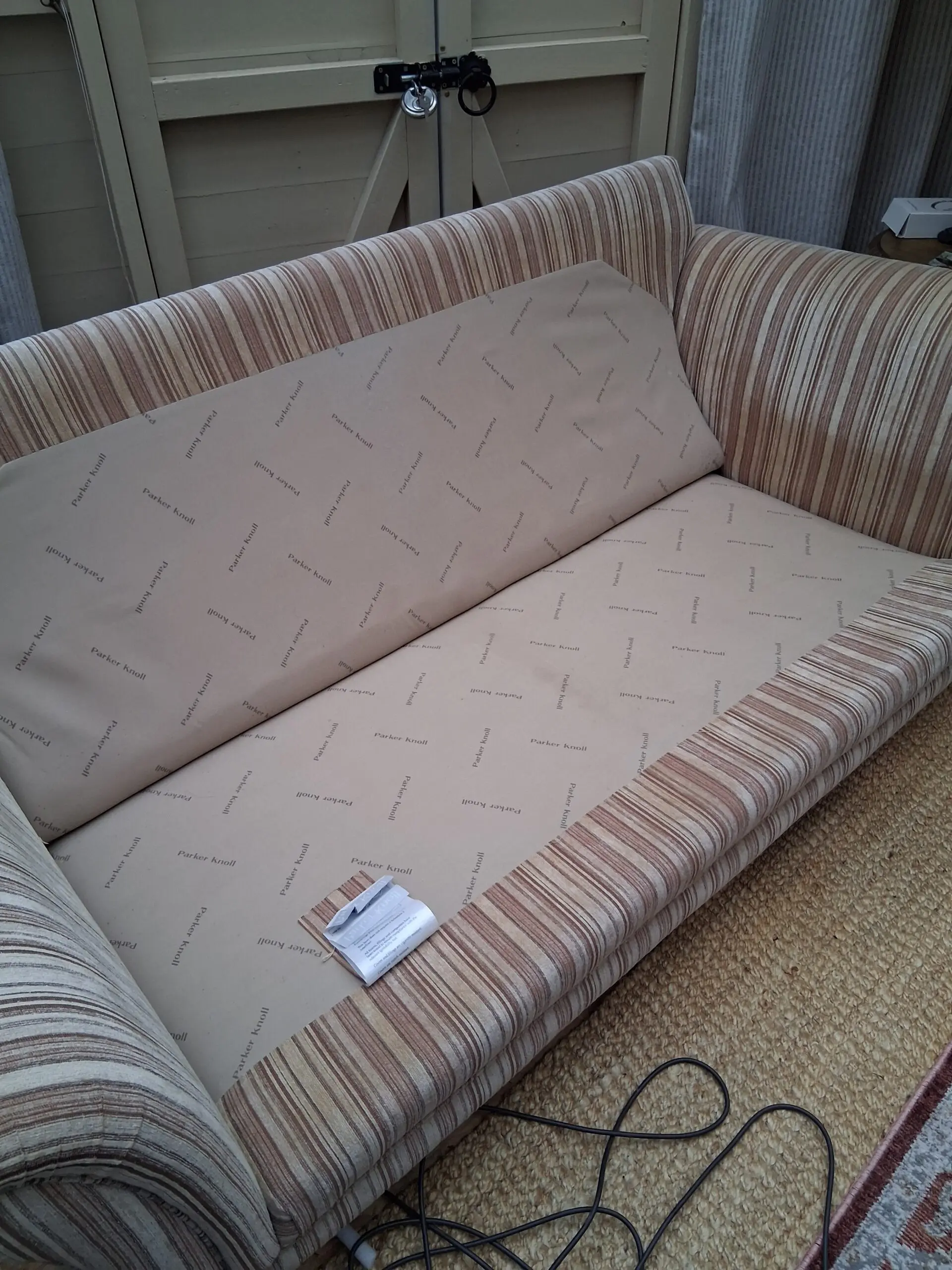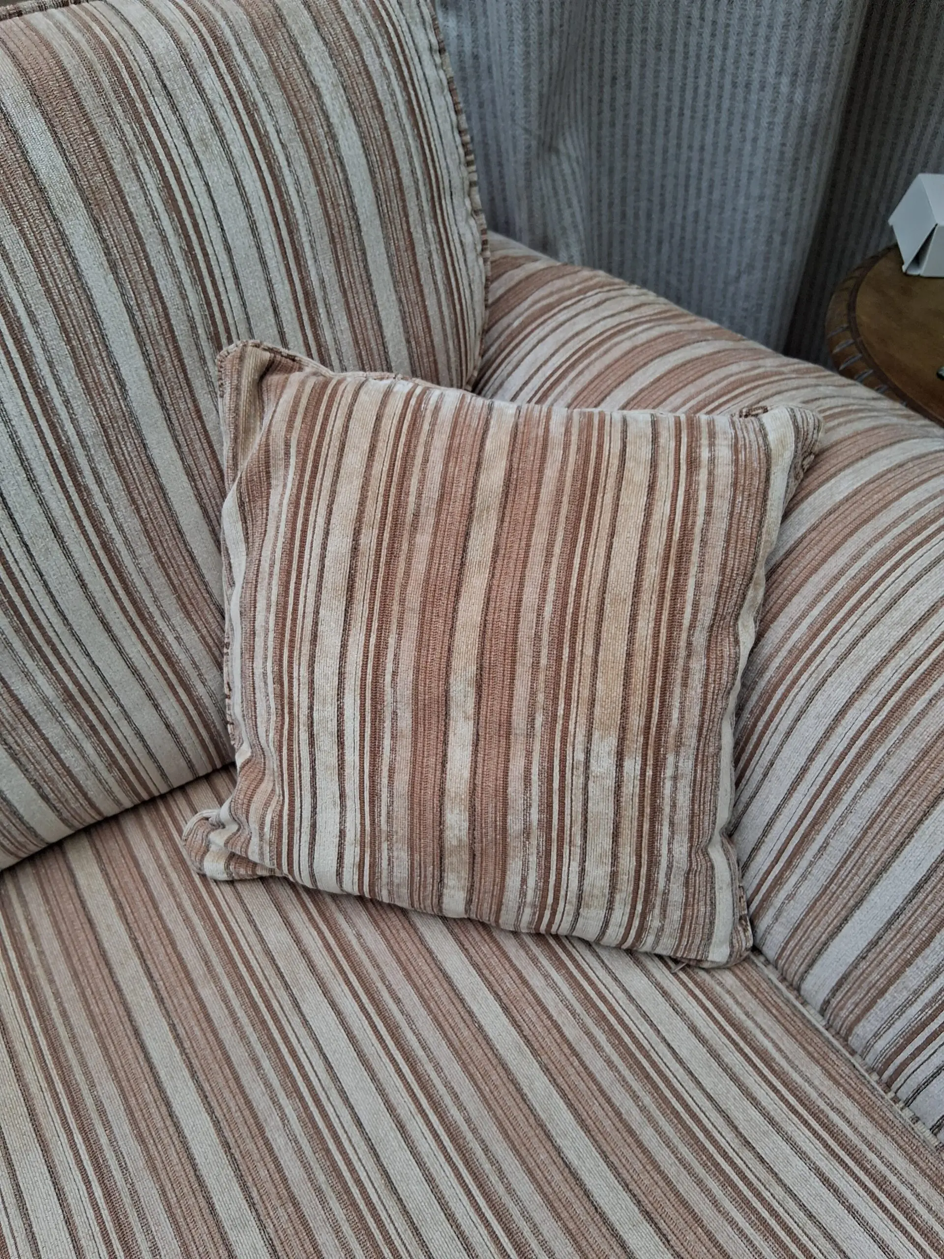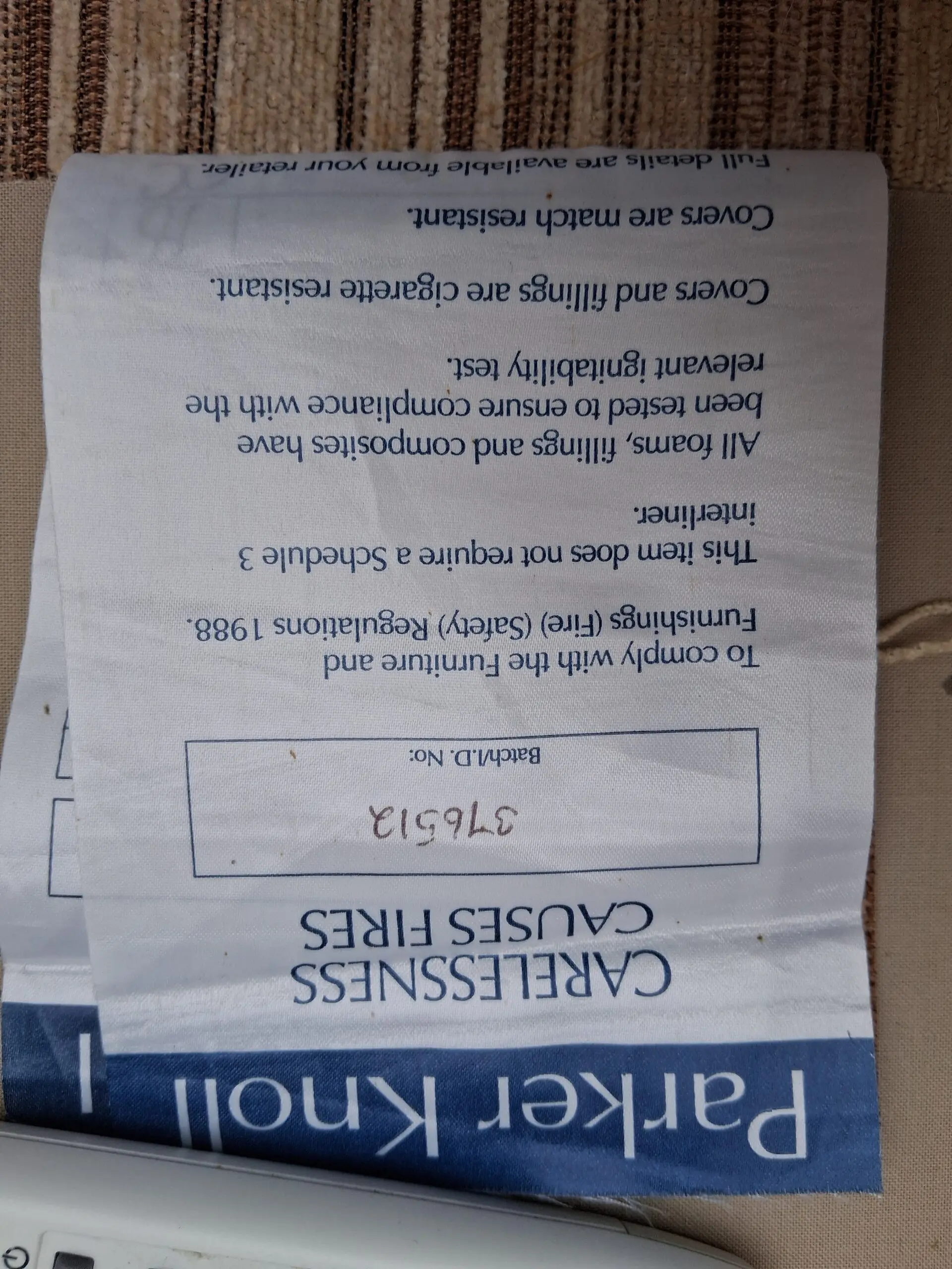 Beautiful parker knoll 3 seater in basley stripe gold, brilliant quality all covers Come off to wash. I Ve washed it a couple of times in excellent condition.bought it a few years ago now, and it still bounces back into place. So comfortable, it’s unbelievable. Selling due to change of décor arms covers, extra as well to protect the arms wooden legs.